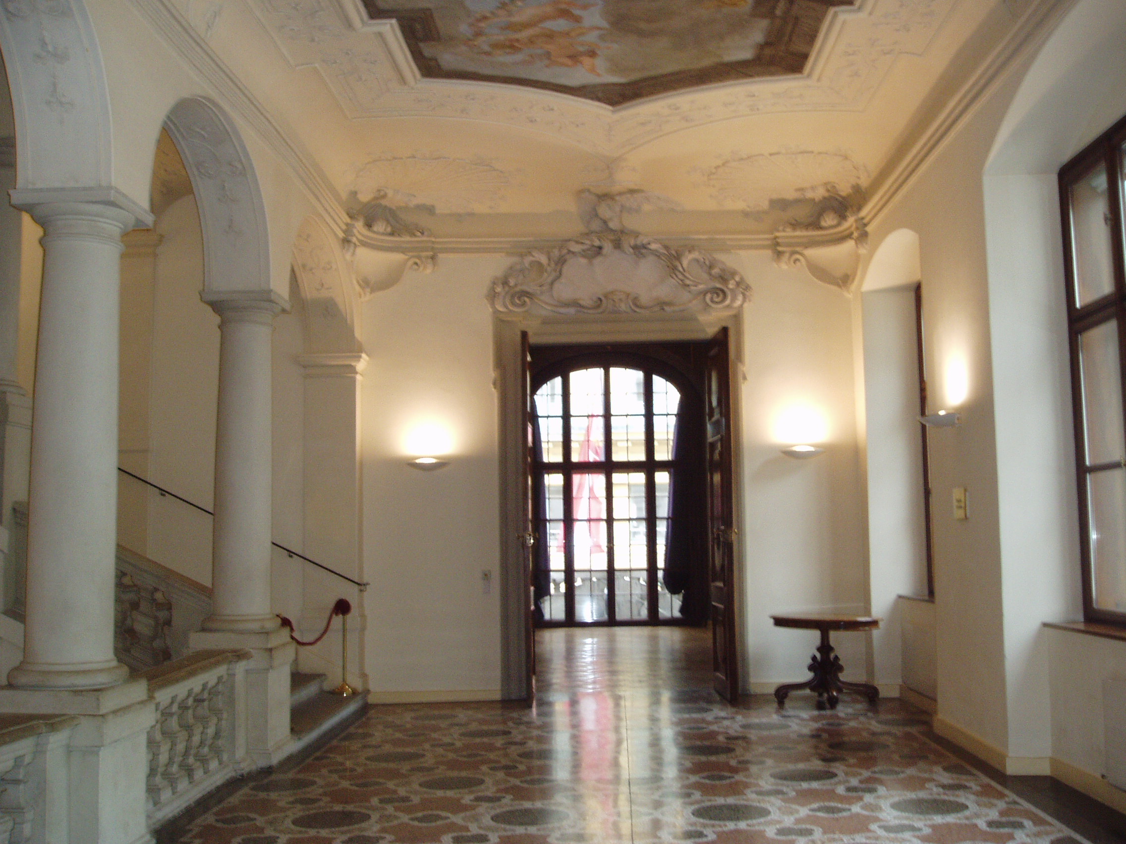 Nyilvános 1787 | 3945 | Augustinerstrasse 2. Lobkowicz-palota | Eredetileg a Dietrichstein grófok számára épült 1685-87 között barokk stílusban, az olasz Giovanni Pietro Tencala építőmester tervei szerint. A Lobkowitz hercegek kívánságára a főhomlokzatot Johann Bernard Fischer von Erlach alakította át 1709-11 között. A palota dísztermét Eroica-teremnek is nevezik, mert 1805. január 3-án Beethoven itt mutatta be III. (Eroica) szimfóniáját. E palotához fűződik az az anekdota, hogy – ugyancsak 1805-ben – Fidelio című operája első változata körüli vitában Beethoven feldühödve hagyta ott a tiszteletére összegyűlt főúri társaságot, s még visszakiabált az utcáról: „Lobkowitz szamár!” Ám a kapcsolatnak ez a dühkitörés nem vetett véget, a zenekedvelő, saját szimfonikus zenekarral rendelkező herceg továbbra is Beethoven mecénása maradt. 1807-ben ugyanitt rendezték meg Beethoven IV. szimfóniájának az ősbemutatóját is. A képen az Eroica-terem bejárata előtti előcsarnok látható, a szemben levő ajtó vezet a terembe (a freskókkal ékesített zeneteremben nem lehet fényképezni). Ebben a palotában tekinthető meg az Osztrák Színháztörténeti Múzeum gyűjteménye is. |
