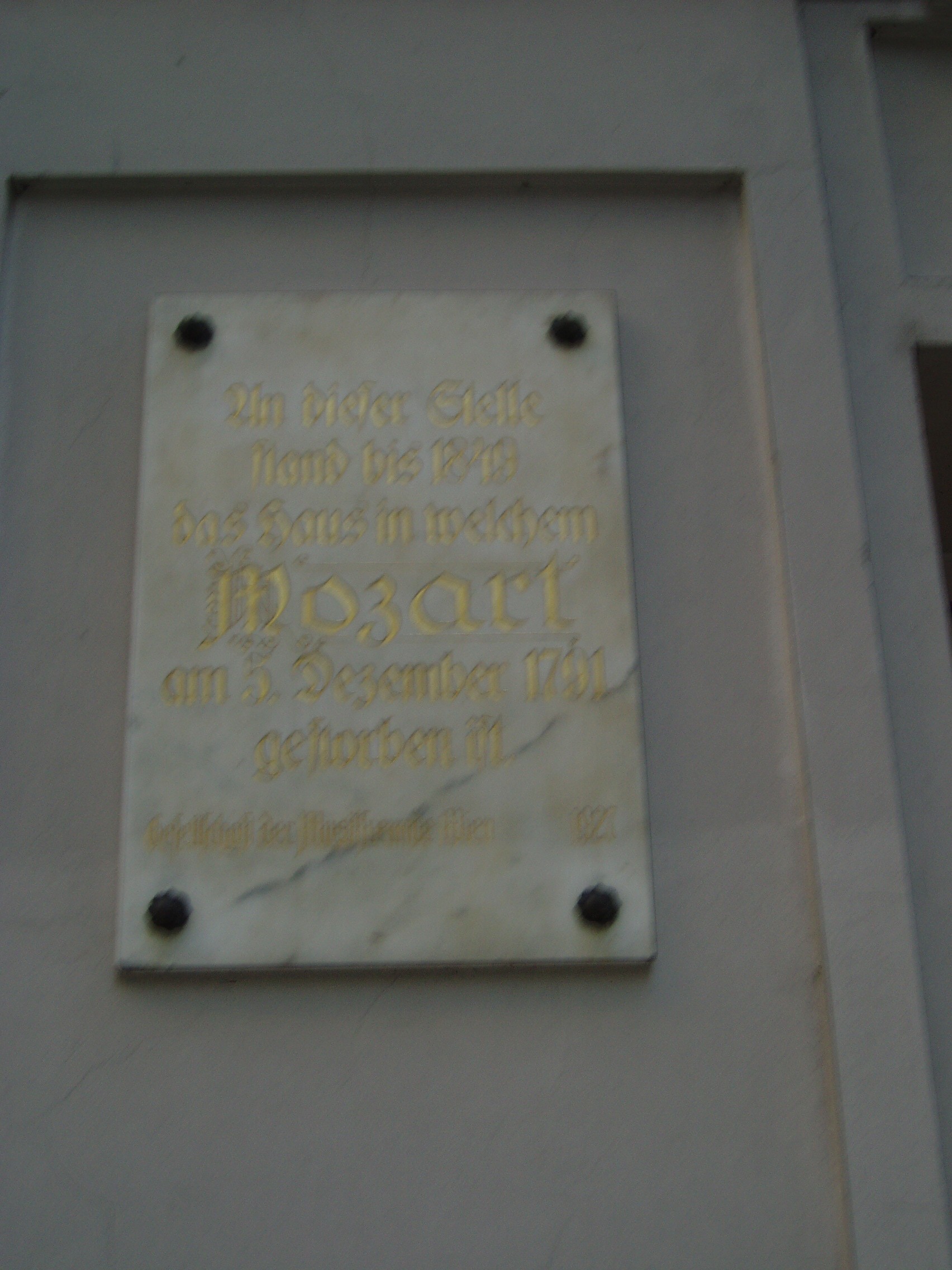 Nyilvános 1064 | 1902 | Rauhensteingasse 8. | A mostani ház helyén korábban állott épületben volt Mozart utolsó lakása. Itt látogatta meg egy titokzatos álarcos, s rekviemet rendelt tőle. Itt dolgozott Varázsfuvola című operáján. Rövid betegség után itt hunyt el 35 éves korában, 1791. december 5-én. Az épületen fehér márványtábla idézi emlékét. |