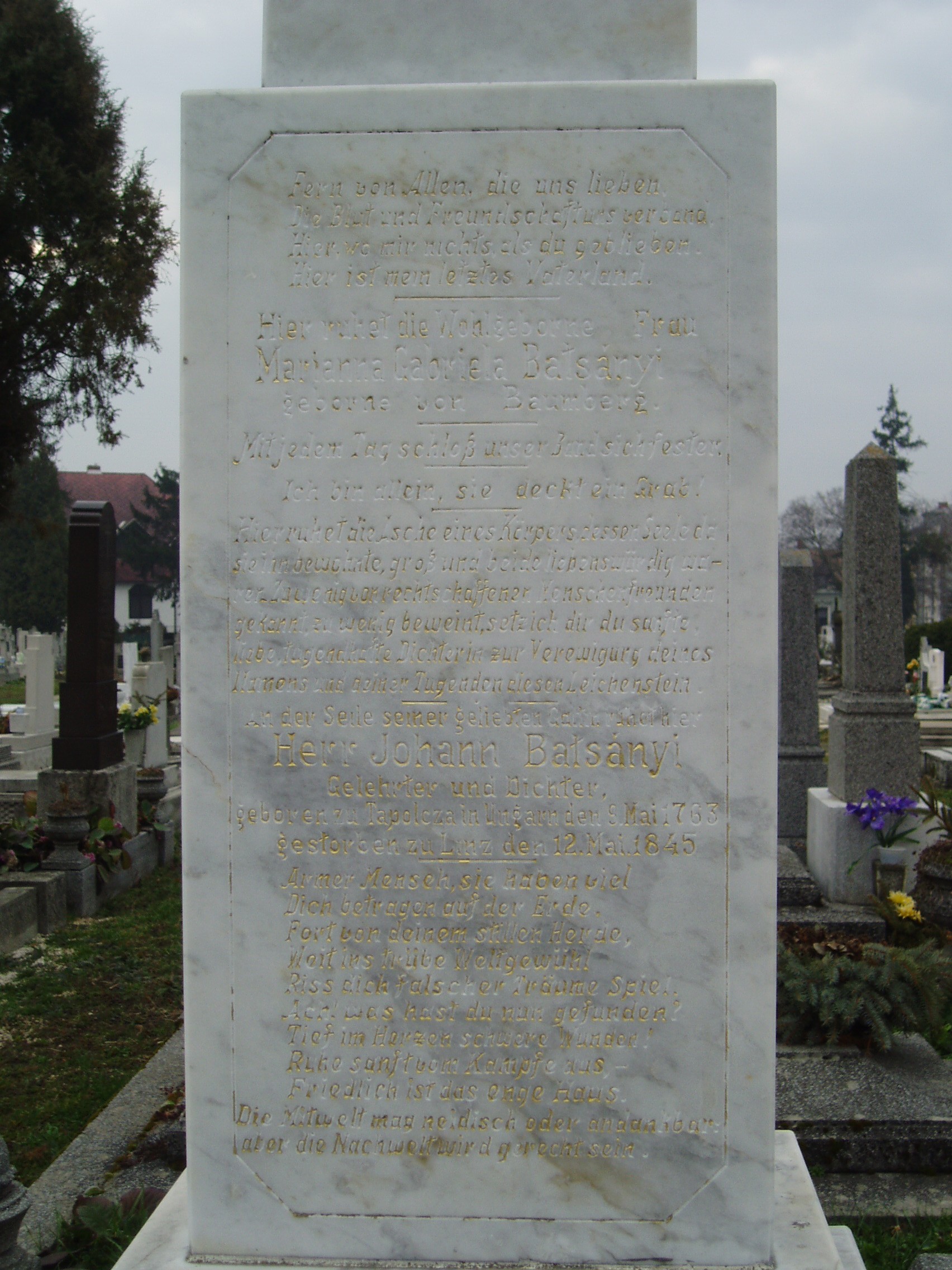 Nyilvános 1218 | 1954 | Tapolca, Régi köztemető: Batsányi János és Baumberg Gabriella sírja | A városközpontból Keszthely felé tartva a Dózsa György út és a Keszthelyi út veszi közre Tapolca régi temetőjét. A kápolnától balra helyezték örök nyugalomra 1934-ben a Linzben 1845-ben elhunyt Batsányi János és felesége hamvait. Eredeti sírkövük, amelyet még Batsányi állíttatott Linzben felesége halála után, 1990-ig állt itteni sírjukon. Romló állapota miatt azóta átvitték a városi múzeumba (lásd: Tapolca, Templom domb 8.), s az eredeti mintájára új sírkövet faragtak. A felvétel 2007 februárjában készült. Felh. irod.: Látnivalók Veszprém megyében. Miskolc, Well-PRess, 2000 Hangodi László: Múltbanéző - kiállításvezető a Tapolcai Városi Múzeum tárlataihoz. Tapolca, 2006 |
