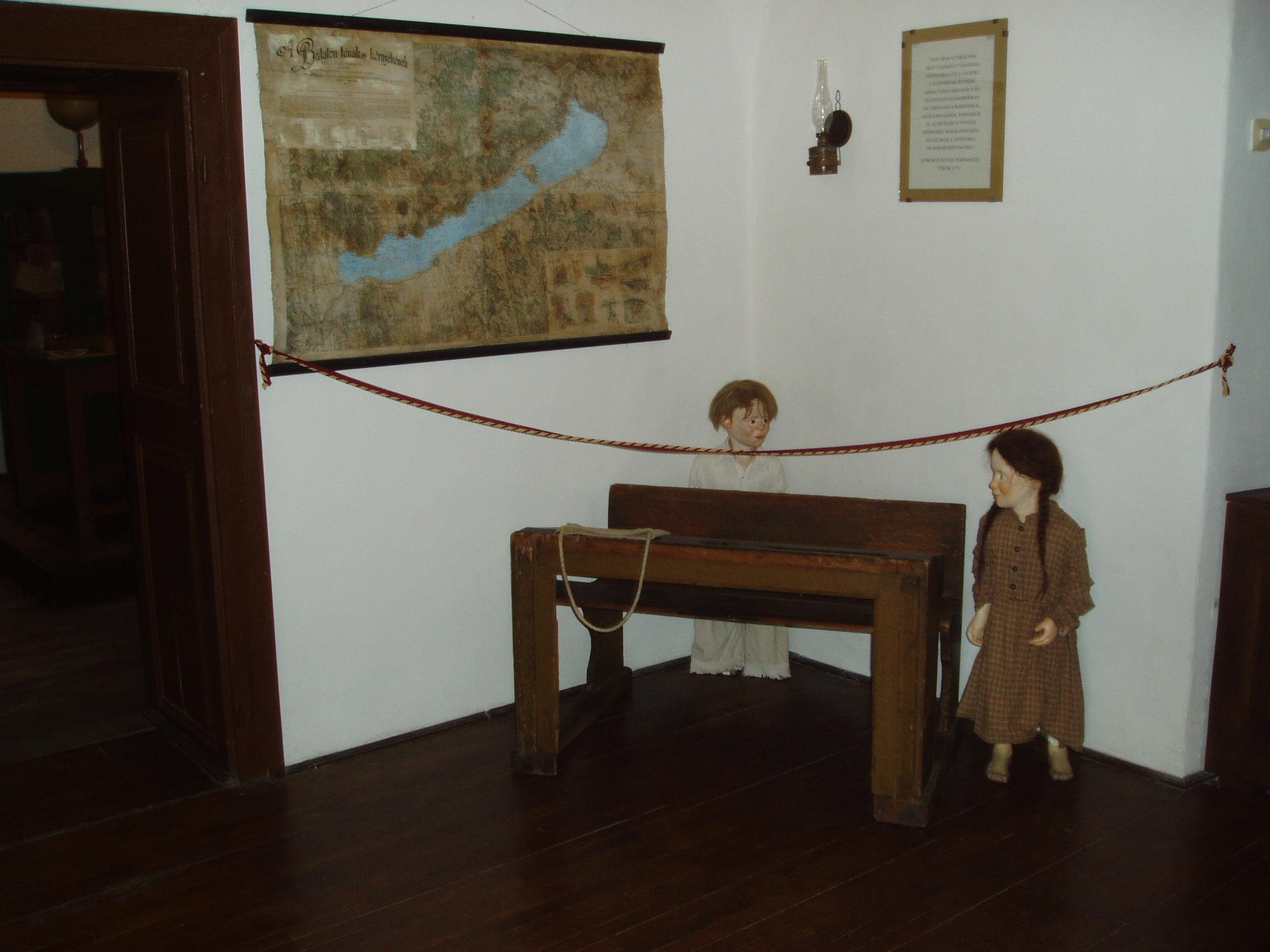 Nyilvános 1219 | 1922 | Tapolca: Templom domb 8. Múzeum | A múzeum épülete, az ún. Kántorház - a város védett építészeti emléke - Tapolca történelmi városközpontjában, a Malom-tó fölötti Templom dombon található. Ide járt elemi iskolába a város nagy szülötte, Batsányi János költő. Az épületben 1733-tól 1884-ig folyt az elemi iskolai oktatás. A múzeum iskolatörténeti kiállításának első helyisége a XIX-XX. század fordulóját idéző zsibongó. A falakon ruhafogas, azon a hajdani kisdiákokat idéző tarisznyák, a sarokban kézmosó lavór, átellenben pedig maguk a régi idők szegényes külsejű iskolásait megelevenítő két életnagyságú bábu barátságos figurája. Az 1902-ből származó Balaton-térkép Lóczy Lajos munkáját dícséri. A felvétel 2007 februárjában készült. Felh. irod.: Látnivalók Veszprém megyében. Miskolc, Well-PRess, 2000 Hangodi László: Múltbanéző - kiállításvezető a Tapolcai Városi Múzeum tárlataihoz. Tapolca, 2006 |