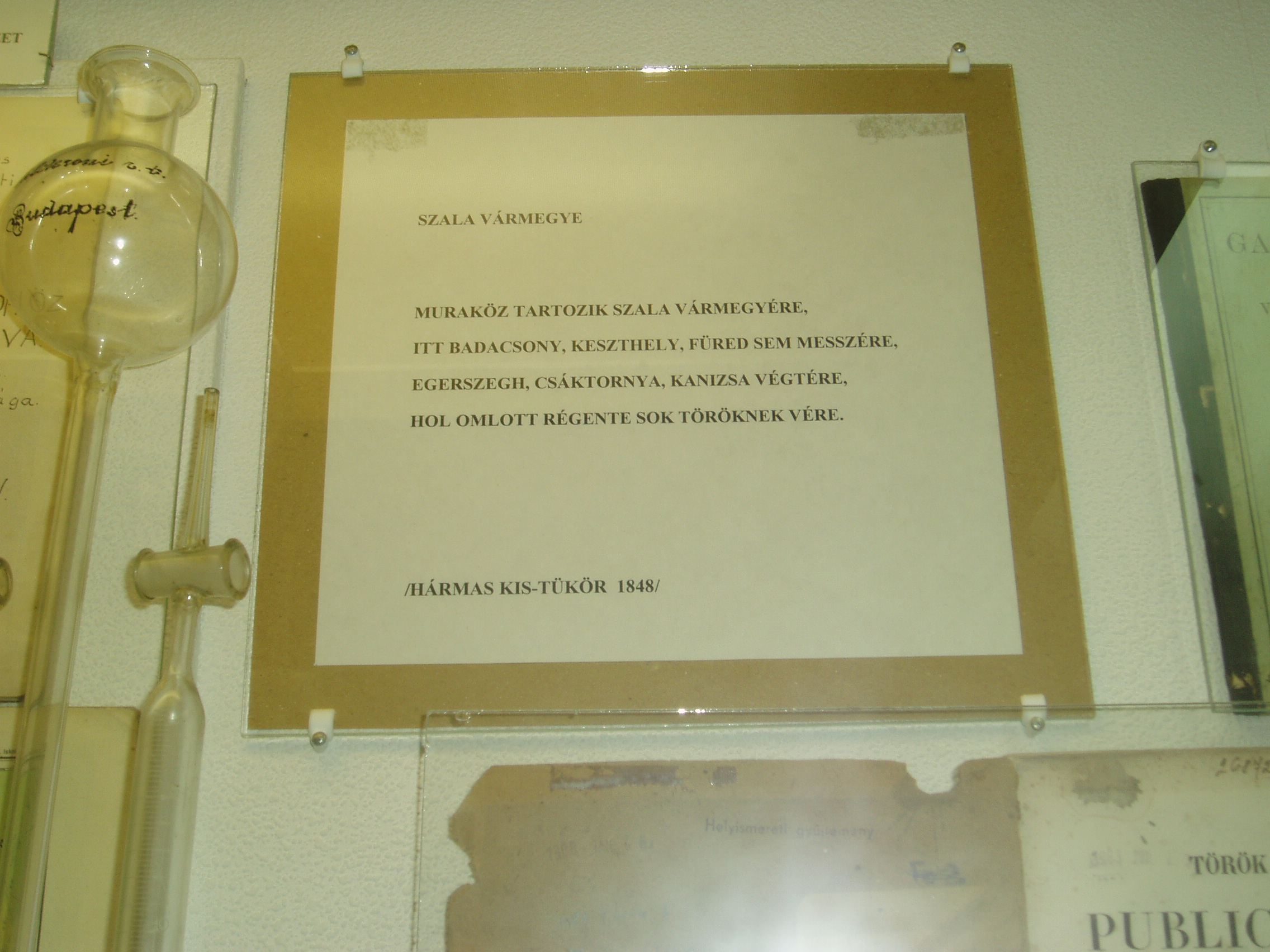 Nyilvános 1190 | 1871 | Tapolca: Templom domb 8. Múzeum | A múzeum épülete, az ún. Kántorház - a város védett építészeti emléke - Tapolca történelmi városközpontjában, a Malom-tó fölötti Templom dombon található. Ide járt elemi iskolába a város nagy szülötte, Batsányi János költő. Az épületben 1733-tól 1884-ig folyt az elemi iskolai oktatás. A múzeum iskolatörténeti kiállításán olvasható idézet, Zala vármegye verses összefoglalása a Hármas kis-tükör c. 1848-as tankönyvből. A felvétel 2007 februárjában készült. Felh. irod.: Látnivalók Veszprém megyében. Miskolc, Well-PRess, 2000 Hangodi László: Múltbanéző - kiállításvezető a Tapolcai Városi Múzeum tárlataihoz. Tapolca, 2006 |