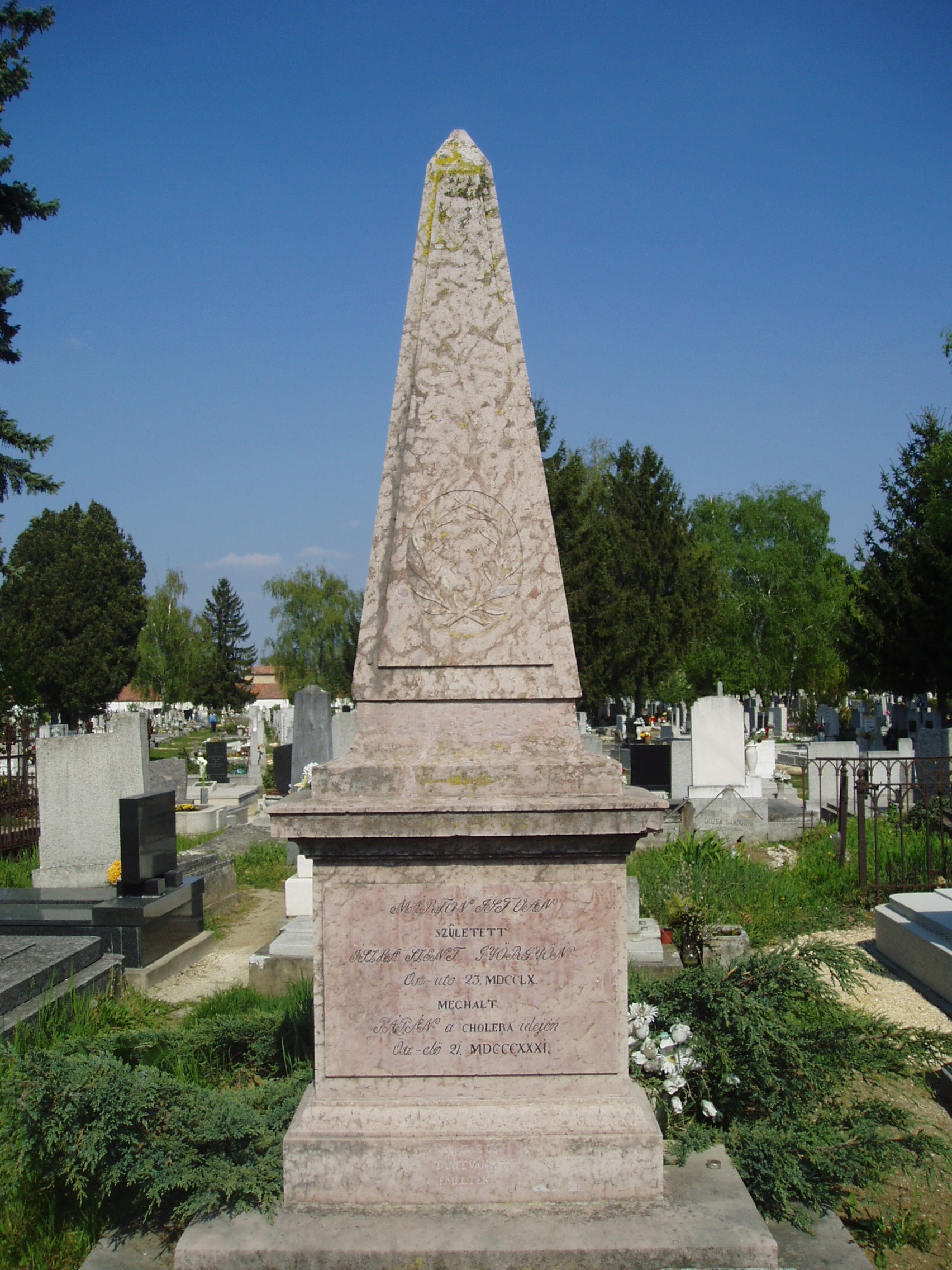Nyilvános 1459 | 4060 | Rövid leírás | Teljes leírás (1.13 KB) | Pápa, Alsóvárosi temető: Mándi Márton István sírja A Jókai utcáról nyíló Temető utca vezet a XIX. század elején megnyílt Alsóvárosi köztemetőbe. A város sok neves személyiségének van itt a sírja. Itt nyugszik Mándi Márton (Iszkaszentgyörgy, 1760. nov. 23. – Pápa, 1831. szept. 21.) nyelvész, tanár, filozófus. Kecskeméten, Debrecenben, majd Göttingában tanult. 1790-től volt a pápai református gimnázium rektor-professzora. Nevéhez fűződik az iskola új fellendülése. A filozófiában Kant követője volt és 1795-ben már Kant tanítása alapján tartott előadásokat, amelyekért súlyos bírálat érte. Márvány mellszobra, Izsó Miklós alkotása a református könyvtárban látható (Pápa, Március 15. tér 9.). A városban utcanév, az Ókollégium (Petőfi S. utca 13.) falán tábla őrzi emlékét. A fénykép 2007 áprilisában készült. Felh. irod.: Németh Adél - Szabó Lajos: Pápa. Bp. Panoráma, 1989 Veszprém megyei életrajzi lexikon. Veszprém, Veszprém Megyei Önkormányzat Közgyűlése, 1998 |