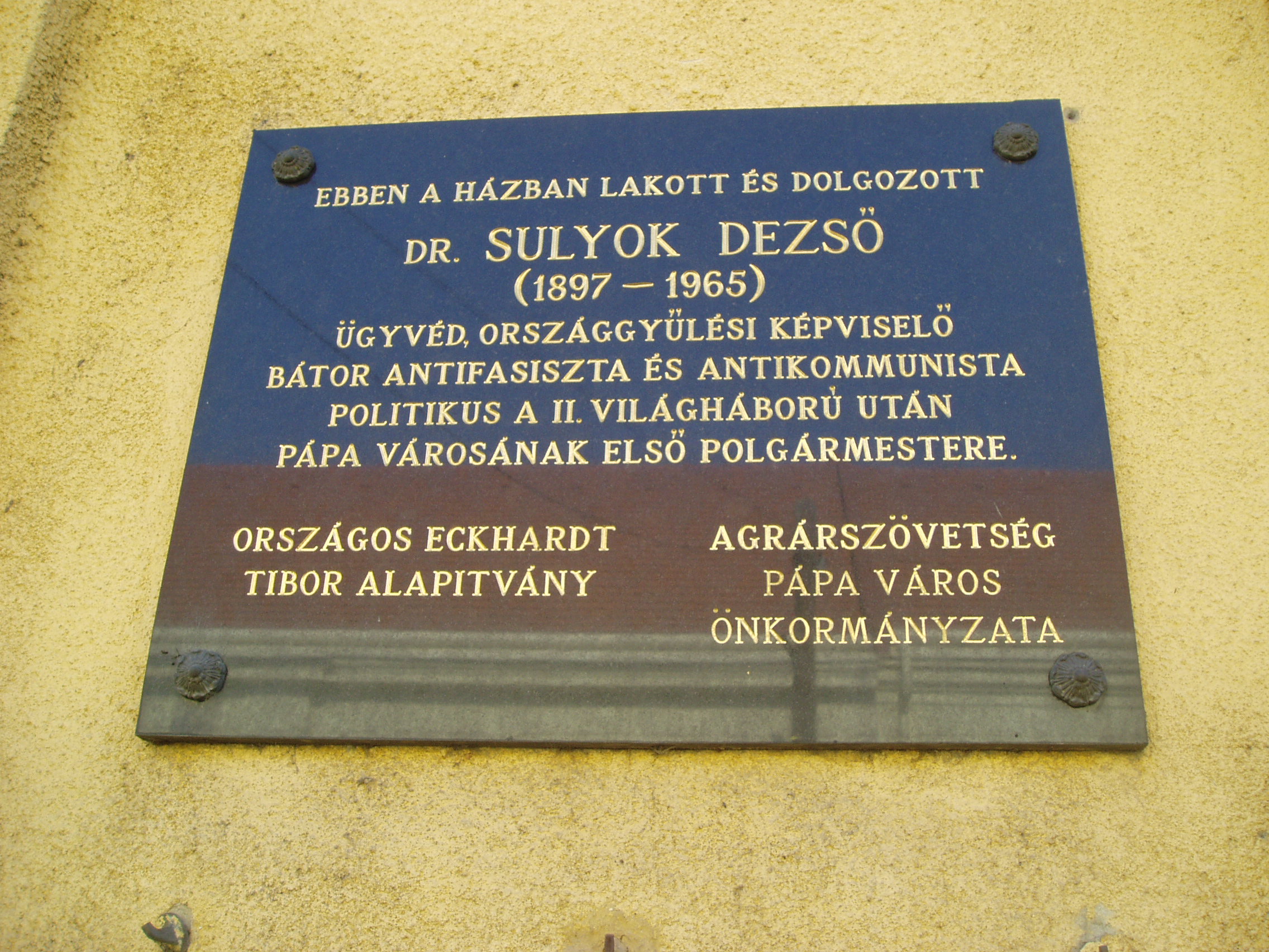 Nyilvános 1239 | 1979 | Pápa, Batthyány utca 3. | Mint az épület homlokzatán olvasható emléktábla tanúsítja, ebben a házban élt és dolgozott Sulyok Dezső ügyvéd, országgyűlési képviselő, Pápa első polgármestere a második világháború után. Sulyok Dezső (Simaházapuszta, 1897. márc. 28. – New York, 1965. máj. 18.) politikus, jogász. 1919–1920-ban – a Tanácsköztársaság idején is – Pápán, csendőrhadnagyként a helyi karhatalom parancsnoka volt, majd kilépett a csendőrségtől, Budapesten szerzett jogtudományi oklevelet. 1924-ben Pápán ügyvédi irodát nyitott. Jelentős szerepet játszott a város közéletében: elnöke volt a Katolikus Körnek, ügyésze a Hitelbank pápai fiókjának. 1935-ben országgyűlési képviselő lett előbb pártonkívüli, majd kisgazdapárti programmal. A második világháborúban a Donnál harcolt. 1943-tól a FKgP polgári tagozatának társelnöke. Náciellenes magatartása miatt 1944. április 3-án letartóztatták, két hónapra internálták. 1945-ben, áprilistól szeptemberig Pápa város első polgármestere, egyben rendőrkapitánya, és a Független Kisgazda Párt jobbszárnyának, a Sulyok–Vásáry csoportnak egyik vezetője volt. 1945. júniustól 1946. márciusig Veszprém megye országgyűlési képviselője. 1946-ban, a pártelnöki tanács 20 társával együtt kizárta a FKgP-ből, de mandátumát megtarthatta. Magyar Szabadság Párt néven új pártot alapított, amely fél évig működhetett csak. Elhagyta az országot és az Amerikai Egyesült Államokban élt, jelentős szerepet vállalva a politikai emigrációban. A fénykép 2007 áprilisában készült. Felh. irod.: Németh Adél - Szabó Lajos: Pápa. Bp. Panoráma, 1989 Veszprém megyei életrajzi lexikon. Veszprém, Veszprém Megyei Önkormányzat Közgyűlése, 1998 |