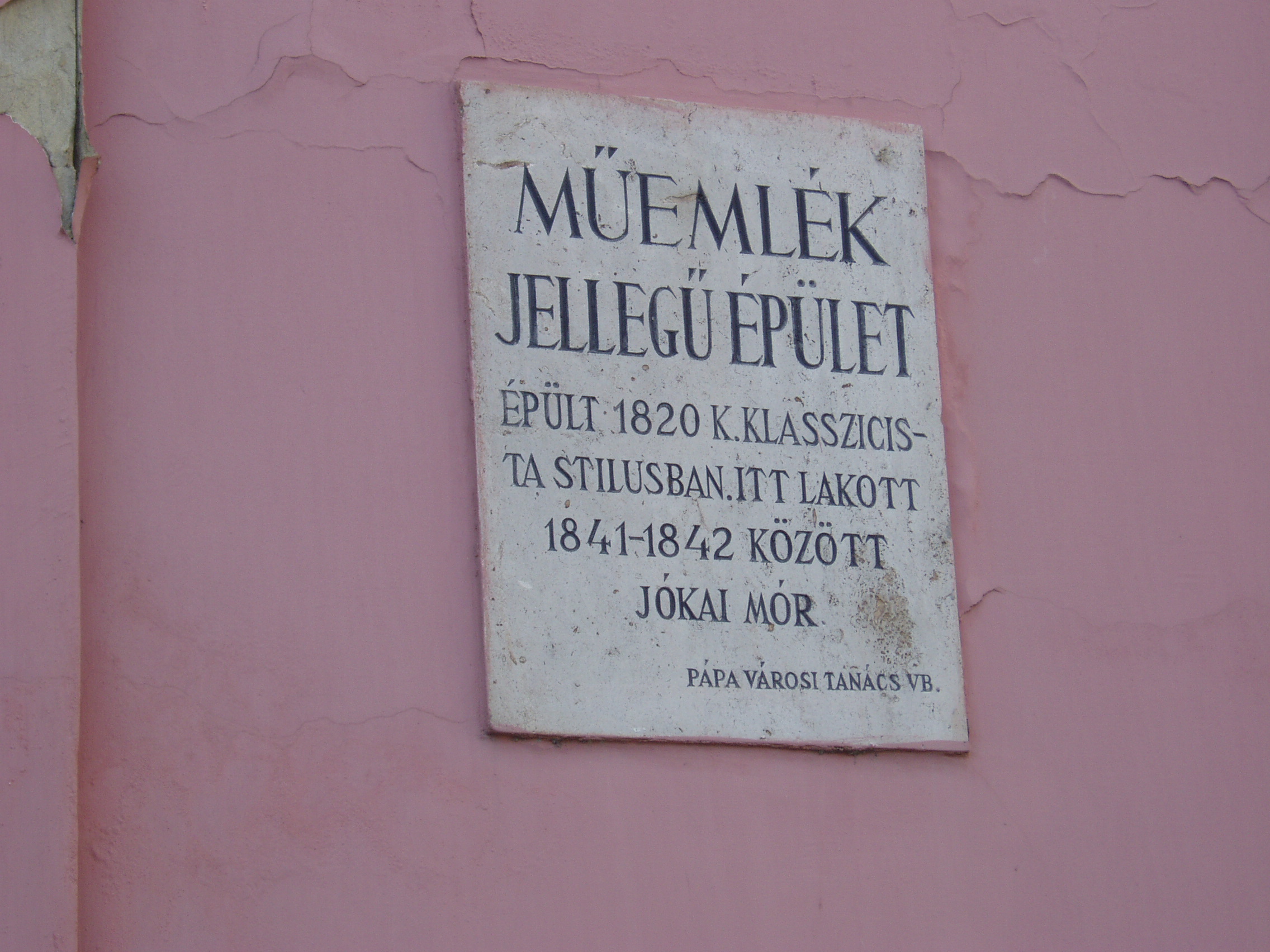 Nyilvános 1168 | 1773 | Pápa, Jókai utca 13. | Klasszicista stílusban, 1820 körül épült egyemeletes lakóház. Homlokzatán emléktábla jelzi, hogy pápai diák korában, 1841/42-ben itt lakott Jókai Mór. Jókai - akkor még Jókay - Mórt sógora, Vály Ferenc hozta Pápára 1841. aug. 21-én különbözeti vizsgát tenni, ami után a fiú a Kollégium (lásd: Pápa, Petőfi u. 13.) diákja lett. Nov. 1-jén költözött be bebbe a házba, Klára Mihály otthonába, kosztosdiákként. (Még idős kori levelében is emlegette a "derék" Klára Mariska főztjét.) Együtt lakott Kerkapoly Károly későbbi filozófiaprofesszorrel és pénzügyminiszterrel és egy Pap Dénes nevű iskolatársával. Az itt töltött időben Jókai jeles előmenetelű diák volt. Tanulmányai mellett portréfestéssel is foglalkozott. Visszavonult, szolíd életet élt, amivel táraitól kiérdemelte a "Jámbor" becenevet. Ebben gyerekkori betegségének, tüdő-problémáinak is része volt. Lakótársain kívül elsősorban Orlai Petrich Somával barátkozott. Petőfivel 1842-ben ismerkedett meg. Eltérő egyéniségük ellenére hamar jóban lettek, sok időt töltött Petőfiék szállásán (lásd: Pápa, Petőfi u. 11.), de igazi barátság csak a későbbi kecskeméti években alakult ki közöttük. Bár még elsősorban festőművésznek készült, de novellákat is írt; az egyikkel második díjat nyert 1842-ben (lásd: Pápa, Fő u. 17.). Itt töltött időszaka, a diákélet szokásai, jeles professzorai nagy hatást gyakoroltak életművére. Különösen sok pápai motívum lelhető fel az És mégis mozog a föld és az Egetvívó asszonyszív című regényeiben. A házat még Jókai életében, 1880-ban jelölték meg emléktáblával (lásd: Pápa, Jókai u. 13. 3.kép). A fénykép 2007 áprilisában készült. Felh. irod.: Németh Adél - Szabó Lajos: Pápa. Bp. Panoráma, 1989 Petőfi emlékhelyek a Kérpát-medencében. Kiskőrös, 1996, Petőfi Sándor Társaság "A kényes úrfi s a rongyos baka". Tanulmányok két halhatatlan pápai diákról. Pápa, 2001, Pápai Református Gyűjtemények |