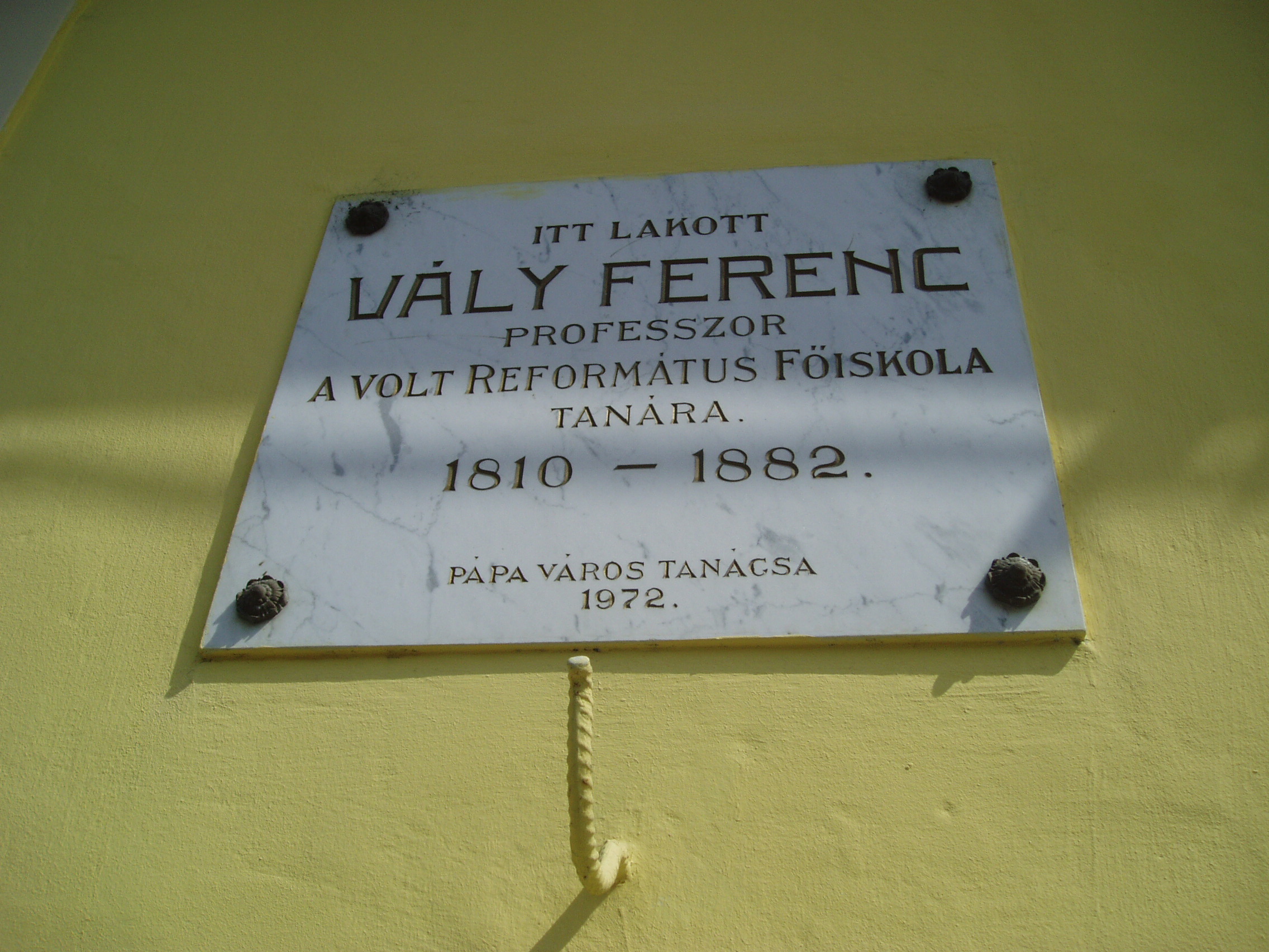 Nyilvános 1211 | 1827 | Pápa, Jókai utca 20. | Ez a kis ház volt Vály Ferenc főiskolai professzor lakóháza pápai évei alatt. Vály Ferenc (Magyarsiófok, 1810. szept. 30. – Pápa, 1882. dec. 13.) tanár, tankönyvíró. 1833-tól néhány évig tanító volt Pápán, de visszakerült Komáromba, ahol 1839-től a református gimnázium igazgatójaként működött. 1839-ben feleségül vette Jókay Esztert, Jókai Mór nővérét. A szabadságharc után, melyben tüzérként vett részt, telepedett le a család Pápán, ahol a református főiskola tanára és a tanítóképző igazgatója volt. Egy természetrajzi és egy kémiai tankönyve jelent meg. 1882-ben hunyt el, a pápai Alsóvárosi temetőben nyugszik (lásd: Pápa, Alsóvárosi temető: Vály Ferenc sírja). Felesége, Jókay Eszter 1816-ban született Komáromban. Számos cikket és visszaemlékezést írt a korabeli folyóiratokba, többek között forrásértékű adatokkal szolgált Jókai Mór gyermekkoráról. 1889. máj. 7-én hunyt el Pápán, férjével közös sírban nyugszik. Leányuk, az ebben a házban (is) nevelkedett Vály Mari Komáromban született 1840. nov. 17.-én. Férjének és gyermekének korai halála után Jókaiékhoz költözött a fővárosba, háztartásuk vezetésében segédkezett. Nagybátyja életét terjedelmes emlékiratban örökítette meg. Pápán hunyt el 1915. május 17-én, sírja szülei nyughelye mellett van (lásd: Pápa, Alsóvárosi temető: Vály Mari sírja). A fénykép 2007 áprilisában készült. Felh. irod.: Németh Adél - Szabó Lajos: Pápa. Bp. Panoráma, 1989 Veszprém megyei életrajzi lexikon. Veszprém, Veszprém Megyei Önkormányzat Közgyűlése, 1998 |