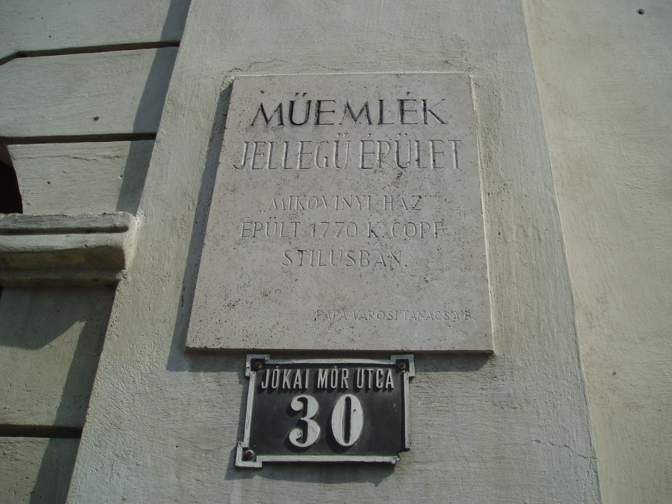 Nyilvános 1182 | 1790 | Pápa, Jókai utca 30. | Az utca talán legszebb épülete az ún. Mikovinyi-ház. 1770 körül épült copf stílusban, Fellner Jakab tervei szerint. Itt lakott kollégiumi diák korában Kerkapoly Károly későbbi pénzügyminiszter. Kerkapoly Károly (Szentgál, 1824. máj. 15. – Bp., 1891. dec. 31.) író, miniszter, történész, jogász. Petőfi és Jókai iskolatársa volt a pápai református kollégiumban (lásd: Pápa, Petőfi u. 13.). Jogot végzett, Halléban és Berlinben egészítette ki tanulmányait. Tehetségét Deák Ferenc is nagyra értékelte. Meghívták Pápára a bölcselet tanárának. A szabadságharcban a veszprémi nemzetőrség tagjaként vett részt. A kiegyezés idején Deák-párti programmal Enying, majd 1869–1878 között Tapolca választotta meg országgyűlési képviselőnek. 1870–1873 között pénzügyminiszter, majd egyetemi tanár. 1878-ban visszavonult, gazdálkodott, faiskolát, gyümölcsöst, szőlőt telepített. Tevékenyen részt vett a kor gazdasági mozgalmaiban. Bölcseleti munkái Hegel, közgazdasági tanulmányai Smith és Ricardo hatását mutatják. A fénykép 2007 áprilisában készült. Felh. irod.: Németh Adél - Szabó Lajos: Pápa. Bp. Panoráma, 1989 Veszprém megyei életrajzi lexikon. Veszprém, Veszprém Megyei Önkormányzat Közgyűlése, 1998 |