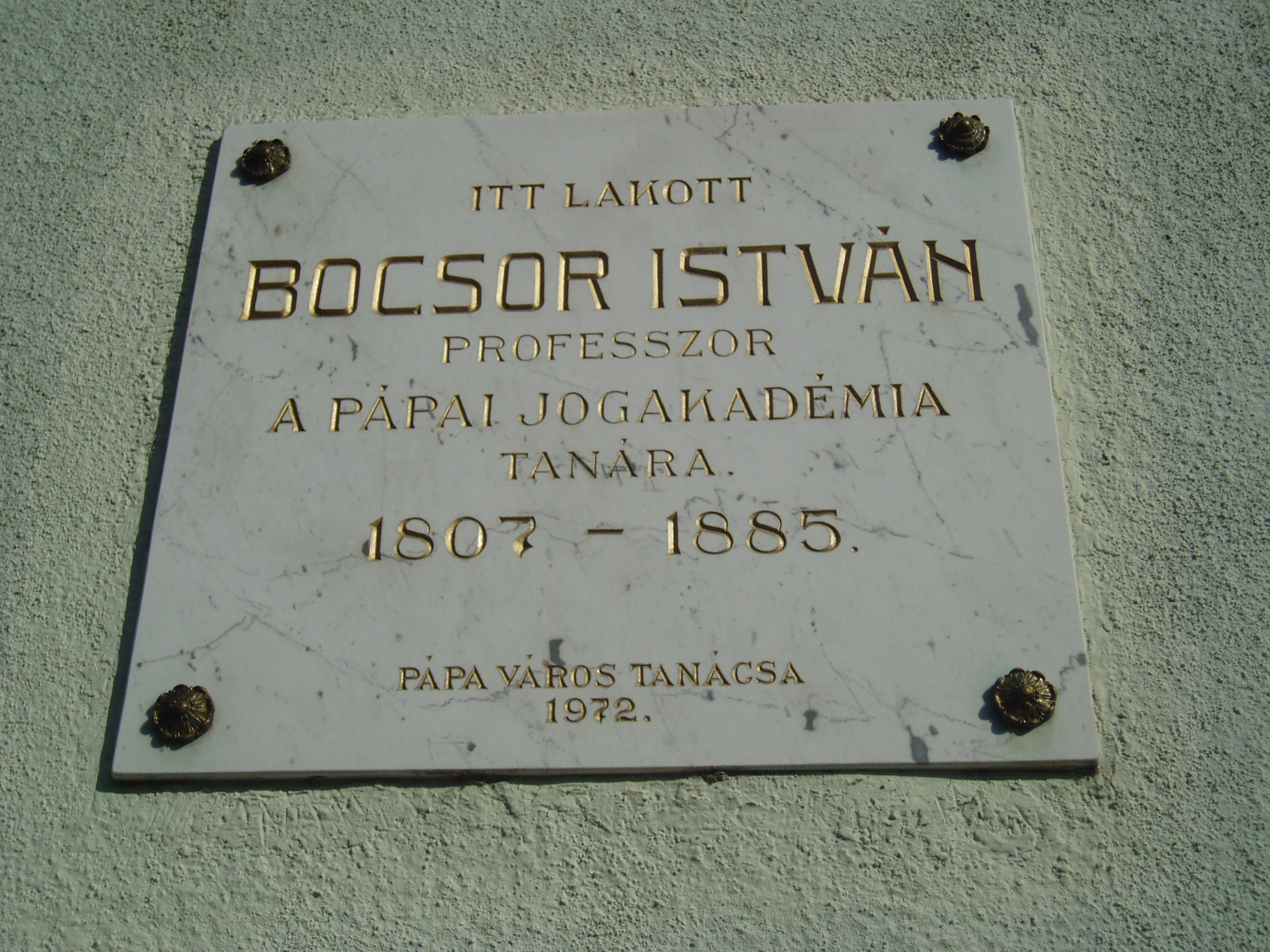 Nyilvános 1298 | 2756 | Pápa, Széchenyi utca 10. | A városi lakóház többszörös kultúrtörténeti jelentőséggel bír. Itt, a ház utcafronti részében lakott Bocsor István (1807-1885), a pápai református kollégium (lásd: Pápa, Petőfi u. 13.) egyik nagy tanáregyénisége. Tanulmányait is abban az iskolában végezte, s 1837-ben lett az intézmény tanára. Magyar nyelvű történelemórái a város közönségére is nagy hatást gyakoroltak. Latin nyelvtana öt kiadást ért meg. 1848-ban az enyingi kerület nemzetgyűlési képviselője volt. A szabadságharc bukása után visszavonultan csak pedagógiai munkásságának élt. Az 1885-ben elhunyt tanár sírja az Alsóvárosi temetőben van (lásd: Pápa, Alsóvárosi temető: Bocsor István sírja). Egykori lakóházán 1972-ben avattak emléktáblát. Alakját a ház másik lakója, a költő Kozma Andor "Karthagói harangok" című versében örökítette meg: A pápai öreg kollégyiom terme Csupa vén diákkal zsúfolásig telve. Ajkuk néma, mint a faragott képnek, Pedig verekedő vad fickók lehetnek.: Több homlokon, arcon beforradt sebhelyek, Kemény hideg-vasra valló emlékjelek; Van, kinek hiányzik fél keze, fél lába... Ilyenek is járnak Pápán iskolába. Ki históriában kutat világeszmét, Tudós Bocsor István professzor tart leckét. Tavaly Debrecenben még Enyéng követje, Alig egy fél éve még tömlöcre vetve, Most Bécs kegyelméből, rendőrtől figyelve, Megint katedráján a hatalmas elme. Tilalmas részére a honi történet, Hanem Kárthágórul s Rómárul beszélhet. Im beszél is bőven ékesszavú ajka, Visszatért diákok szomjan csüggnek rajta. ..."S a dicső Kárthágó, mondja a professzor, Végső viadalra keseredett ekkor. Ezer éves multját üti vala arcul, Hogyha lemond gyáván a rátukmált harcrul. maga dölyfös Róma egyedül ha támad, Nem győz hős haragján Kárthágó hadának. Barbár Masszinissza, gaz numíd szövetség, Ez pecsételé meg Kárthágó elestét. Ám Kárthágó népe a bús végveszélyben Nagyszerű halálra buzdult föl kevélyen. A nemzeti zászlók lobogtak kibontva, Tódultak alájuk, nőtt a had naponta, Kárthágói férfit asszony nem marasztott, Hont védeni mentek urak és parasztok, Kereskedőt üzlet, mesterembert szerszám Nem kötött le többé, - beálltak ezerszám. S a zsönge diákok az iskola padját Fegyverért esengve önként odahagyják... Ó, a boldog ifjak, ép erős legények, Mint irigylik őket rokkantlábú vének! S ezek is elmentek, nem sujthatva mással, Sujtani az ellent bátor, bölcs tanáccsal. ... Mily prelekció ez? Úgy zeng, mint az égbolt... Eszmél a professzor, elhallgat, - elég volt. Hogy is volt? - Kárthágó, harangok és ágyú...? Mily anakronizmus, tudatlan és bárgyú! S mégis: a teremben nem mosolyog senki, Csönd van...tüzes arcok...s könnyezik mindenki. Nem szól a professzor; ha még szólna: torkán Kitörne, mely fojtja, a zokogás-orkán. Ül sokáig némán, sóhajt keserveset: "S Kárthágó - elesett." A fénykép 2007 áprilisában készült. Felh. irod.: "A kényes úrfi s a rongyos baka". Tanulmányok két halhatatlan pápai diákról. Pápa, 2001, Pápai Református Gyűjtemények |