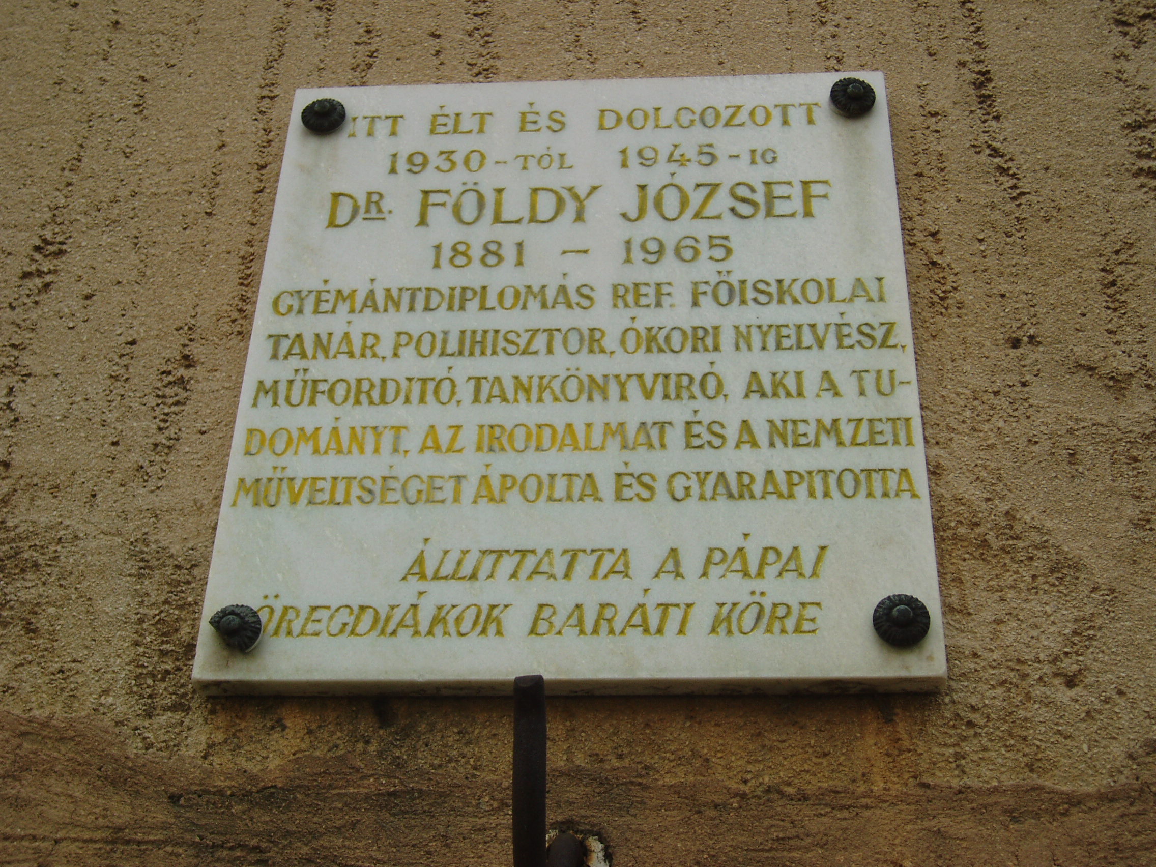 Nyilvános 1219 | 1920 | Pápa, Török Bálint utca 16. | Pápai működése nagy részében ebben a házban lakott dr. Földy József tanár, klasszika-filológus, ókori nyelvész, műfordító. Kecskeméten született 1881. április 16-án. 1896-ban belépett a piarista rendbe, 1904-ben pappá szentelték. Egyetemi doktori fokozatát 1902-ben nyerte el. 1912-ben kilépett a rendből s néhány évvel később református lelkipásztori képesítést szerzett. 1924 és 1946 között tanított Pápán a református főiskolán. Budapesten hunyt el 1965. december 28-án. A házon a pápai öregdiákok helyeztek el emléktáblát. A fénykép 2007 áprilisában készült. Felh. irod.: Veszprém megyei életrajzi lexikon. Veszprém, Veszprém Megyei Önkormányzat Közgyűlése, 1998 |