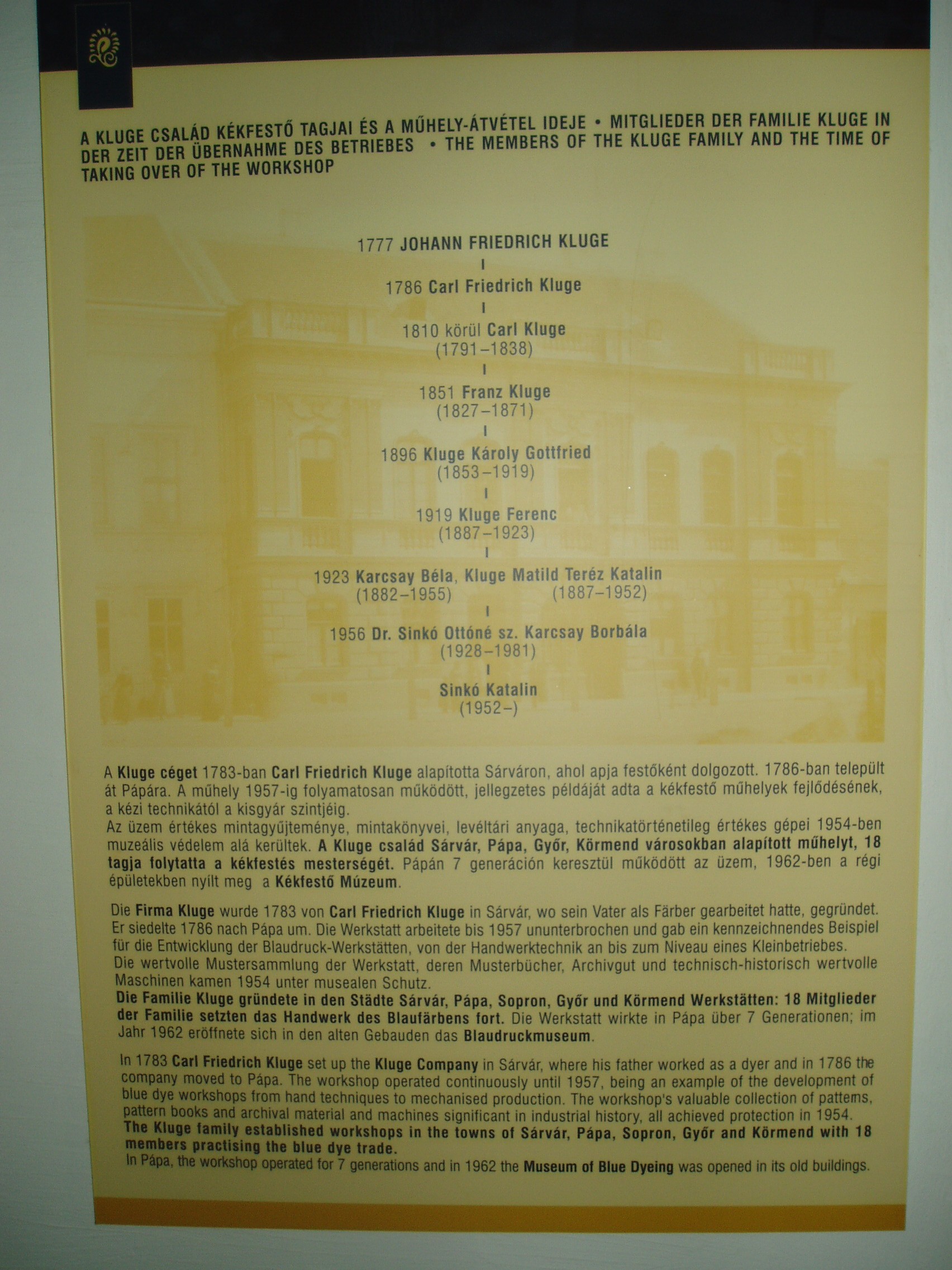 Nyilvános 1177 | 1738 | Pápa, Március 15. tér 12. Kékfestő Múzeum | Az 1962-ben megnyílt pápai Kékfestő Múzeum az egykori Kluge cég üzemének épületében és berendezéséből alakult. A céget 1783-ban alapította Sárváron a Szászországból bevándorolt Carl Friedrich Kluge, aki azonban 1786-ban már Pápán ezen a helyen, a mai Március 15. tér 12. számú épületegyüttes elődjében dolgozott. Fia, Kluge Károly, majd unokája, Kluge Ferenc is az ő mesterségét folytatta. Leszármazottai abban is követték az alapító Carl Friedrichet, hogy hosszas külföldi tanulmányutakat tettek. A cseh, porosz, thüringiai, bajor, svájci és osztrák műhelyekben tapasztaltakat itthon is alkalmazták, s ezzel fokozatosan kiemelkedtek a többi pápai kékfestő közül. A múzeum utca felőli épülete még a XVIII. századból származik. A képen látható udvari, három emeletes üzemépületet az 1860-as években emelték. Földszintjén ma is látható a 15 medencét befogadó küpaszoba, az ún. fekete konyhában a kifőzést és a keményítést szolgáló katlanok sora. Az emeleten a tarkázás, a kézi nyomás helyiségei találhatók, fölöttük pedig a hatalmas zsalugáteres, fedett padlástér és az innen kiugró nyitott erkélyszárító. A virágzó cég munkáját visszavetette az első világháború anyaghiánya és a falusiak népviseletből való fokozatos kivetkőzése. Az üzem végérvényesen 1956-ban zárta be kapuját. Egy és háromnegyed évszázados fennállása folyamán a család hét generációja váltotta egymást. A múzeumban a családi nagyüzem írott és tárgyi emlékei, eredeti berendezési tárgyai láthatók. Emmellett az intézmény folyamatosan kapcsolatot tart a még működő kékfestőmesterekkel, iparművészekkel, akik termékeikkel, alkotásaikkal rendszeresen gyarapítják a gyűjteményt. Ezekből az adományokból és vásárlásokból jött létre a kortárs hazai kékfestő-mesterek és műhelyek termékeiből rendezett állandó kiállítás. A fénykép 2007 áprilisában készült. Felh. irod.: Domonkos Ottó - Tóth Sándorné: Pápa, Kékfestő Múzeum. Bp. 1995, Cartographia. /Tájak, Korok, Múzeumok kiskönyvtára 205./ |