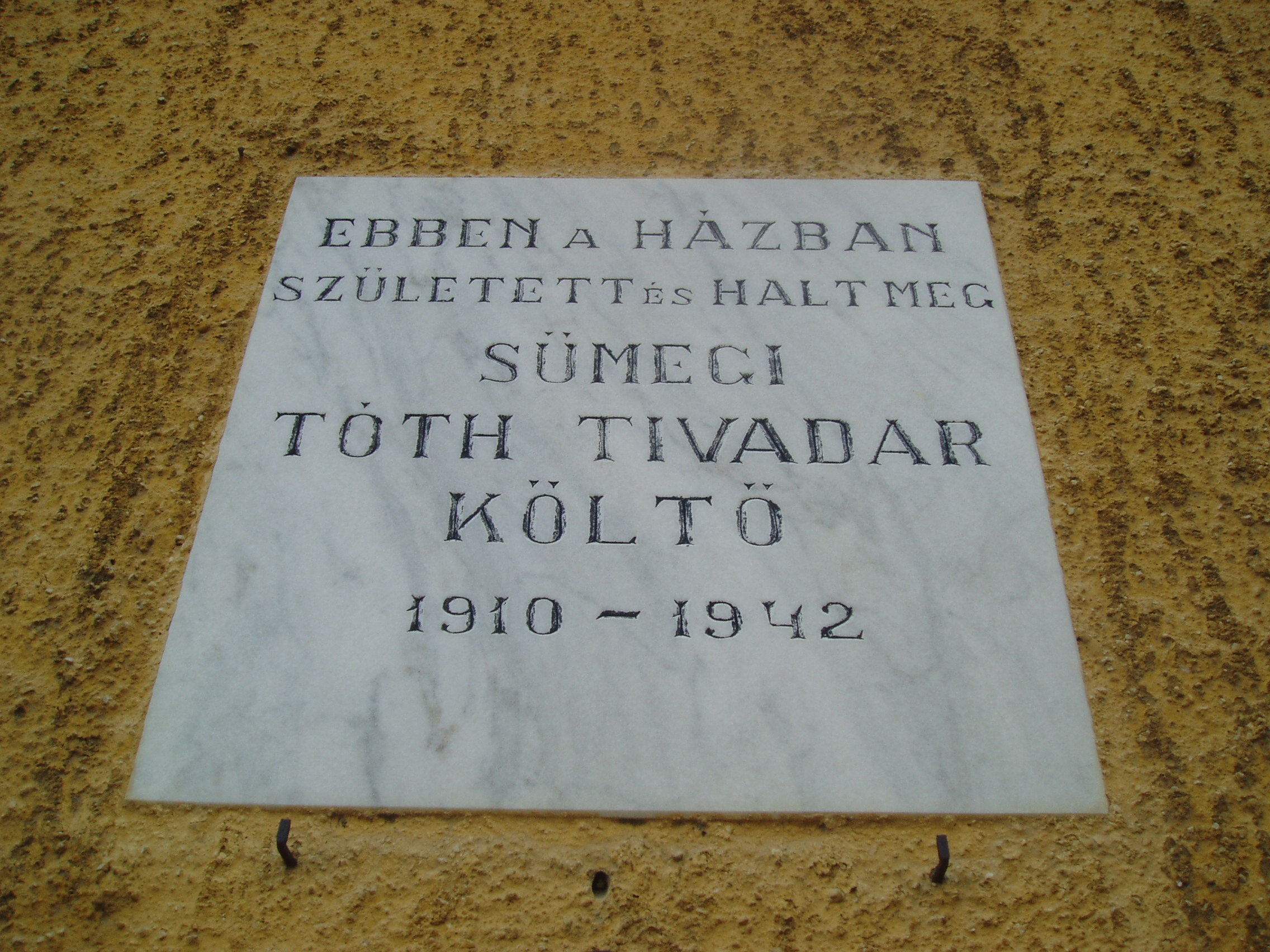 Nyilvános 1220 | 1877 | Sümeg, Cseh L. utca 1. | Mint az épület homlokzatán elhelyezett emléktáblán is olvasható, ebben a házban született és halt meg Sümegi Tóth Tivadar költő. Sümegi Tóth Tivadar (Sümeg, 1910. nov. 19. – Sümeg, 1942. aug. 15.) költő. Középiskola tanulmányok után sok mindennel próbálkozott, sokáig Budapesten volt tisztviselő. Hányatott sorsáról népies ízű, fanyar hangulatú versei tanúskodnak. A Magyar Élet és a Kelet Népe közölte költeményeit. Versei terjesztésének különleges módját választotta. Előbb kézírással, majd indigós gépeléssel 5–6 versét adta közre pár oldalas kis füzetekben. Fiatalon, tüdőbajban hunyt el. Verseinek gyűjteményes kötete 1995-ben jelent meg Életért kiáltok címmel a Sümegi írások sorozatban. A sümegi Városi temetőben nyugszik. A városban utca viseli nevét. A fénykép 2007 júniusában készült. Felh. irod.: Veszprém megyei életrajzi lexikon. Veszprém, 1998 |