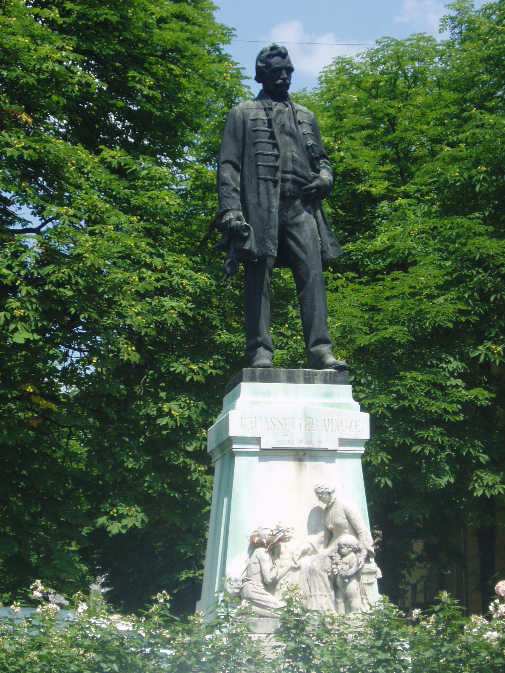 Nyilvános 1160 | 1885 | Sümeg, Kossuth utca 13. Ramssetter Vince szobra | Sümeg legforgalmasabb pontján, a Kisfaludy szálloda és a Kisfaludy Gimnázium (lásd: Sümeg, Mártirok útja 1.) között 1908-ban állították fel Sümeg nagy fiának, a város jótevőjének, Ramassetter Vincének egészalakos szobrát, Istók János alkotását. Ramassetter Vince (Sümeg, 1806-Sümeg, 1878) Kőszegen és Győrött járt iskolába, majd folytatva a Németalföldről betelepült apja mesterségét, ő is kékfestő lett. Később áttért a szőlőtermesztésre és a borkereskedelemre, amelyhez kádárműhelyt tartott fenn. 1848-ban Sümeg polgármesterévé választották. 1846-ban az iparostanoncok oktatására, 1855-ben pedig egy reáliskola támogatására hozott létre alapítványt. Vagyona nagyobb részét Sümeg városára, az oktatási és az egészségügyi intézmények fenntartására hagyta. A városban több emléktáblája is van (lásd: Sümeg, Árpád u. 5., Deák F. u. 8., Mártirok u. 1., Panteonfal, Ramassetter u. 10.). Sírja a helyi köztemetőben található (lásd: Sümeg, Temető), utca is őrzi nevét. A szobor talapzatán lévő dombormű feleségét, Kompanik Zsófiát ábrázolja, aki jótékonysági, városfejlesztő tevékenységében méltó társa volt férjének. Róla nevezték el a kórház utcáját. A fénykép 2007 júniusában készült. Felh. irod.: Koppány Tibor - Kozák Károly: Sümeg útikalauz. Veszprém, Idegenforgalmi Hivatal, 1965 Látnivalók Veszprém megyében. Miskolc, Well-PRess, 2004 Sümegi kalauz. Sümeg, Sümegi Fórum alapítvány, 1993 |