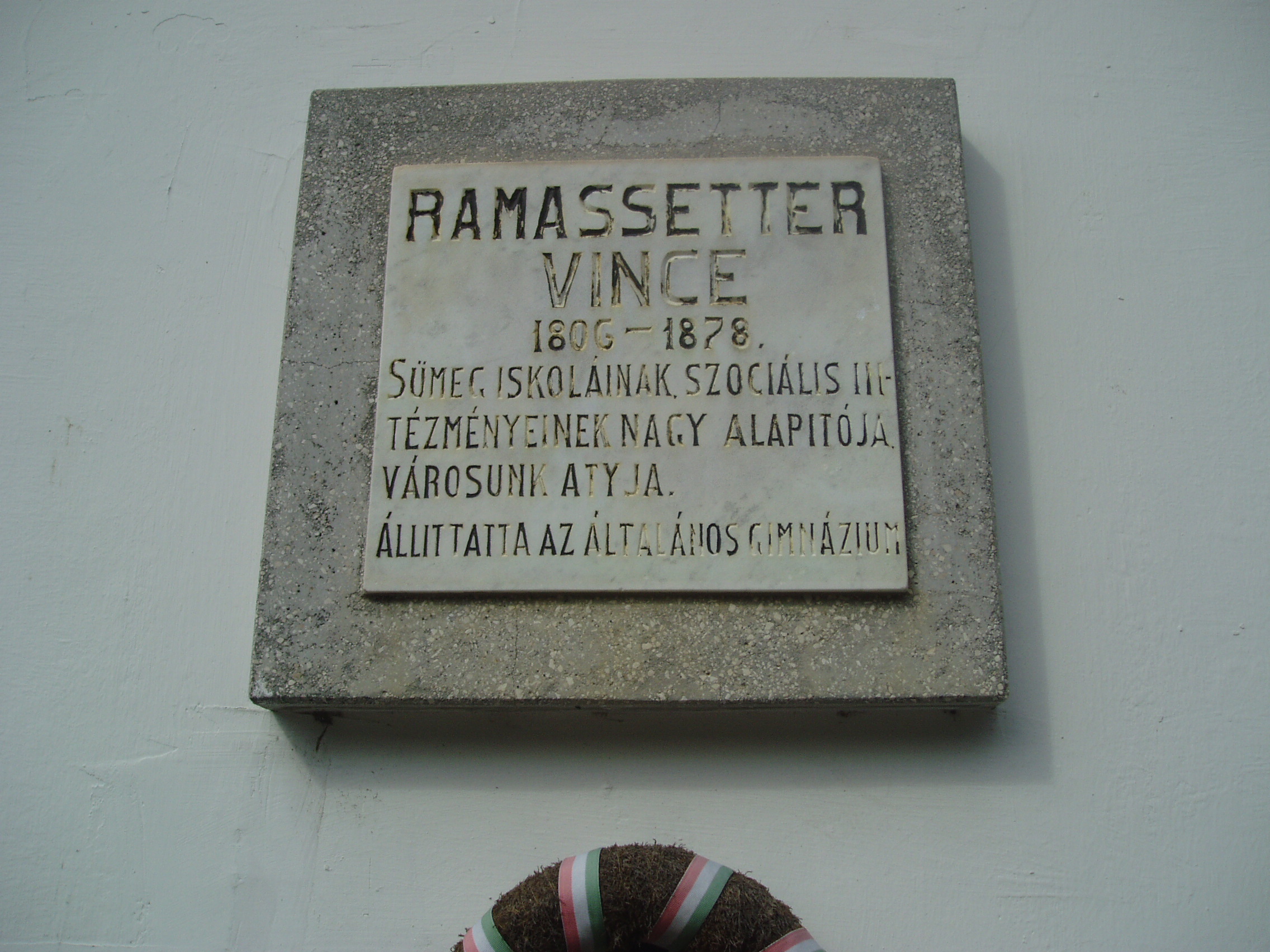 Nyilvános 1148 | 1944 | Sümeg, Panteonfal. Ramassetter Vince emléktáblája | A Kisfaludy téren, Kisfaludy Sándor szülőháza előtt alakították ki Sümeg Panteonfalát. A képen Ramassetter Vince emléktáblája látható (1955). Felirata: RAMASSETTER VINCE 1806-1878. Sümeg iskoláinak, szociális intézményeinek nagy alapítója, városunk atyja. Állíttatta az Általános Gimnázium. Ramassetter Vince (Sümeg, 1806. febr. 8. – Sümeg, 1878. máj. 10.) kékfestő, iskolaalapító, “Sümeg atyja.” Kőszegen és Győrött járt iskolába, majd folytatva németalföldről betelepült apja mesterségét, ő is kékfestő lett. Később áttért a szőlőtermesztésre és a borkereskedelemre. Ehhez kádárműhelyt is tartott fenn. A 40-es évek közepén vált népszerűvé, amikor a Védegylet mozgalmat támogató nők az ő kelméit hordták. 1848-ban Sümeg polgármesterévé választották. 1846-ban az iparostanoncok oktatására, 1855-ben pedig egy reáliskola támogatására hozott létre alapítványt. Az 1850-es évektől fáradhatatlanul agitált az iskolaügy érdekében: az elemi iskola négy osztályossá szervezését, elemi iskolai leányosztályok létrehozását szorgalmazta. Óvoda számára ajándékozott telket és házat. Vagyona nagyobb részét Sümeg városára, az oktatási és egészségügyi-intézmények fenntartására hagyta. Sümegen egészalakos szobra (lásd: Sümeg, Kossuth u. 13.), valamint több emléktáblája is van (lásd: Sümeg, Árpád u. 5.; Deák F. u. 8.; Mártirok u. 1.; Ramassetter u. 10.). Feleségével együtt a sümegi köztemetőben nyugszik (lásd: Sümeg, Temető). A fénykép 2007 júniusában készült. Felh. irod.: Koppány Tibor - Kozák Károly: Sümeg útikalauz. Veszprém, Idegenforgalmi Hivatal, 1965 Látnivalók Veszprém megyében. Miskolc, Well-PRess, 2004 Veszprém megyei életrajzi lexikon. Veszprém, Veszprém Megyei Önkormányzat Közgyűlése, 1998 www.ekmk.hu/emlekhely/Emlekhelyek.html |