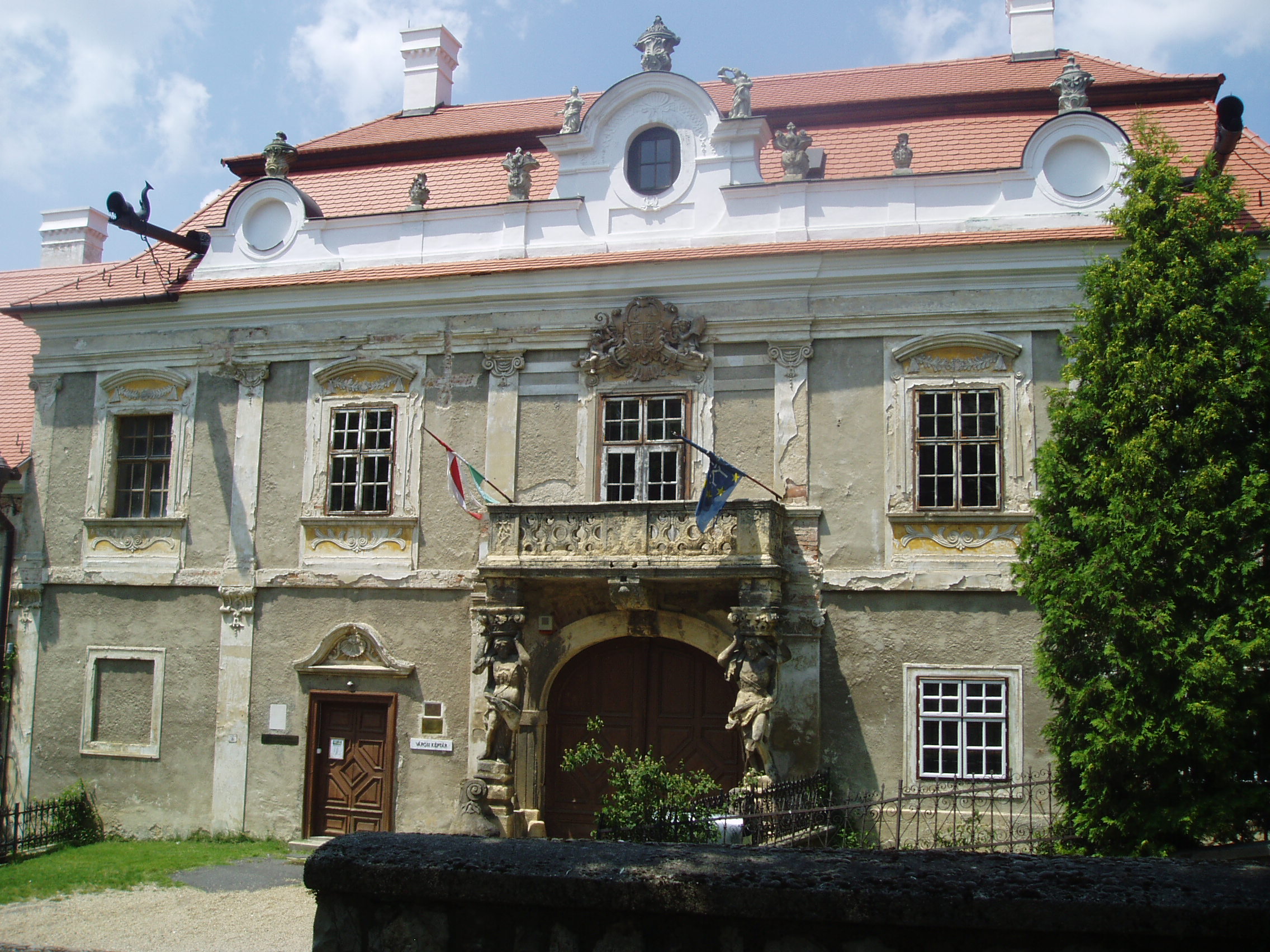 Nyilvános 1131 | 1670 | Sümeg, Szent István tér 10. Püspöki palota | A város egyik legszebb épülete az 1748 és 1755 között emelt püspöki palota. Építtetője Padányi Bíró Márton, aki 1745-ben lett veszprémi püspök, aki élete végéig nagyrészt Sümegről irányította az egyházmgye életét. Sümegen is hunyt el 1762. augusztus 16-án, 67 éves korában. Az épület a domborzati viszonyokat követve egy részében földszintes, nagyobb részében viszont emeletes. Középen a barokk építészet szabályai szerint kiemelt, díszesebb, az íves főkaput tartalmazó épületrész látható. A főkapu felett lévő faragott kőmellvéd erkélyt Atlasz-figurák tartják. A főpárkány alatt helyezték el az építtető püspök gazdagon díszített címerét. Az épület ebédlőjében és kápolnájában a falképek Vogl György, a stukkók Antonio Orsatti 1750-ben készült barokk stílusú alkotásai; a szobák stukkódíszítése és falburkolata szintén barokk stílusú. A palotát 1830 körül klasszicista stílusban átalakították. A fénykép 2007 júniusában készült. Felh. irod.: Koppány Tibor - Kozák Károly: Sümeg útikalauz. Veszprém, Idegenforgalmi Hivatal, 1965 Látnivalók Veszprém megyében. Miskolc, Well-PRess, 2004 Sümegi kalauz. Sümeg, Sümegi Fórum alapítvány, 1993 Hőgyész László: Sümeg évszázadai. Veszprém, 1989 |