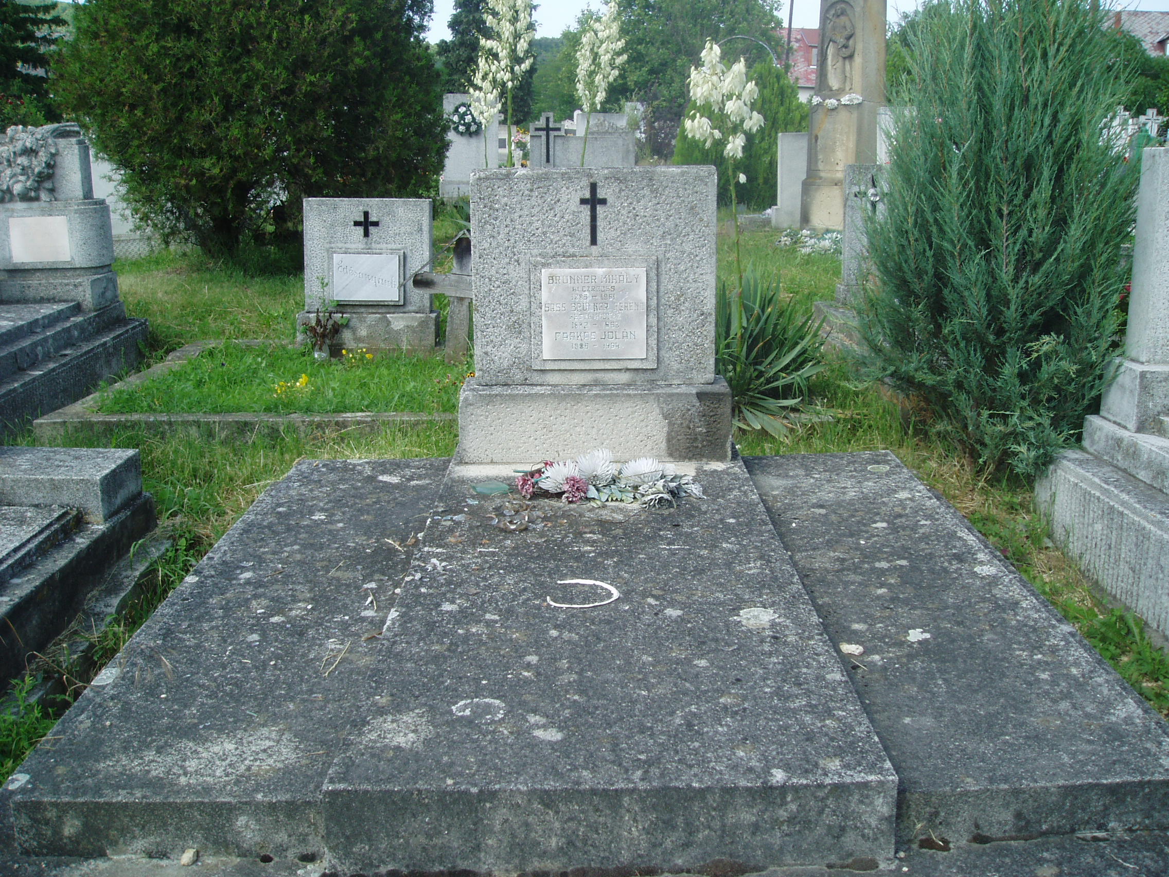 Nyilvános 1223 | 2527 | Sümeg, Temető. Sass Brunner Ferenc sírja | Sümeg délkeleti határában, a Tapolcára vezető út mellett emelkedő lankás domboldalon találjuk a város köztemetőjét. Helyét még Bíró Márton püspök jelölte ki; jelentősebb számban a XIX. század eleje óta kezdtek ide temetkezni. A temetődomb tetején áll az 1816-ban épített, későbarokk stílusú temetőkápolna. Körülötte a sümegi élet utolsó két évszázada szinte valamennyi híres személyiségének sírja fellelhető. A temetőkápolna és a modern ravatalozó között húzódó temetőrészben nyugszik Sass Brunner Ferenc (1882-1963) (eredeti nevén Brunner Ferenc) festőművész. Hollósy Simonnál és Ferenczy Károlynál tanulta a festészetet. A nagykanizsai Sass Erzsébetet vette feleségül, de nem sokáig éltek együtt. Felesége és leánya, Brunner Erzsébet 1929-ben Indiába mentek, ahol végleg le is telepedtek, s ott is haltak meg. Anya és lánya is jeles festőművész volt (lásd még: Sümeg, Kisfaludy tér 2.). Sass Brunner Ferenc liberális nézetei miatt többször megjárta a rendőrséget, zaklatásoknak volt kitéve. Zárkózottá vált, egyre kevesebbet festett, s az 1920-as évek végén Sümegre költözött. Itt katonatiszt testvére tartotta el (ő is ebben a sírban nyugszik), az 50-es évektől kegydíjat kapott. A fénykép 2007 júniusában készült. Felh. irod.: Koppány Tibor - Kozák Károly: Sümeg útikalauz. Veszprém, Idegenforgalmi Hivatal, 1965 Sümegi kalauz. Sümeg, Sümegi Fórum Alapítvány, 1993 Miklósi-Sikes Csaba: Kőbe vésett történelem. A sümegi városi temetők története és sírjelei 1950-ig. Sümeg, Sümegi Fórum Alapítvány, 2002 Veszprém megyei életrajzi lexikon. Veszprém, Veszprém Megyei Önkormányzat Közgyűlése, 1998 |