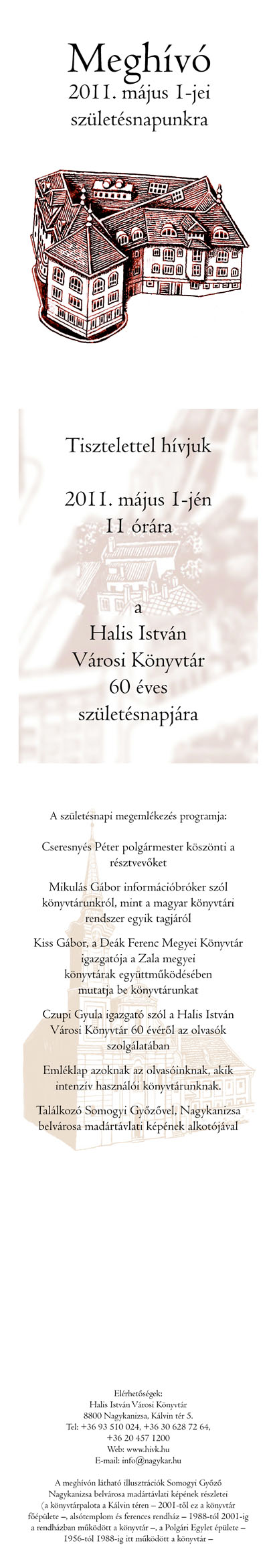 Nyilvános 1592 | 4007 | Meghívó | 2011. május 1-jei születésnapunkra Tisztelettel hívjuk 2011. május 1-jén 11 órára a Halis István Városi Könyvtár 60 éves születésnapjára A születésnapi megemlékezés programja: Cseresnyés Péter polgármester köszönti a résztvevőket Mikulás Gábor információbróker szól könyvtárunkról, mint a magyar könyvtári rendszer egyik tagjáról Kiss Gábor, a Deák Ferenc Megyei Könyvtár igazgatója a Zala megyei könyvtárak együttműködésében mutatja be könyvtárunkat Czupi Gyula igazgató szól a Halis István Városi Könyvtár 60 évéről az olvasók szolgálatában Emléklap azoknak az olvasóinknak, akik intenzív használói könyvtárunknak. Találkozó Somogyi Győzővel, Nagykanizsa belvárosa madártávlati képének alkotójával Elérhetőségek: Halis István Városi Könyvtár 8800 Nagykanizsa, Kálvin tér 5. Tel: +36 93 510 024, +36 30 628 72 64, +36 20 457 1200 Web: www.hivk.hu E-mail: info@nagykar.hu A meghívón látható illusztrációk Somogyi Győző Nagykanizsa belvárosa madártávlati képének részletei (a könyvtárpalota a Kálvin téren – 2001-től ez a könyvtár főépülete –, alsótemplom és ferences rendház – 1988-tól 2001-ig a rendházban működött a könyvtár –, a Polgári Egylet épülete – 1956-tól 1988-ig itt működött a könyvtár – |