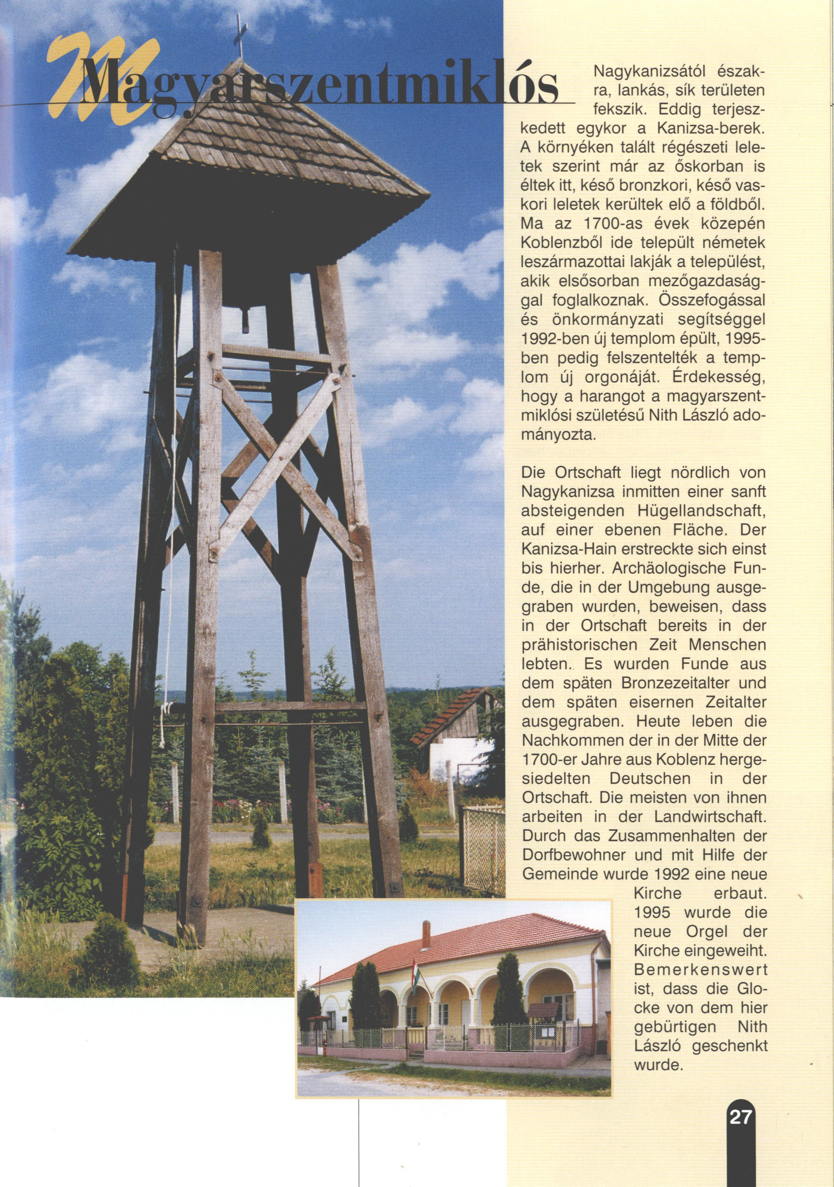 Nyilvános 2280 | 6551 | Magyarszentmiklós | Die Ortschaft liegt nördlich von Nagykanizsa inmitten einer sanft absteigenden Hügellandschaft, auf einer ebenen Fläche. Der Kanizsa-Hain erstreckte sich einst bis hierher. Archäologische Funde, die in der Umgebung ausgegraben wurden, beweisen, dass in der Ortschaft bereits in der prähistorischen Zeit Menschen lebten. Es wurden Funde aus dem späten Bronzezeitalter und dem späten eisernen Zeitalter ausgegraben. Heute leben die Nachkommen der in der Mitte der 1700-er Jahre aus Koblenz hergesiedelten Deutschen in der Ortschaft. Die meisten von ihnen arbeiten in der Landwirtschaft. Durch das Zusammenhalten der Dorfbewohner und mit Hilfe der Gemeinde wurde 1992 eine neue Kirche erbaut. 1995 wurde die neue Orgel der Kirche eingeweiht. Bemerkenswert ist, dass die Glocke von dem hier gebürtigen Nith László geschenkt wurde. Dieses Text stammt von: Titel: Hívogató a Régiók Kapujában - Útikönyv Látnivalók Nagykanizsán és Térségében (Einladend in dem Tor des Gebiets - Reisebuch - Sehenswürdigkeiten in Nagykanizsa und Umgebung) Herausgegeben von: Nagykanizsa és a Környező Települések Területfejlesztési Társulása (Verein für Gebietsentwicklung in Nagykanizsa und in ihrer Umgebung) 8800 Nagykanizsa, Petőfi Sándor út 5. Tel.: 06 93/536-453 • 06 93/536-454 Tel ./Fax: 06 93/326-323 E-mail: terstars@axelero.hu www.kanizsaterseg.celodin.hu |
