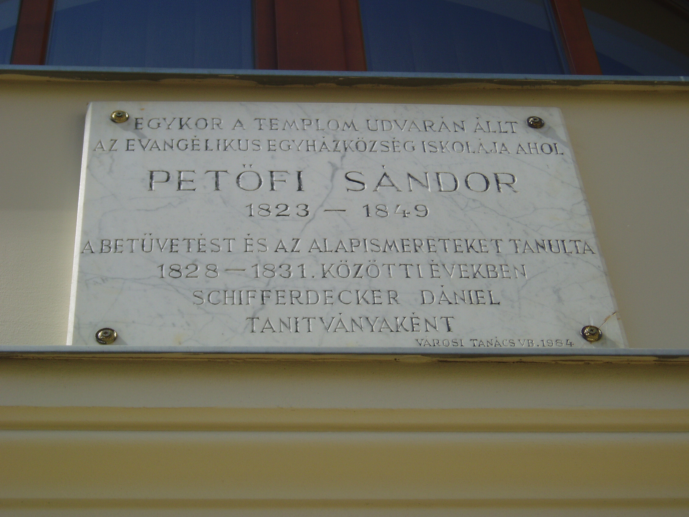 Nyilvános 1394 | 2535 | Kecskemét, Arany János utca 1. | Az Ybl Miklós által tervezett evangélikus templom mellett áll az Evangélikus Egyház Lelkészi Hivatalának épülete. Rajta márványtábla idézi Petőfi Sándor emlékét, aki itt, az egykor ezen a helyen állott elemi iskolában tanult kisiskolás korában. Egy másik, ugyanerre vonatkozó emléktáblát a közelben álló Szabadság tér 3. számú épületen is elhelyeztek. A fénykép 2006 augusztusában készült. Felh. irod.: Heltai Nándor: Kecskemét. Kecskeméti Lapok, 1998 |