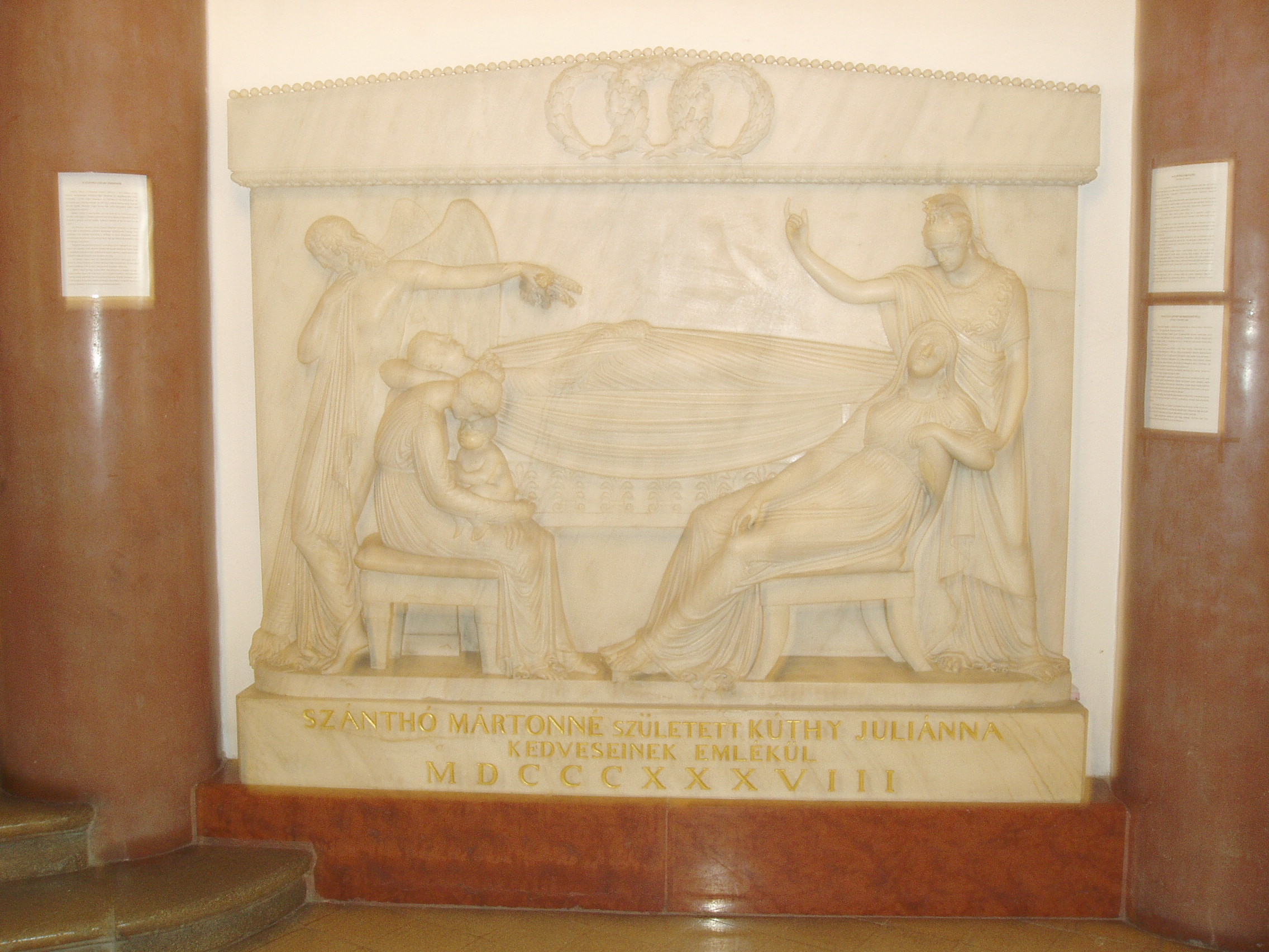 Nyilvános 1298 | 1941 | Kecskemét, Szabadság tér 7. Újkollégium | Református főgimnázium és jogakadémia céljára épült 1911–12-ben Mende Valér és Dombi Lajos tervei szerint. Kecskemét városközpontjának egyik legmeghatározóbb, várkastélyszerű épületének stílusában a jugendstil hazai válfaja az erdélyi építészet elemeivel keveredik. Homlokzati kerámiáit a világhírű pécsi Zsolnay–gyár készítette. A magasföldszintes előcsarnokban tekinthető meg a legnagyobb magyar klasszicista szobrászművész, Ferenczy István (1792-1856) művészettörténeti becsű, rusicai márványból készült 222x190 cm-es domborműve. Felirata: "Szánthó Mártonné, született Kuthy Julianna kedveseinek emlékül MDCCCXXXVII". Szánthó Márton (1765-1823) jómódú polgár és felesége, Kuthy Julianna (1787-1852) három gyermeke közül kettő egészen fiatalon meghalt. Férje halála után egy évtizeddel az özvegy napok alatt elvesztette lányát és egyetlen unokáját. A gyászoló asszony vagyonának egy részéből alapítványként két jogakadémiai katedra költségeit fedezte. Javainak másik részét egy jegyespárra: férje unokaöccsére, Karika Jánosra (Jókai tanárára) és saját unokahúgára, Rácz Rozáliára hagyta. Az összeházasodott fiatalok boldogságának 1852-ben a kolerajárvány vetett véget. A professzor, két nappal halála előtt, felesége koporsójánál hagyatékozta vagyonukat a református egyházra. A relief avatásán megjelent a szobrászművész, aki így mutatta be élete egyik fő művét: "A halál géniusza egyik kezével lefordított szövétnekre támaszkodva, a másikkal egy tele marok növényt és virágot örök álomhozónak hint, mintha az egész családot ki akarná irtani, s ennek hatalmától az atya, leány, s unoka elhalnak. Az atya gyászpadon feküdve ábrázoltatik, leánya fejénél ül elborult arccal csecsemő gyermekét tartva. Az atya lábánál az anya, keserveitől elborítva, égre függesztett szemekkel. Mögötte a tudományok istennője jelenik meg vigasztalólag, [...] mintha mondaná: Bízzál leányom, ha már családi örömeidet egészen elvesztéd is, azon pályán, melyre a tudományt és művészetet ápolva léptél, örömet lelsz és neved a háládatos maradéknál örökítended." Az Újkollégium dísztermében 1927. január 26-án és 1929. április 3-án Bartók Béla szólóestet adott. Koncertjét a terem bejáratánál emléktábla örökíti meg. A fénykép 2006 augusztusában készült. Felh. irod.: Heltai Nándor: Kecskemét. Kecskeméti Lapok, 1998 |