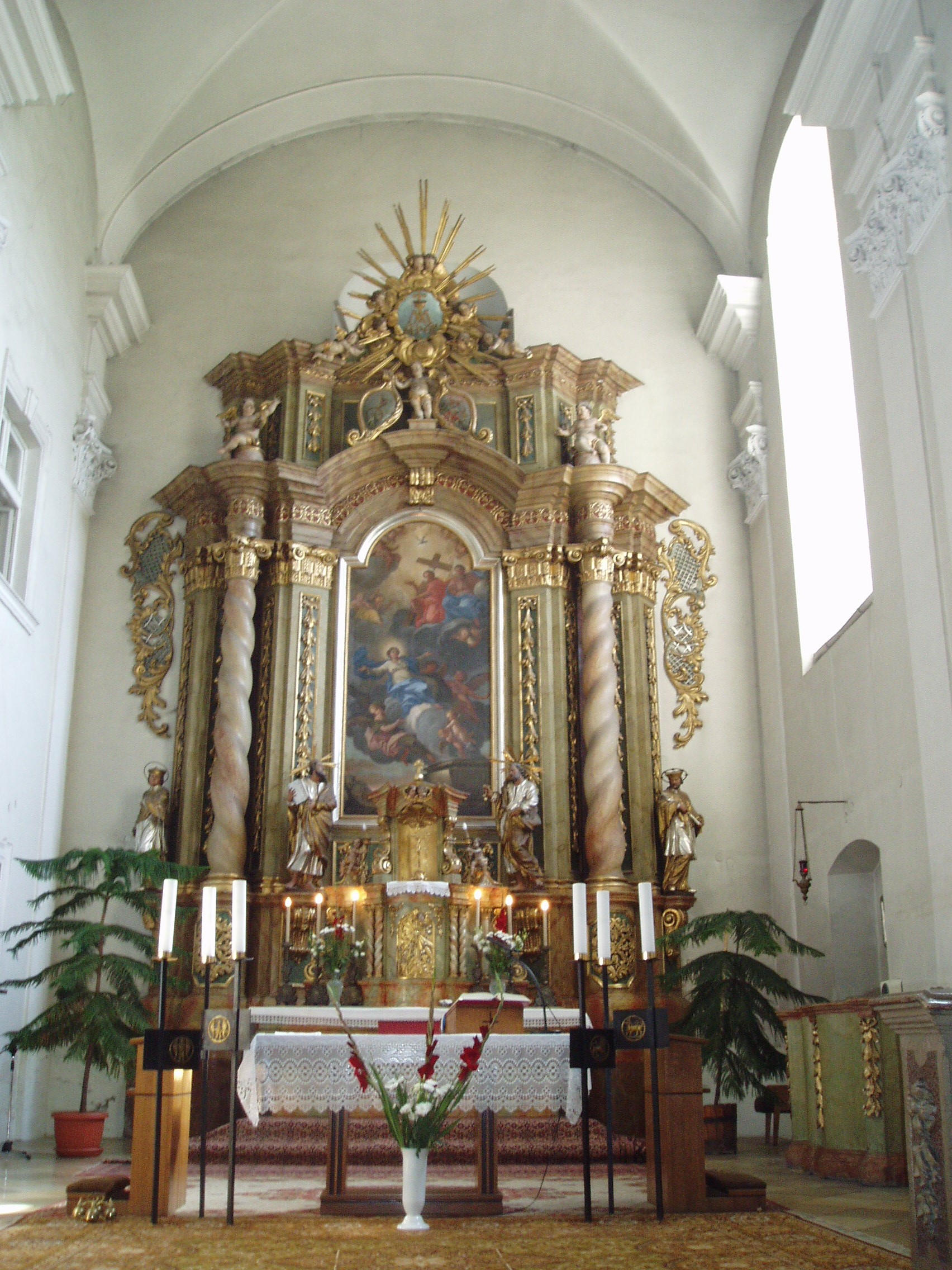 Nyilvános 1248 | 1794 | Kecskemét, Jókai utca 1. Piarista templom | A műemléki védelemmel óvott piarista templom és rendház a város legszebb barokk épületegyüttese. A piarista atyákat a város egyik földesura, gróf Koháry István telepítette le Kecskeméten a XVIII. század elején, s 1712-ben alapítványt is tett templomuk, rendházuk és iskolájuk felépítésére. Az épületegyüttes fokozatosan, több ütemben készült el. A templomot nagy valószínűséggel Mayerhoffer András tervezte. Mint Heltai Nándor helytörténész írja, a templom máig őrzi a reneszánszot felváltó új stílus, a barokk kezdeti frissességét, derűjét. A képen a Felvidéken készített, a Szentháromságot ábrázoló főoltár látható. A fénykép 2006 augusztusában készült. Felh. irod.: Heltai Nándor: Kecskemét. Kecskeméti Lapok, 1998 |