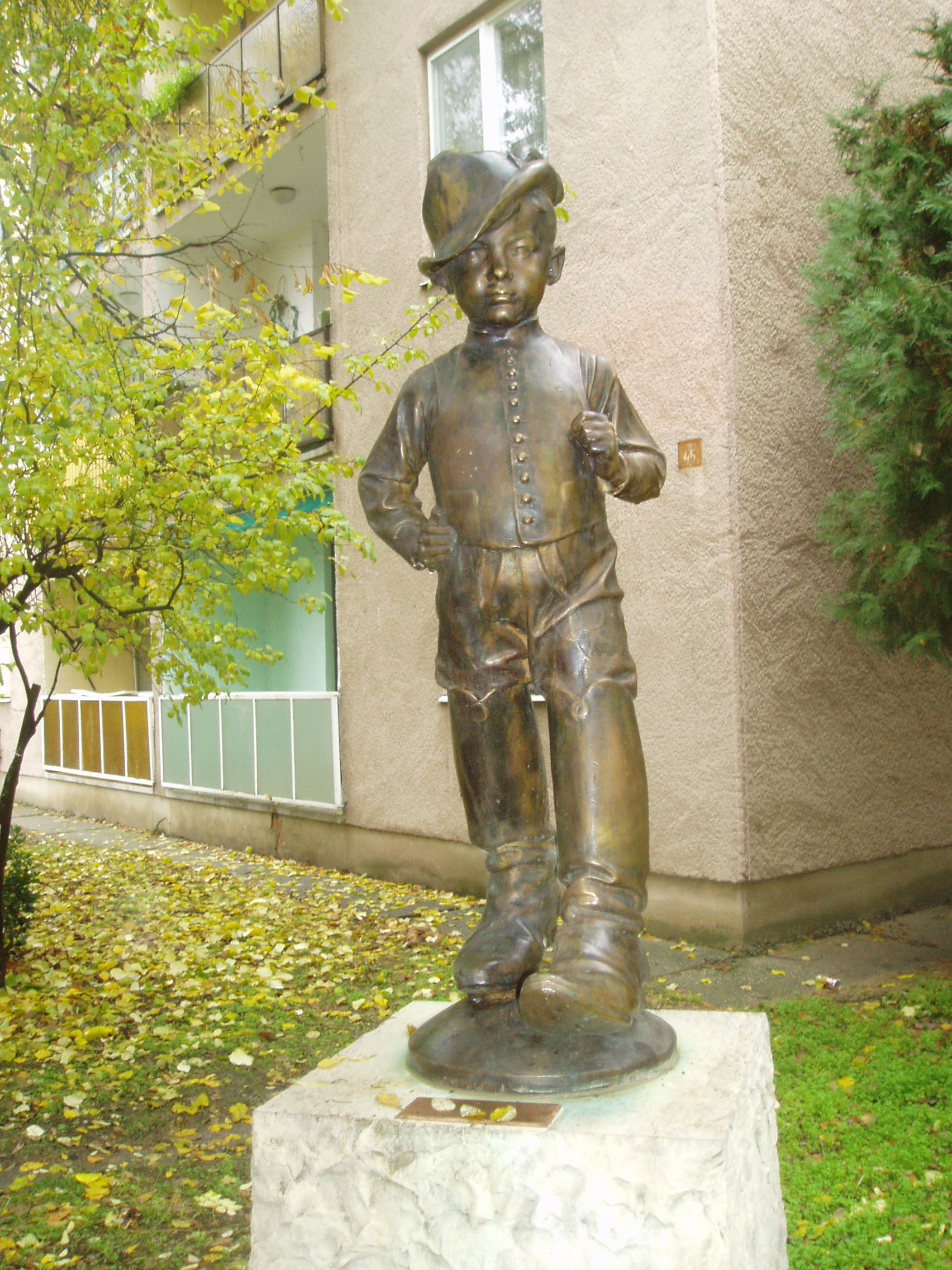 Nyilvános 1245 | 2170 | Baja, Kölcsey utca 45. Hüvelyk Matyi szobra | A József Attila lakótelepen, a Kölcsey utca 45. számú épület előtt áll Telcs Ede: Hüvelyk Matyi című kedves szobra. A kecskeméti Katona József Könyvtár honlapján közzétett "Történelmi és kegyeleti emlékhelyek" című összeállítás szerint a szobor csak másolat, eredeti példányát a Türr István Múzeum őrzi. Alkotója, Telcs Ede Baján született 1872-ben (lásd: Baja, Táncsics M. u. 28.). A fénykép 2007 októberében készült. |