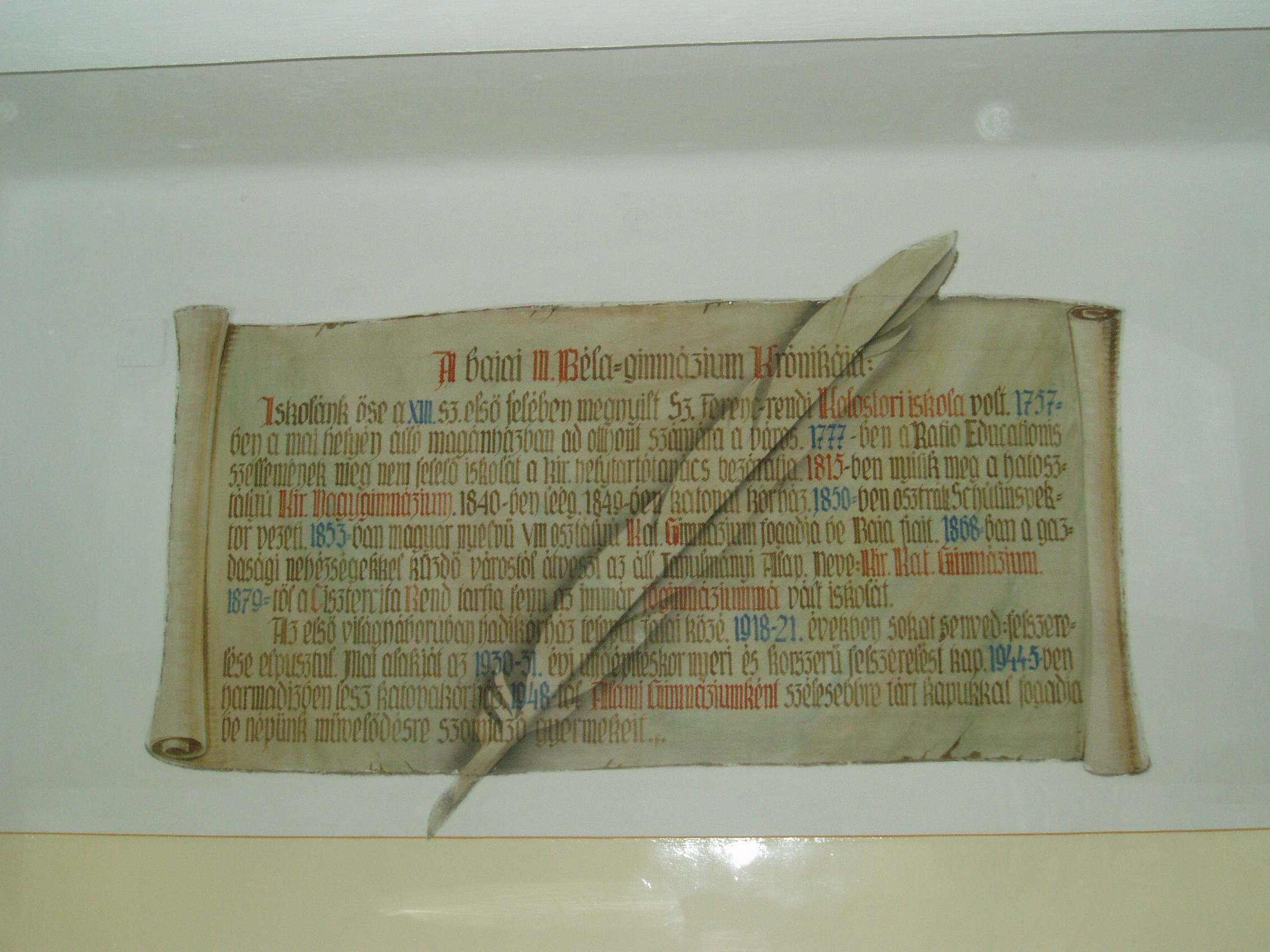 Nyilvános 1155 | 1572 | Baja, Szent Imre tér 5. III. Béla Gimnázium | A gimnázium krónikájának összefoglalása az előcsarnok falán. Az 1757-ben alapított iskola mai épületét 1815-ben emelték, majd 1892-ben és 1931-ben jelentősen bővítették, alakították. Korábban a közelben ma is álló ferences kolostorban (lásd: Baja, Bartók B. u. 1-3.) folyt a tanítás. Az intézmény a ferencesek után 1879-től a ciszterci rendé lett. III. Béla nevét, aki a ciszter rendet letelepítette Magyarországon, az 1921/22-es tanévben vette fel. Ma már szobra is ott áll az épület előtt. 1948 óta állami iskola. Híres növendéke volt Nagy Ignác író (1819–1821), Türr István (1835–1840), Tóth Kálmán költő (1839–1845), Szarvas Gábor nyelvész (1842–1848). Pályakezdőként az 1905/06-os tanévben itt tanított Babits Mihály. Az iskolának a zenei életben nevet szerzett diákjai is voltak. Ide járt gimnáziumba az 1902/03-as tanévtől nyolc éven át a bajai születésű Kun Imre (1892–1977), a legendás hangversenyrendező és az 1940-es évek elején a szintén Baján született Lukin László (1926–2004) zenepedagógus, karnagy. A fénykép 2007 októberében készült. Felh. irod.: Bálint László: A bajai III. Béla Gimnázium. Bp. Tankönyvkiadó, 1989 |