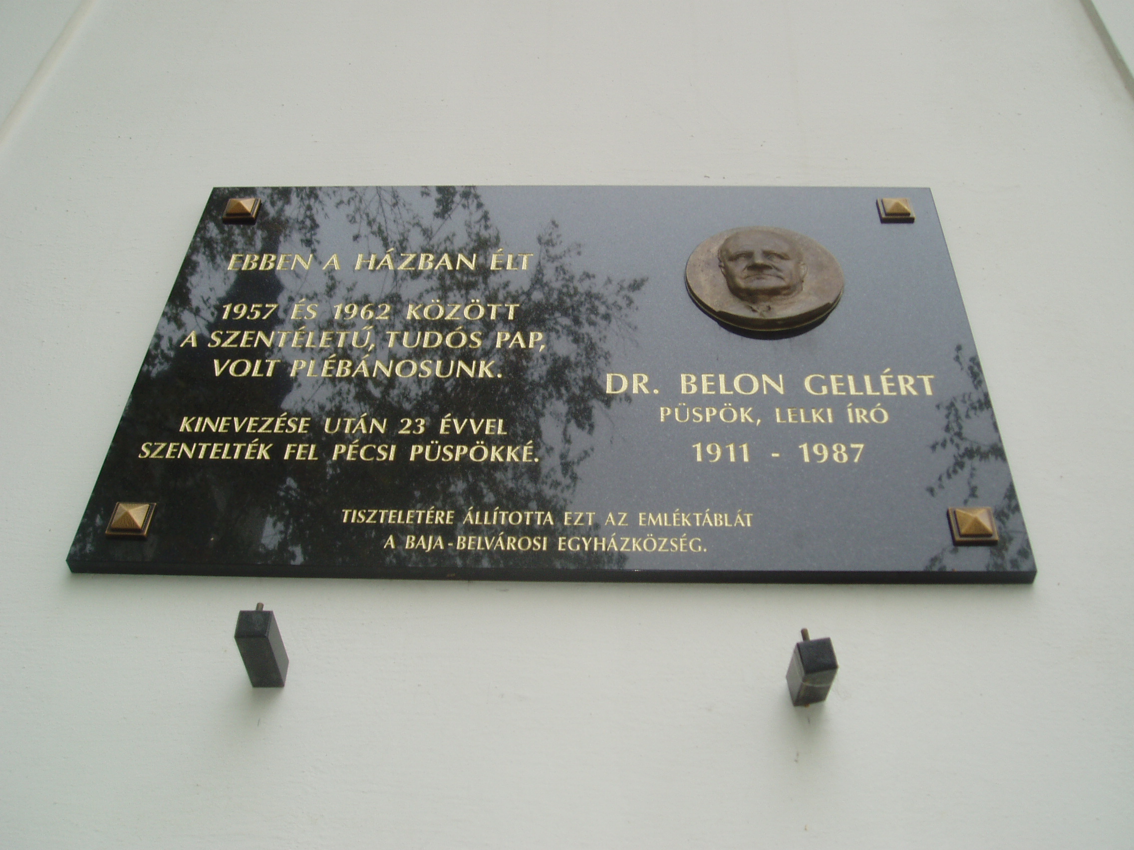 Nyilvános 1177 | 1615 | Baja, Szent Imre tér 6. R. k. plébániaház | A műemlék jellegű római katolikus plébániaház klasszicista stílusban épült újjá 1841-ben. Az oromzatán olvasható kronosztikonon a várost porig égető 1840. május 1-jei tűzvész napját örökítették meg. A tűzvész során elpusztult 1282 lakóház, 812 melléképület, 5 templom, a zsinagóga és a kórház, s 46 ember halt meg a tűzben. 1957 és 1962 között itt élt dr. Belon Gellért (1911-1987) plébános, későbbi pécsi püspök. A fénykép 2007 októberében készült. Felh. irod.: www.vendegvaro.hu |