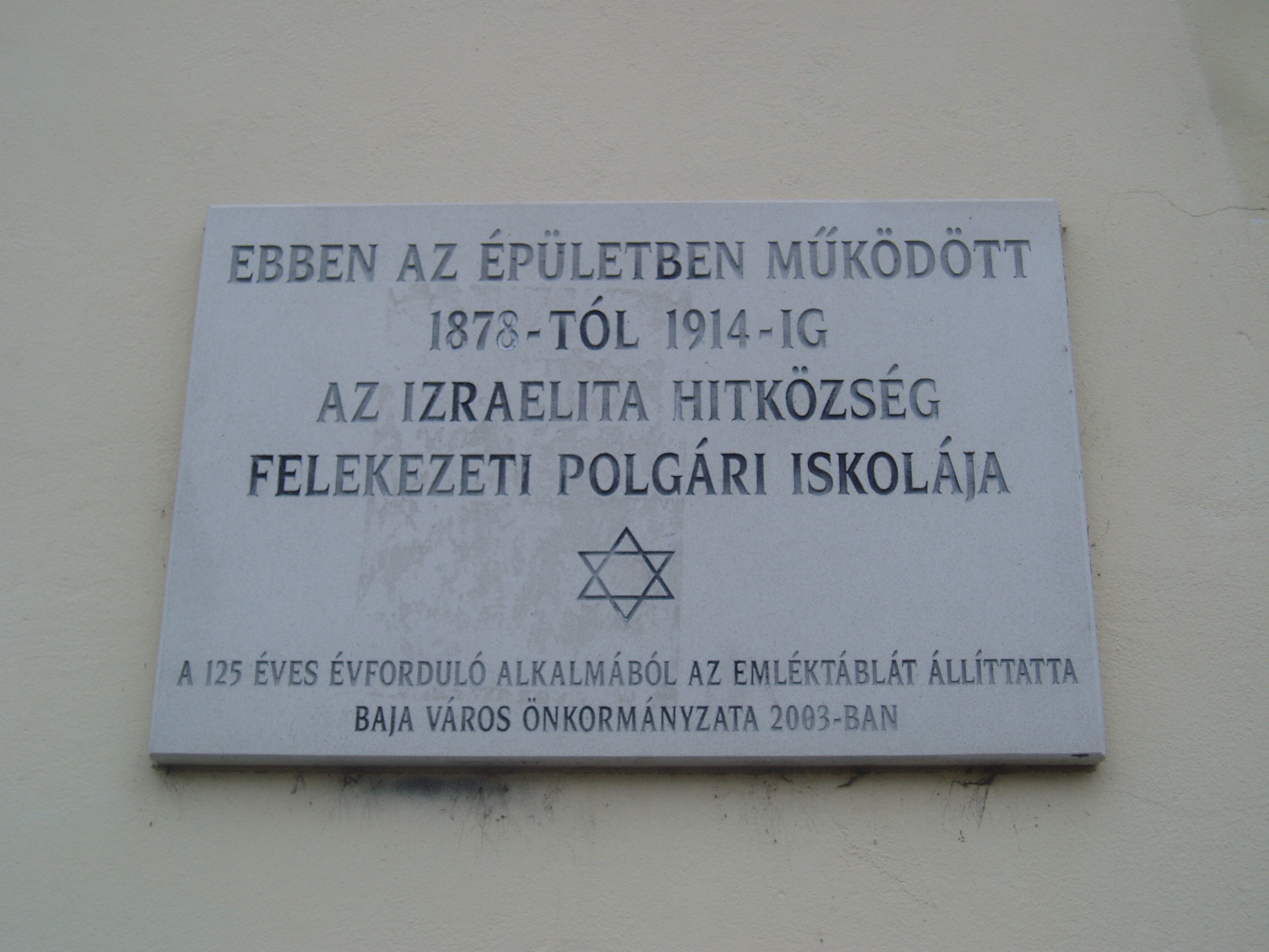 Nyilvános 1235 | 1635 | Baja, Telcs Ede utca 12. | A homlokzaton elhelyezett emléktábla tanúsága szerint ebben, a zsinagóga (lásd: Baja, Munkácsy u. 9.) mellett álló épületben működött 1878és 1914 között az Izraelita Hitközség polgári iskolája. Az épület ma az Ady Endre Városi Könyvtár gyermekrészlegének ad otthont. Bejárata mellett Ady Endre portédomborműve látható. A fénykép 2007 októberében készült. |