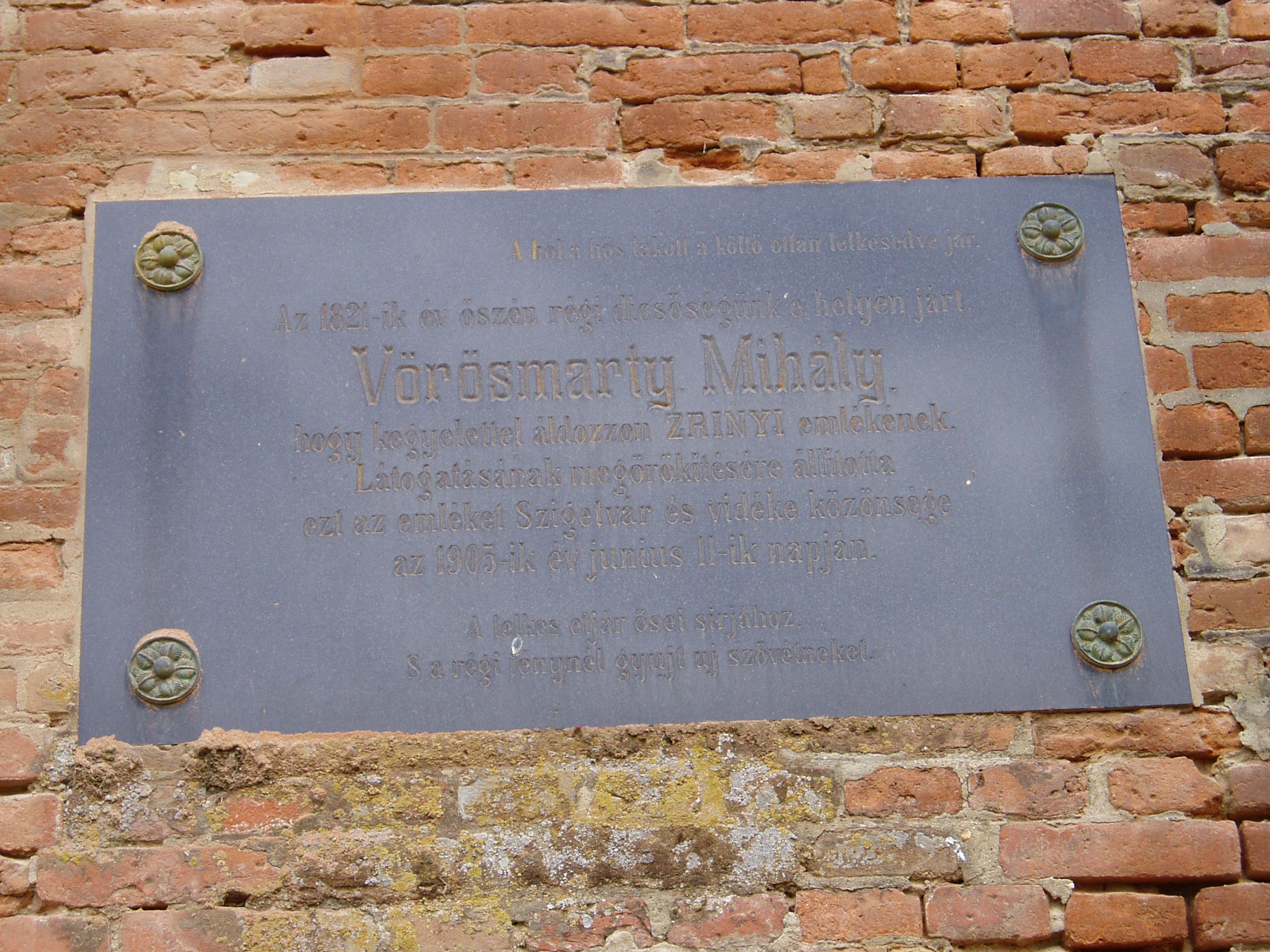 Nyilvános 1280 | 1935 | Szigetvár, Vár: Vörösmarty Mihály emléktáblája | A várban 1905-ben avatták fel Vörösmarty Mihály emléktábláját. A nagy magyar költő itt járt - az emléktábla felirata szerint - 1824 őszén, hogy kegyelettel adózzon Zrínyi Miklós történelmi tette előtt. Szigetvár című versét 1822-ben írta; lehet, hogy az emléktáblán nem pontos az évszám, vagy többször is járt ezen a helyen. Vörösmarty Mihály: Szigetvár Láttam veszélyes tájadat, oh Sziget! Előttem állott roskadozó falad, Előttem a múlt kor csatái S gyászba borúlt ege Hunniának. Itt késve mérgét nyelte az agg török; Itt táboroztak népei dölyfösen, Ott fenn erős, de számra kisded, S győzve fogyó hadaink tanyáztak. S onnan, ha kellett; mint az egek nyila A záporoknak vad zuhanási közt, Csattogva, sujtva, száz halálban Törtek alá rabölő haraggal. Kétszázezerrel víva meg egy marok Népség s vitái győztösek annyiszor, De ah! – borúlj el gyászhozó nap! – A diadal közepett enyésztek. Vagy mely tünő fény leng szemeim felé? A csendes éjnek rémi talán? – Vagy a Fagyos halálnak váza, vagy bús Képe az ősi idők fiának? Oh Zrínyi roncsolt képe, te vagy! Dicső Hős hajdan a vérfergetegek között, Rémítve villogsz most előmbe Századaink sanyarú korából: Duló vasat tart rettenetes karod, Elszánt komolyság terjedez arcodon, Lelkedben a szép hír, boszúság És kitörő harag ég szivedben. Mert vesztegelnek társaid a mezőn, Csatátlanul, rosz, gyáva tanács miatt, Míg téged a veszélyek útán Sírba viszen csapodár szerencse. Te a hazáért halni tudál; dicső! Mi nem tudunk már érte csak élni is; A támadó nap tudja, látja, A szomorún nyugovó, bününket. Mikor szününk meg bor, szerelem között A hon virultát messze felejteni? Mikor kerülhet vissza a künn Elpazarolt arany és dicsőség? Hajh elközelget majd az enyészet így! Eltörli a nép bajnoki tetteit: Megdőlnek a fajult vitézek, Sírjai hős eleik nevének. Börzsöny, 1822 A fénykép 2005 júniusában készült. |