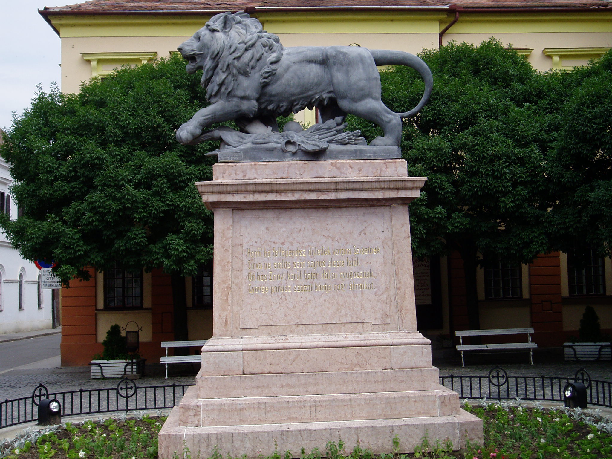 Nyilvános 1260 | 2123 | Szigetvár, Zrínyi tér: Oroszlános emlékmű | Zrínyi Miklós és a szigetvári hősök tiszteletére 1878-ban állították fel a Zrínyi tér északi részén az ún. oroszlános emlékművet. A szobor talapzatán Vörösmarty Mihály sorai olvashatók: "HONFI, HA FELLÉPENDSZ DÜLEDÉK VÁRÁRA SZIGETNEK, / SÍRVA NE EMLÍTS SZÓT SAJNOS ELESTE FELŐL, / OTT HŐS ZRÍNYI KÖRÜL BÁTOR DALIÁK NYUGOSZNAK, / GYÖNGE PANASZ SZÓZAT BÁNTJA NAGY ÁLMAIKAT." A fénykép 2005 júniusában készült. Felh. irod.: Látnivalók Pécsett és Baranyában. Miskolc, Well-PRess, 1998 |