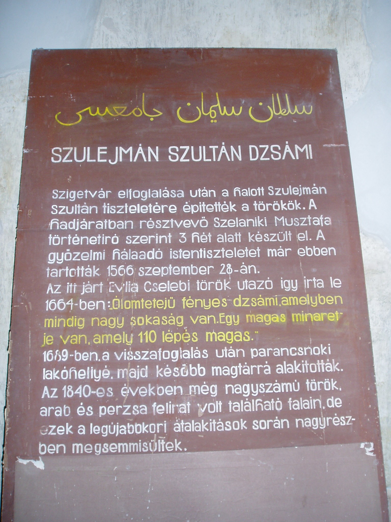 Nyilvános 1309 | 2075 | Szigetvár, Vár: dzsámi | A vár egyik központi épülete a Szulejmán dzsámi, amely a győztes szultán tiszteletére épült a XVI. században. A téglalap alaprajzú dzsámi Mekka felé néző oldalán látható a kőkeretes, egykor csempével borított, szalaktit boltozatú imafülke (mihrab). A dzsámit L alakú folyosó veszi körül, ennek délkeleti oldalán egy másik mihrab fülke található. Északnyugaton csatlakozik a dzsámihoz a szabályos tizennégyszög alakú minaret, amelynek nagy része a XVIII. században leomlott. A fénykép 2005 júniusában készült. Felh. irod.: Török műemlékek Magyarországon. = www.terebess.hu/keletkultinfo/minaret/szigetvar.html |
