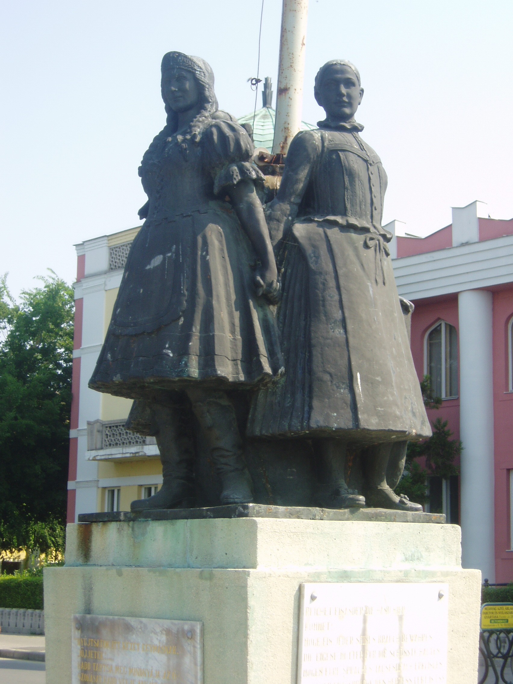 Nyilvános 1910 | 3795 | Mohács, Széchenyi tér | A Széchenyi tér a város fő tere, középpontjában emelkedik a Fogadalmi templom, keleti oldalán pedig az 1926-ban, a mohácsi csata 400. évfordulója alkalmából Árkay Aladár tervei szerint épített városháza. A városháza előtt 1932-ben állították fel Martinelli Jenő harmonikus szoborkompozícióját: a sokác, magyar és német népviseletbe öltözött lányok szoboralakja a nemzetiségek békés egymás mellett élése szimbólumaként fogja egymás kezét. A szobor talapzatán a nagy német drámaíró és költő, G. E. Lessing versrészlete olvasható: „Nyújtsatok itt kezet egymásnak, jöjjetek! Hadd tartsa meg mindnyája az ő szokását, Hadd vélje anyját szebbnek mindenkinél. Hadd járjon azután a nyelvetek ezer felé. A szívnek csakis egy nyelve van közöttünk!” A fénykép 2006 júliusában készült. Felh. irod.: Látnivalók Pécsett és Baranyában. Miskolc, Well-PRess, 1998 www.mohacs.hu www.vendegvaro.hu |