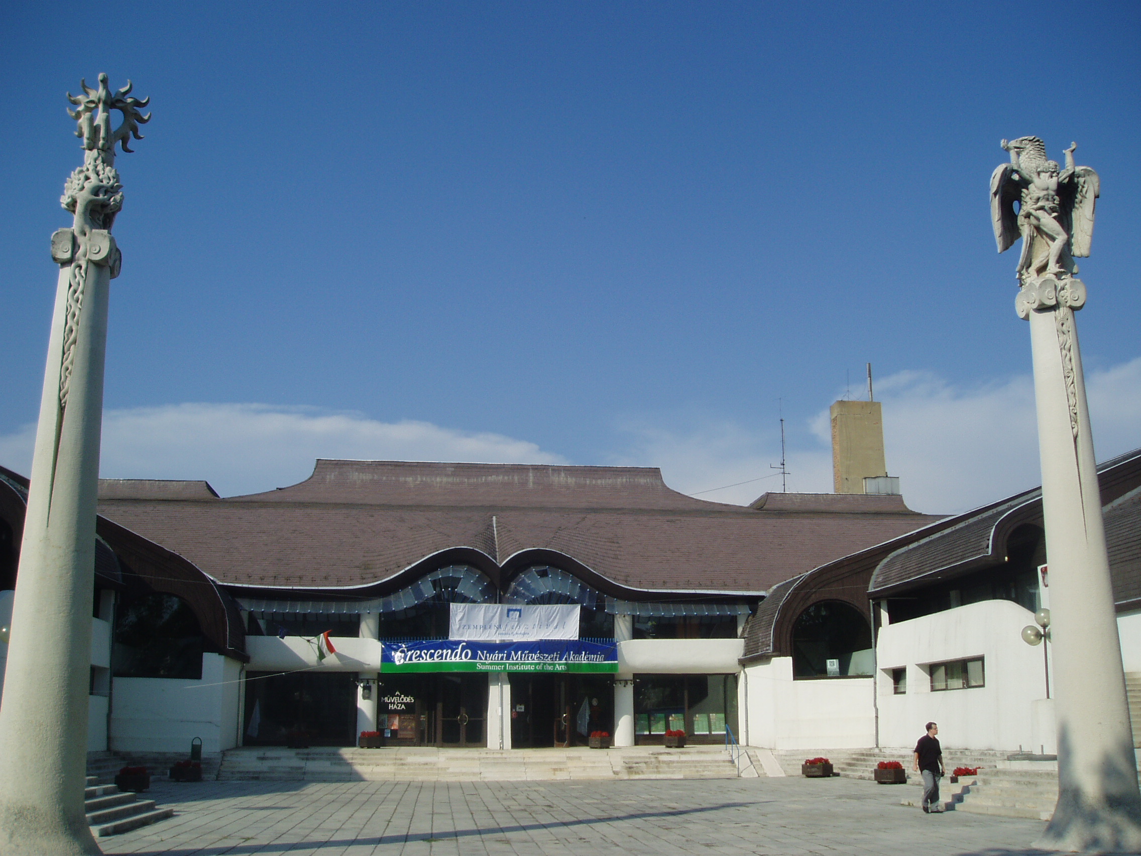 Nyilvános 1352 | 3000 | Rövid leírás | Teljes leírás (1.48 KB) | Sárospatak, Eötvös utca 21. A Művelődés Háza Sárospatak megújuló városképében nyomon követhető Makovecz Imre építész munkássága, aki több épületet tervezett a városban: a művelődési házon kívül az Árpád Vezér Gimnáziumot és a Hild tér lakóházait. A Művelődés Háza monumentális, látványos építészeti megoldásokban bővelkedő alkotás. A Kortárs magyar művészeti lexikon megállapítása szerint régészeti lelet formáját vette alapul: egy spirális, középen csappal-tengellyel ellátott díszcsat alakját. Az alaprajz szívében levő nagy színházterem a központ, innen futnak az erővonalak egészen a szélső, kisebb terekig. Megvalósítása az 1970-es évek végének politikai légkörében sok küzdelmébe került tervezőjének. Felépülése után az UIA Kairói Világkongresszusának zsűrije az 1983-as év tíz legfontosabb épületének egyikévé nyilvánította. Az épülethez szervesen kapcsolódik a főbejárat előtt álló oszlopokon a magyarság eredetére utaló két szobor, amelyek Péterffy László szobrászművész munkái. A fénykép 2007 augusztusában készült. Felh. irod.: Látnivalók Borsod-Abaúj-Zemplén megyében. Miskolc, Well-PRess, 1995 Kortárs magyar művészeti lexikon. Bp. Enciklopédia, 1999-2001 Magyarország a XX. században III. kötet. Szekszárd, Babits Kiadó, 1998 www.amuvelodeshaza.hu/bemutat.htm |