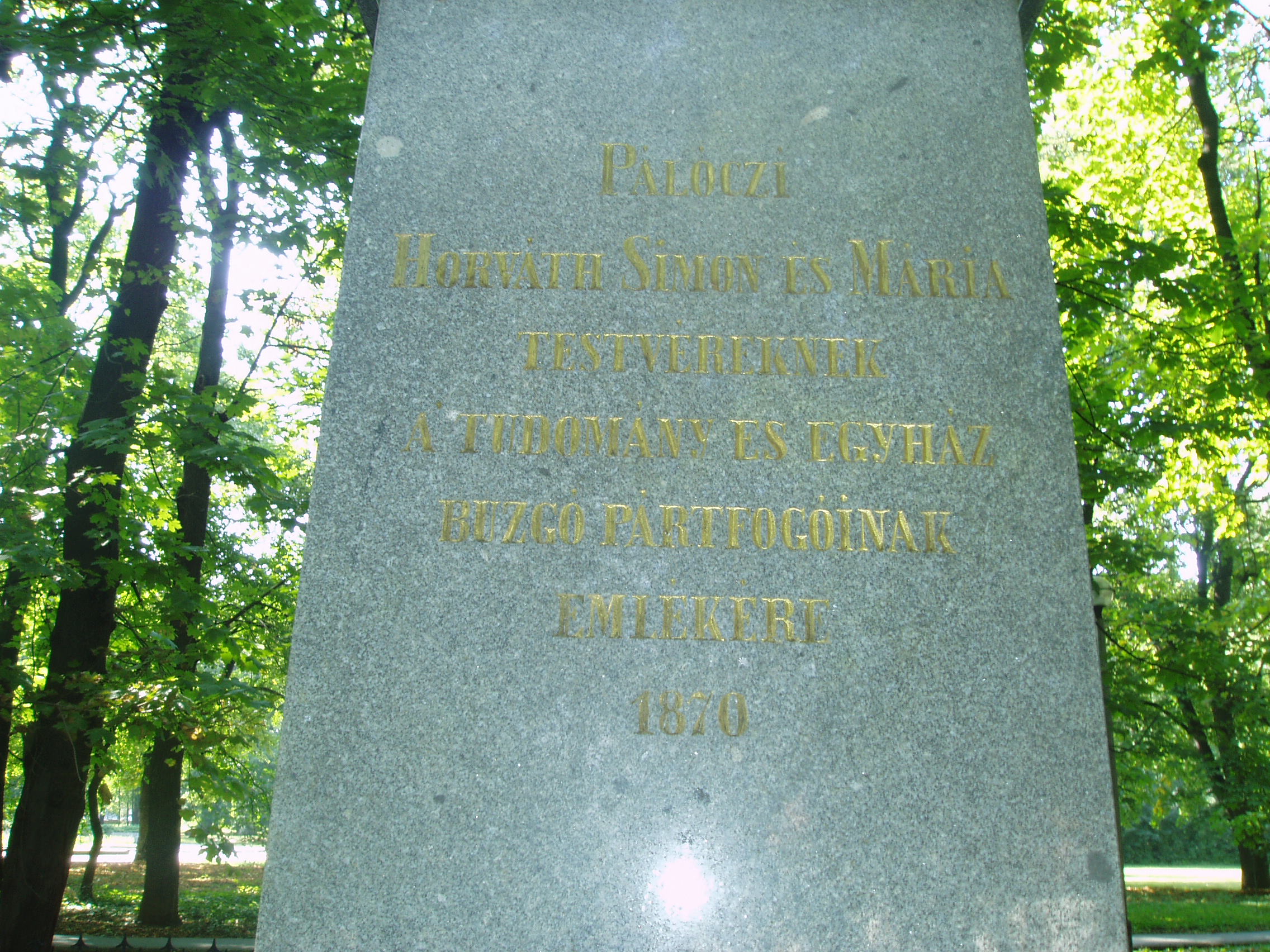Nyilvános 1222 | 1812 | Sárospatak, Iskolakert: Pálóczi-Horváth-emlékmű | A Református Kollégium (lásd: Sárospatak, Rákóczi u. 1.) bejáratával szemben találjuk az Iskolakertnek nevezett parkot. Az 1980-as években természetvédelmi területté nyilvánított Iskolakert sajátos nemzeti érték, mely egyedülálló az országban. Sétányai mentén Patakhoz kötődő jeles személyiségek szobrai állnak. 1870 körül avatták fel az Iskolakertben a Pálóczi-Horváth-testvérek emlékművét. Készítője báró Vay Miklós főiskolai gondnok, szobrászművész. Az álló alakos nő a tudomány múzsája, bal kezében nyitott könyv, benne Bacon-idézet: ”A tudomány hatalom.” Pálóczi-Horváth Simon és testvére, Mária a XIX. század második felében jelentős összegekkel támogatta a református kollégiumot. Az emléművet portrédomborművük díszíti. A fénykép 2007 augusztusában készült. Felh. irod.: Látnivalók Borsod-Abaúj-Zemplén megyében. Miskolc, Well-PRess, 1995 www.sarospatak.hu/nevezetessegek |