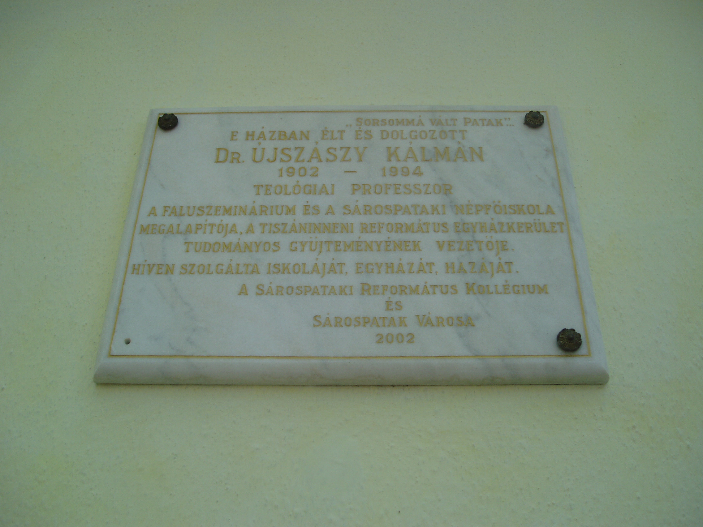 Nyilvános 1110 | 1676 | Sárospatak, Kazinczy utca 11. | 1817 és 1834 között ebben az épületben működött a Református Kollégium nyomdája. A ház később sok jeles közéleti, és főként az irodalom és művészet terén működő személyiség kiröpítő fészke lett. A hagyomány szerint többször megszállt benne Kossuth Lajos. A későbbi évtizedekben az Újszászy család tulajdonába került. Itt élt Dr. Újszászy Kálmán (1902-1994) teológiai professzor, akinek révén a kis ház Patak egyik szellemi központjává vált. Újszászy Kálmán Budapesten született 1902. december 13-án; a gimnáziumot is a fővárosban végezte el. 1921-től a sárospataki teológiára járt, 1931-ben ott lett teológiai akadémiai tanár, ezt megelőzően egy-egy évig Glasgow, Basel, Athén protestáns tanintézeteinek hallgatója volt. A pataki teológián a filozófiai-pedagógiai tanszéket vezette, 1932-ben filozófiai doktorátust szerzett Debrecenben, 1939-ben Szegeden egyetemi magántanári képesítést nyert A falunevelés szellemi alapjai című értekezésével. 1931-től a Sárospatakon kibontakozó faluszeminárium, 1936-től a népfőiskola egyik irányítója, 1944-1946 között a főiskola rektora volt. A népfőiskola 1948-ban - kényszerűen - megszűnt, a református intézmények közül a tanítóképzőt 1950-ben, a gimnáziumot 1952-ben államosították. 1951-ben megszüntették a teológiát is, amely 1992-ben kezdte meg újra a működést. Újszászy professzor 1948 után a kollégium főkönyvtárosa, 1951-től a Tiszáninneni Református Egyházkerület Tudományos Gyűjteményeinek szervezője, 1952-től a Magyarországi Református Egyház zempléni egyházmegyéjének gondnoka, 1964-től 1990-ig pedig a Tiszáninneni Egyházkerület főgondnoka volt. Emellett 1969-től ügyvezető elnöke, 1971-ben pedig elnöke az Országos Református Gyűjteményi Tanácsnak. A fénykép 2007 augusztusában készült. Felh. irod.: Balassa Iván: Sárospatak történeti helyrajza, XVI-XX. század. Miskolc, Borsod-Abaúj-Zemplén Megyei Levéltár, 1994 Takács Béla: A sárospataki nyomda története. Bp. Magyar Helikon, 1978 Benda Kálmán beszélgetése a 90 esztendős Újszászy Kálmánnal. = Confessio 1993. 3. |