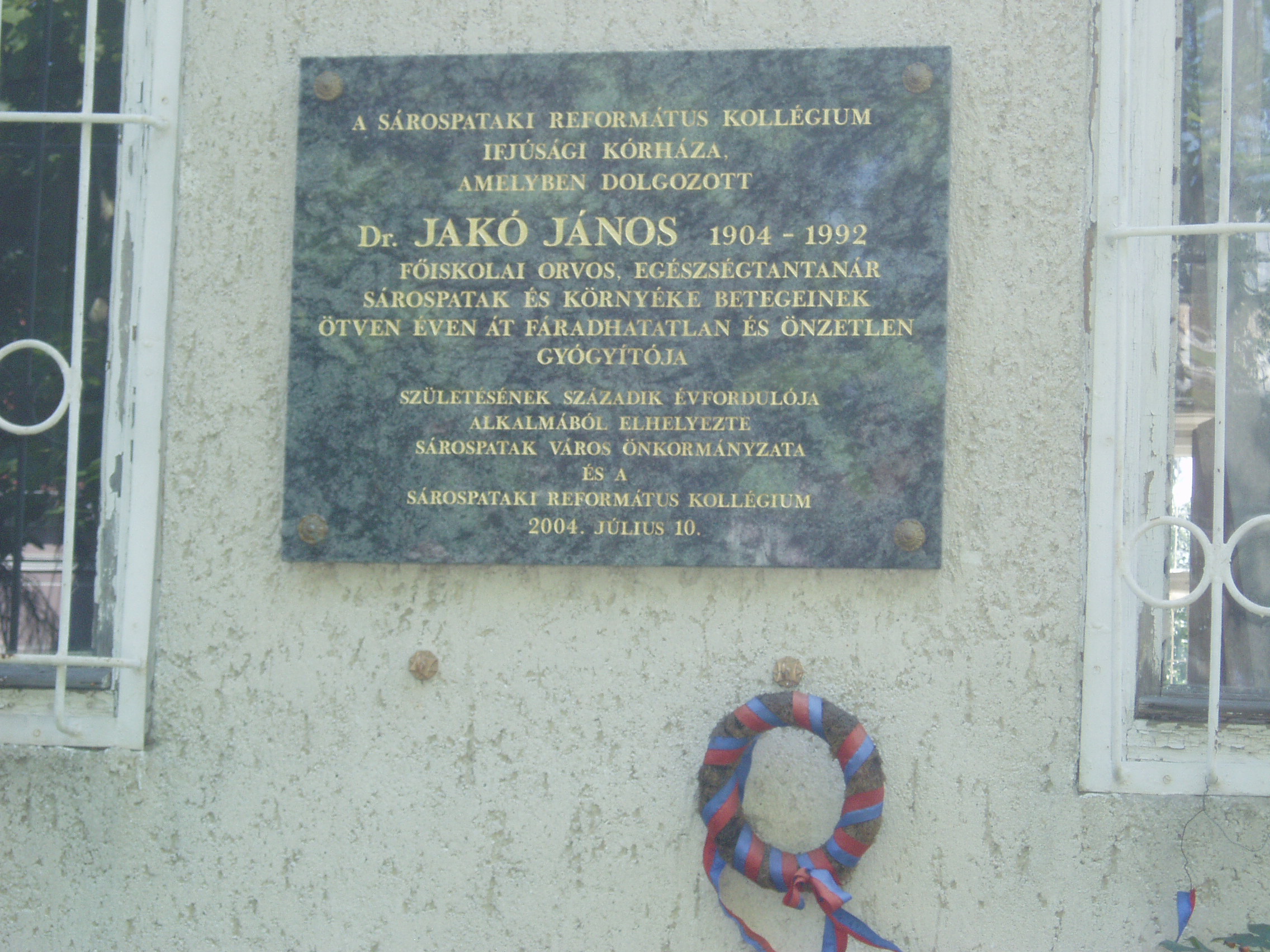 Nyilvános 1153 | 1856 | Sárospatak, Kazinczy utca 25. | A ma kollégiumként működő épületben egykor a Református Kollégium ifjúsági kórháza működött. Itt dolgozott Dr. Jakó János (1904-1992) iskolaorvos, egészségtanár. A kis kórházat 1937-ben az ő intenciói alapján élpítették fel. 1952 után körzeti orvosként gyógyította fáradhatatlanul és önzetlenül a környék betegeit. Emléktábláját 2004-ben, születése 100. évfordulója alkalmából állították. A fénykép 2007 augusztusában készült. Felh. irod.: Száz éve született dr. Jakó János. = Sárospataki Református Lapok 2004. 3. |