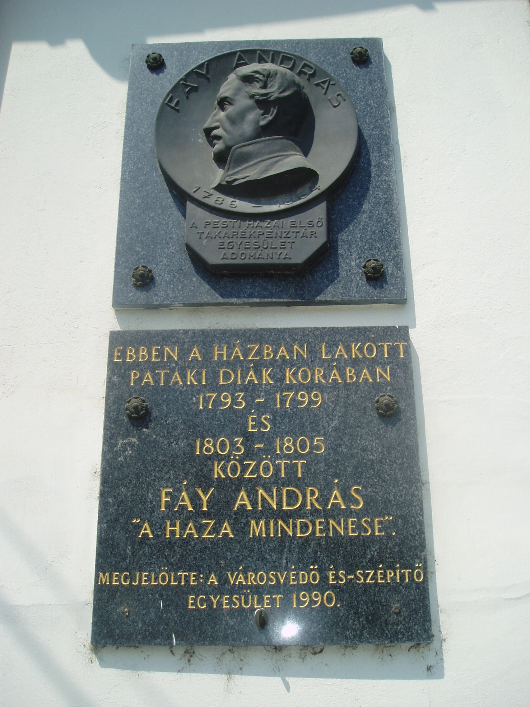Nyilvános 1110 | 1763 | Sárospatak, Kossuth utca 22. | A homlokzatán 1990-ben elhelyezett emléktábla tanúsága szerint ebben a házban lakott pataki diák korában, 1793-1799 és 1803-1805 között Fáy András, "a haza mindenese", Alakját az Iskolakertben mellszobra idézi (lásd: Sárospatak, Iskolakert: Fáy András). A fénykép 2007 augusztusában készült. |