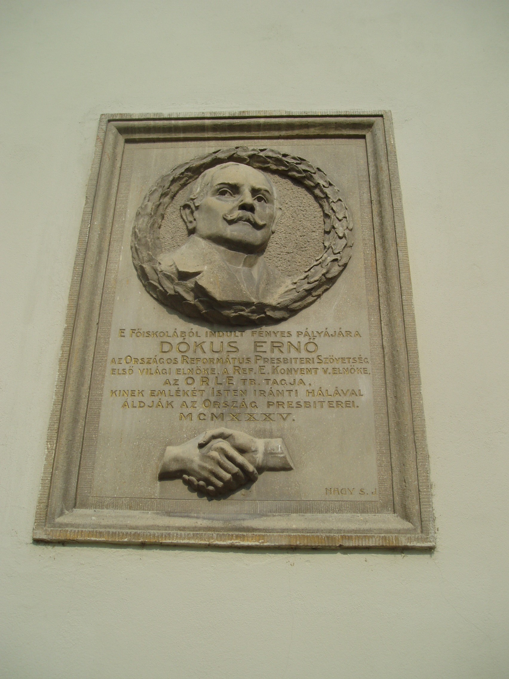 Nyilvános 1155 | 1700 | Sárospatak, Rákóczi utca 1. Református Kollégium | A kollégium főépülete, a Nagy Kollégium a Rákóczi út északi végén található, mely 1804–1814 között korai klasszicista stílusban épült. Szép ráccsal ellátott, háromíves nyílású kapuzat vezet be az un. „nagyportá”-ba, amelyet két sor vaskos pillér három hajóra oszt. Kétoldalt a falakon az iskolatörténet néhány fontosabb eseményének, illetve a kollégium nagy alakjainak domborművű ábrázolásait helyezték el. A képen Dókus Ernő egykori pataki diák, az Országos Református Presbiteri Szövetség első világi elnöke domborműves emléktáblája látható. A fénykép 2007 augusztusában készült. Felh. irod.: Détsy Mihály: Sárospatak. Bp. Corvina, 1974 Látnivalók Borsod-Abaúj-Zemplén megyében. Miskolc, Well-PRess, 1995 www.sarospatak.hu/nevezetessegek |