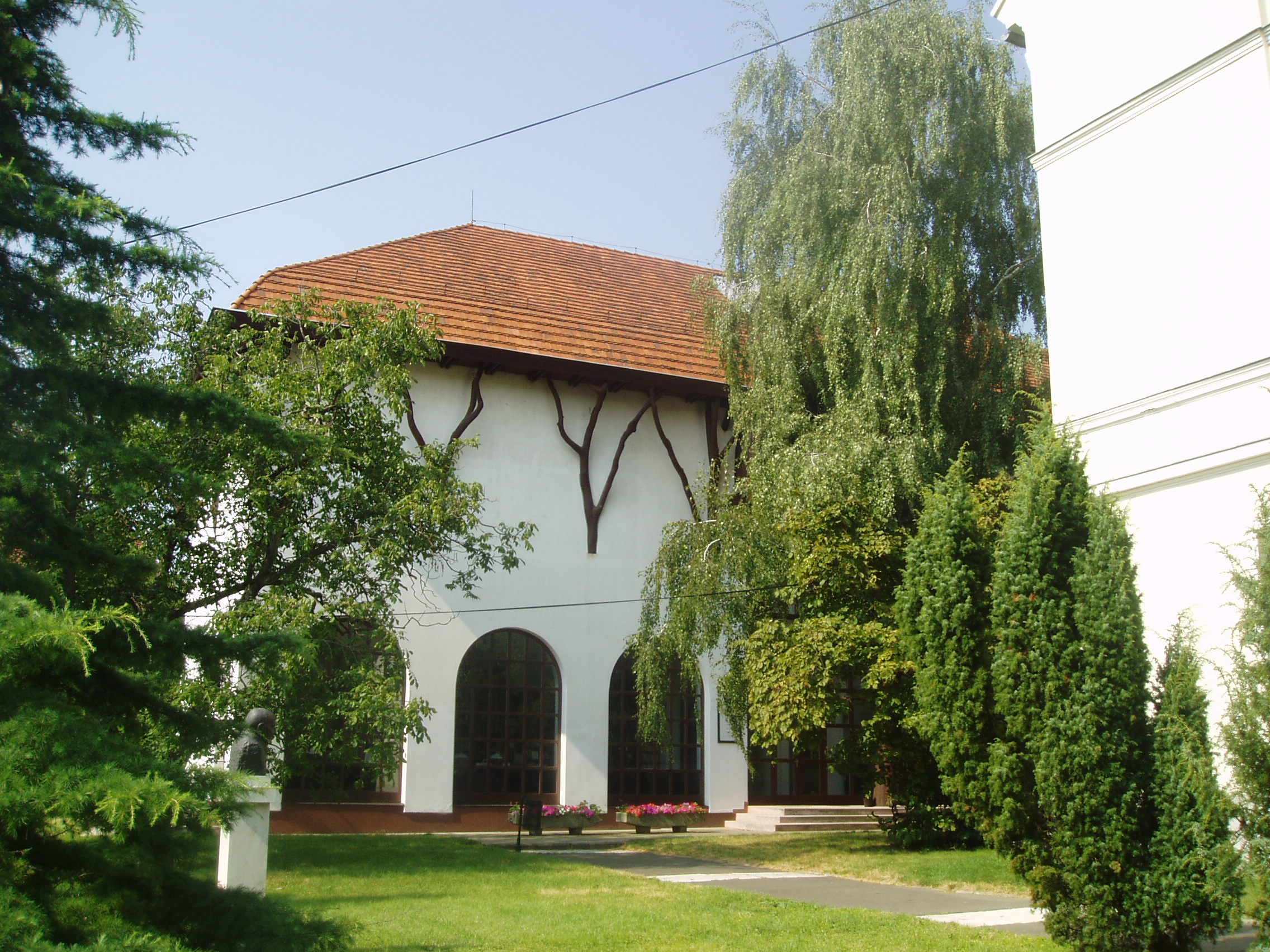 Nyilvános 1129 | 1663 | Sárospatak, Rákóczi utca 1. Református Kollégium Repositoriuma | A Kollégium udvarán jobbra emelkedik a Makovecz Imre által tervezett, 1986-ban emelt Repositorium. Az épület a könyvtári, levéltári, adattári raktárak mellett helyet ad jeles személyiségek - többségükben egykori pataki diákok - hagyatékának, könyvgyűjteményének. Itt van Béres Ferenc zenei könyvtára (1988); Cs. Szabó László londoni könyvtára (1985); Halmi Róbert modern angol nyelvű könyvtára (1987); Király István irodalomtörténeti gyűjteménye (2006); Szathmáry Lajos amerikai magyar emigrációs hagyatéka (1987); Vitéz Ferenc amerikai magyar református püspök könyvtára (2002). A fénykép 2007 augusztusában készült. Felh. irod.: Látnivalók Borsod-Abaúj-Zemplén megyében. Miskolc, Well-PRess, 1995 |