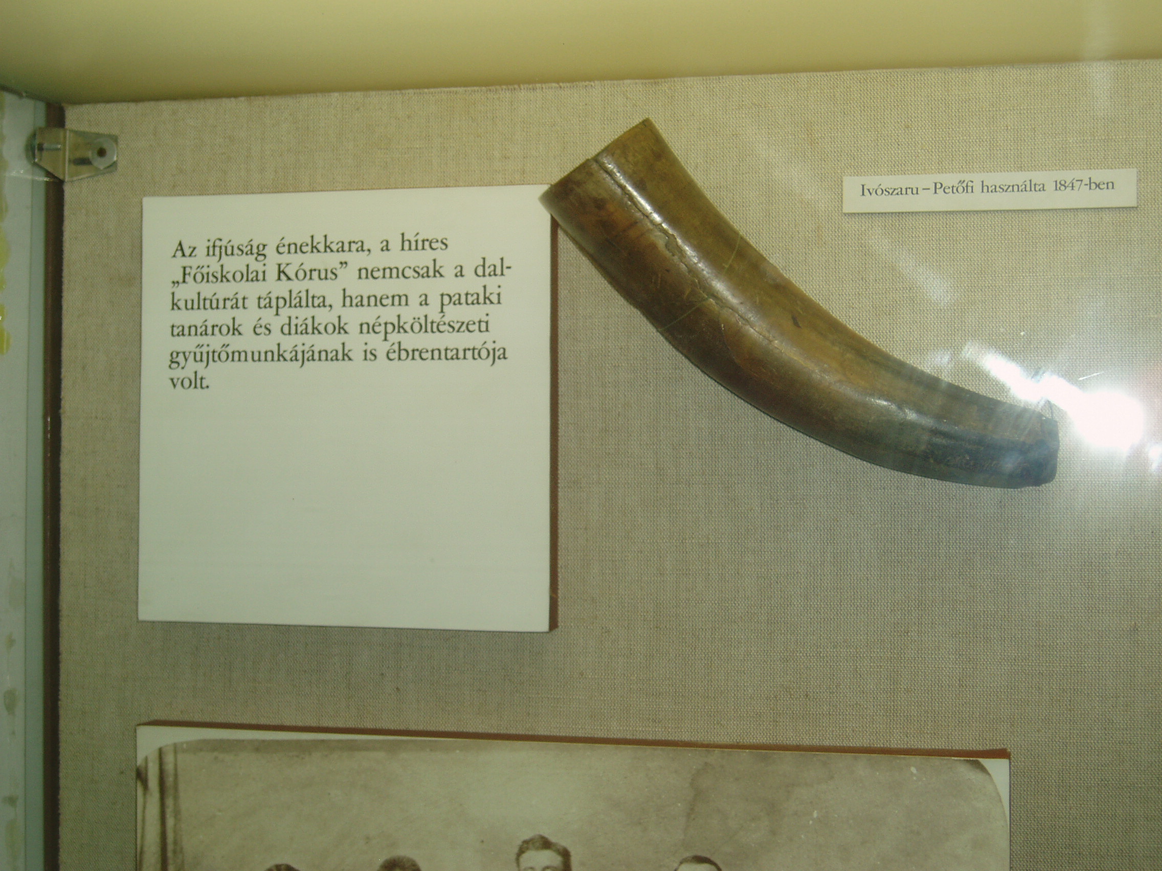 Nyilvános 1151 | 1570 | Sárospatak, Rákóczi utca 1. Református Kollégium | A Kollégium főépületének szárnyai által határolt tágas udvarban áll a régi iskolaépületek utolsó maradványa, az ún. Berna-sor. 1771/72-ben a fizika oktatása számára és a fizikaprofesszor lakásául épült. Az egyemeletes, hosszú szárny déli oldalát később kétszintes, árkádos tornáccal bővítették, feljáróval a nyugati oldalon. Az épület a korabeli provinciális magyar építészet szép példája. Az emelet boltozott termeiben a kollégium történetét bemutató kiállítást rendeztek be. A képen a Petőfi Sándor pataki látogatása alkalmából a költő által használt ivószaru látható. Petőfi 1847. július 9-én, útban menyasszonyához szállt meg Patakon. Vendéglátója Pálkövy Antal tanár volt (lásd: Sárospatak, Rákóczi utca 17.). A Kollégium énekkara vidám estét rendezett számára. A fénykép 2007 augusztusában készült. Felh. irod.: Détsy Mihály: Sárospatak. Bp. Corvina, 1974 |