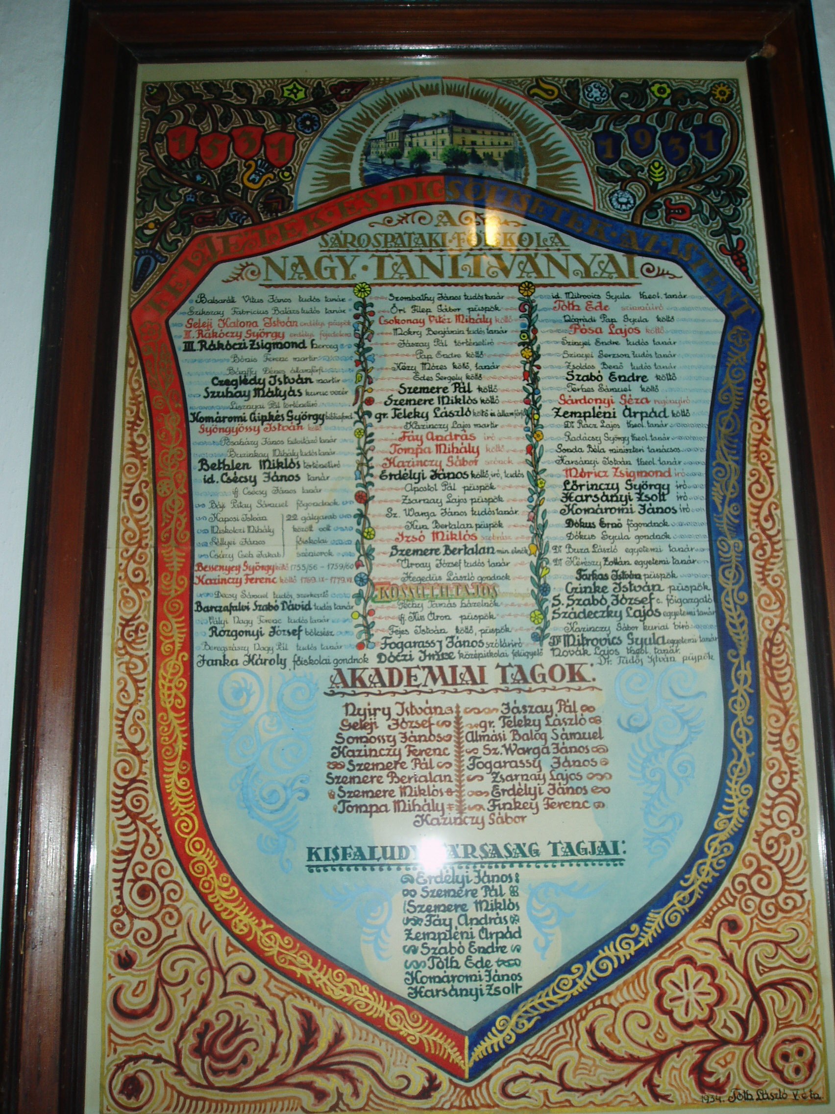 Nyilvános 1152 | 1654 | Sárospatak, Rákóczi utca 1. Református Kollégium | A Kollégium főépületének emeleti folyosóján található ez a kézzel festett tábla, mely az intézmény jeles diákjainak neveit örökíti meg. A fénykép 2007 augusztusában készült. |