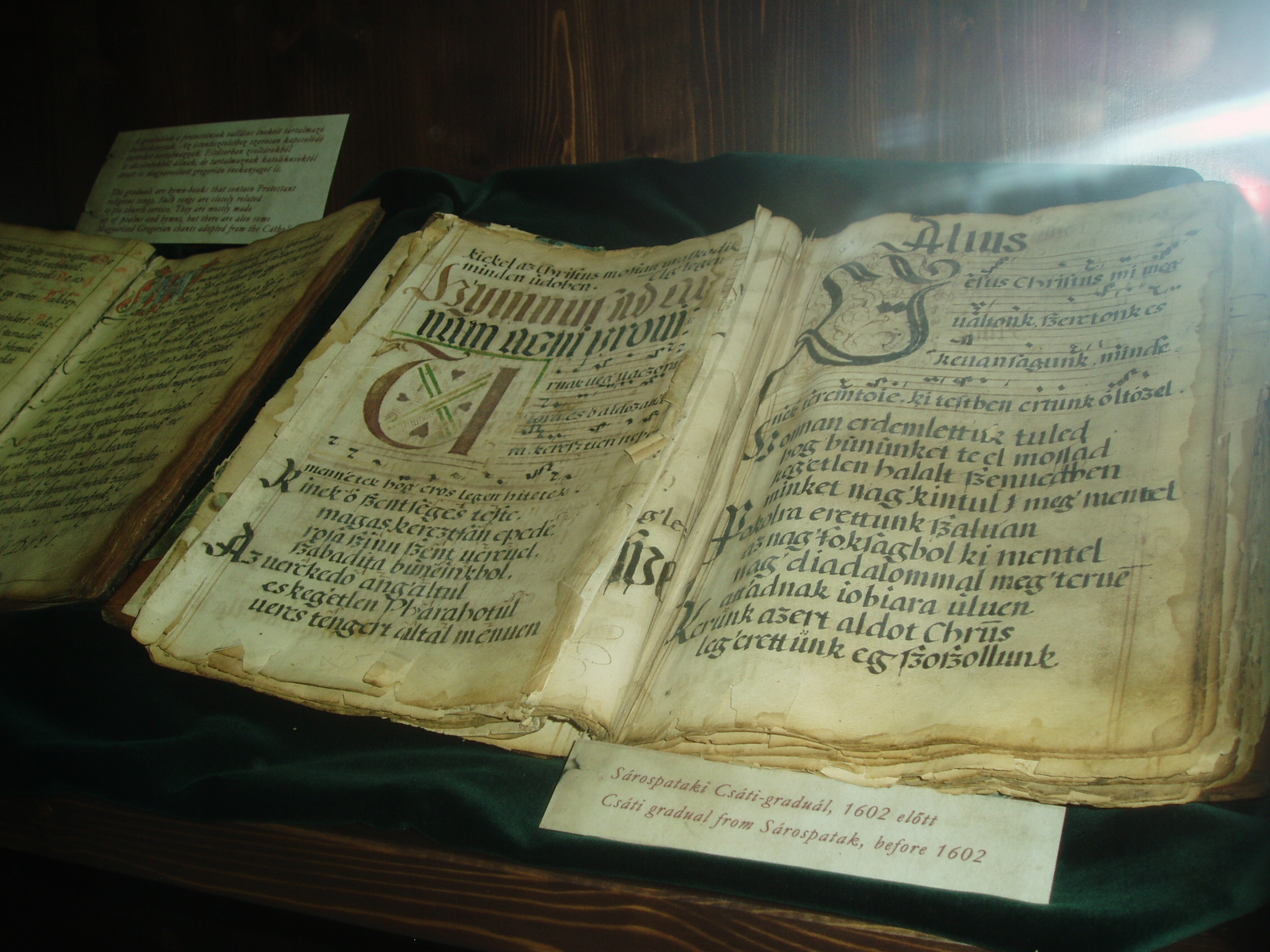 Nyilvános 1164 | 1601 | Sárospatak, Rákóczi utca 1. Református Kollégium könyvtára | Az 1531-ben alapított Sárospataki Református Kollégium könyvtára évszázadok óta az ország egyik legértékesebb könyvgyűjteménye. A második világháború előestéjén, 1938-ban állománya legbecsesebb részét Budapestre menekítették. Sajnos, nem lehetett előre látni, hogy a Sárospatakot elfoglaló szovjet csapatok megkímélték a kollégiumi könyvtárat, míg a Budapestre került kötetek a hadi események során eltűntek. Sorsukról sokáig semmit sem lehetett tudni, csak harminc év múlva derült ki, hogy a Nyizsnyij Novgorod-i Lenin Könyvtár egy részlegében őrzik őket. A rendszerváltás után tárgyalásokba lehetett bocsátkozni visszaadásukról, amelyre, sok vita után 2006. áprilisában kerülhetett sor. A hazatért 16–17. századi könyvek értéke nem pusztán azért felbecsülhetetlen, mert könyvritkaságokról van szó, hanem azért is, mert az elmúlt századokban ezeket a könyveket olvasták a kollégium diákjai, tanárai. A 96 latin, 33 magyar és 6 német nyelvű könyv több mint hatvan százaléka imádságoskönyv, a többi orvosi, jogi, történeti és útleíró mű. A visszaadott dokumentumok egyik nagy értéke a képen látható Csáti graduál. Az 1602 körül keletkezett kéziratos énekeskönyv 41 XVII. század előtti egyházi éneket tartalmaz. Bejegyzése szerint: „…Találtatott Tsáton… Szabó István urnál … a sárospataki reformata anya oskolának ajándékozta tiszt. Nagy Ferencz Ur 1799ik esztendőben.” A fénykép 2007 augusztusában készült. Felh. irod.: Détsy Mihály: Sárospatak. Bp. Corvina, 1974 www.gradatio.hu/nagykonyvtar Fehér Katalin: Hazatértek a sárospataki könyvek. = Könyv és nevelés 2006. 2. www.hik.hu/tankonyvtar/site/books/b91/ch03.html |