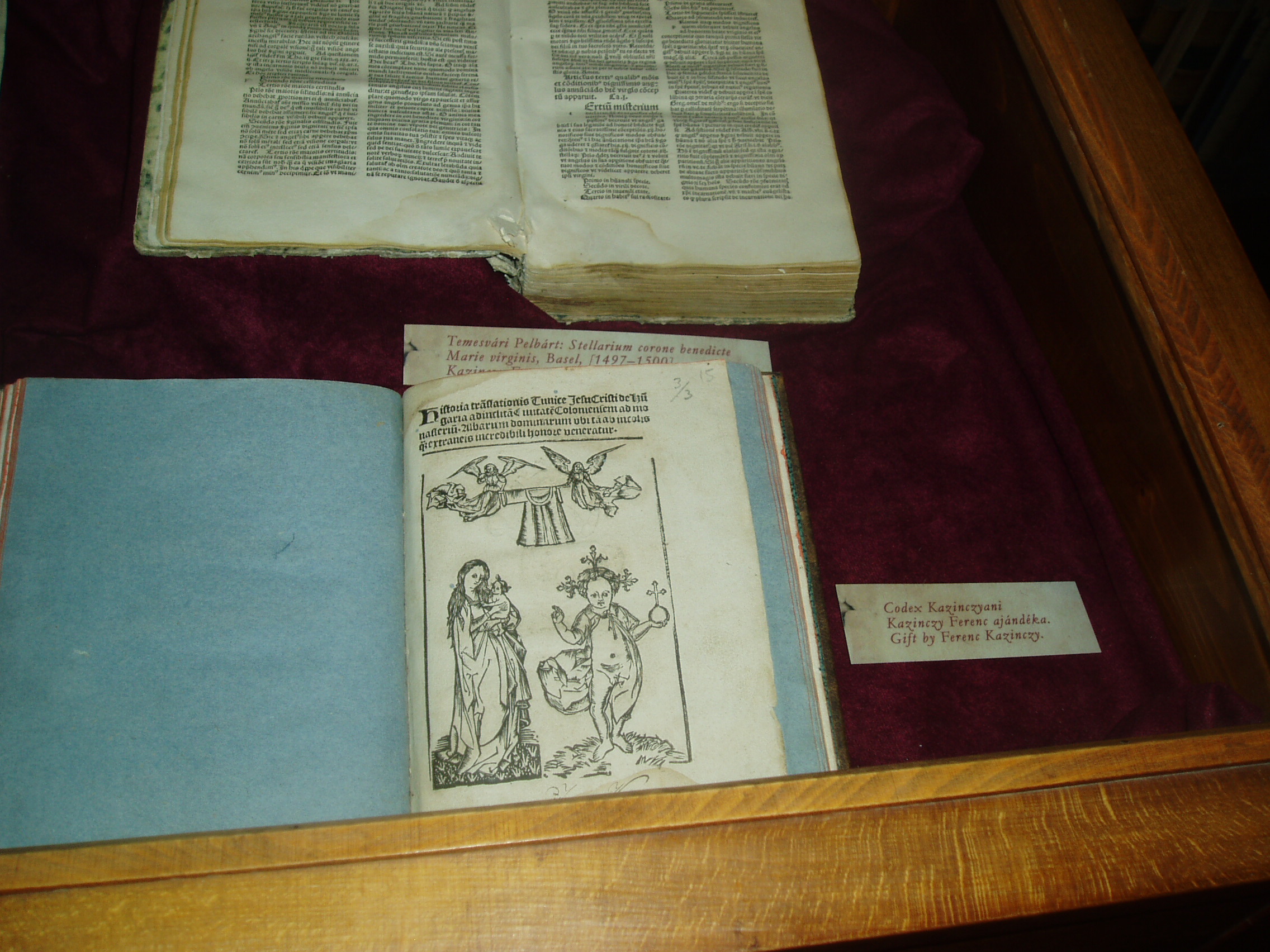 Nyilvános 1127 | 1729 | Sárospatak, Rákóczi utca 1. Református Kollégium könyvtára | Az 1531-ben alapított Sárospataki Református Kollégium könyvtára évszázadok óta az ország egyik legértékesebb könyvgyűjteménye. A második világháború előestéjén, 1938-ban állománya legbecsesebb részét Budapestre menekítették. Sajnos, nem lehetett előre látni, hogy a Sárospatakot elfoglaló szovjet csapatok megkímélték a kollégiumi könyvtárat, míg a Budapestre került kötetek a hadi események során eltűntek. Sorsukról sokáig semmit sem lehetett tudni, csak harminc év múlva derült ki, hogy a Nyizsnyij Novgorod-i Lenin Könyvtár egy részlegében őrzik őket. A rendszerváltás után tárgyalásokba lehetett bocsátkozni visszaadásukról, amelyre, sok vita után 2006. áprilisában kerülhetett sor. A hazatért 16–17. századi könyvek értéke nem pusztán azért felbecsülhetetlen, mert könyvritkaságokról van szó, hanem azért is, mert az elmúlt századokban ezeket a könyveket olvasták a kollégium diákjai, tanárai. A 96 latin, 33 magyar és 6 német nyelvű könyv több mint hatvan százaléka imádságoskönyv, a többi orvosi, jogi, történeti és útleíró mű. A visszaadott dokumentumok között van a képen lent látható két ritkaság: Temesvári Pelbárt Stelláriuma (fent) és az ún. Kazinczy-kódex. A "Stellarium coronae virginis Mariae" című, Szűz Máriát dicsőítő művet szerzője akkor vetette papírra, amikor az 1479-1481. évi pestisjárvány idején betegségéből felgyógyult. Bázelben nyomtatták ki 1496-ban. Bejegyzése szerint egykor Kazinczy Ferenc tulajdonát képezte, ugyanúgy, mint az ún. Kazinczy-kódex is, amely nevével ellentétben nem kézirat, hanem szintén ősnyomtatvány s három, magyar vonatkozású történeti munkát tartalmaz. (A könyvtárban idegenvezetés közben gyorsan kellett fényképezni, ezért a felvétel nem lett igazán jó; de fontossága miatt feltettem a képek közé - K.K.) A fénykép 2007 augusztusában készült. Felh. irod.: Détsy Mihály: Sárospatak. Bp. Corvina, 1974 www.gradatio.hu/nagykonyvtar Fehér Katalin: Hazatértek a sárospataki könyvek. = Könyv és nevelés 2006. 2. Kiss Endre József: Kazinczy Ferenc pataki könyvei. = http://patakcollection.extra.hu/doku/Kazinczy.htm |