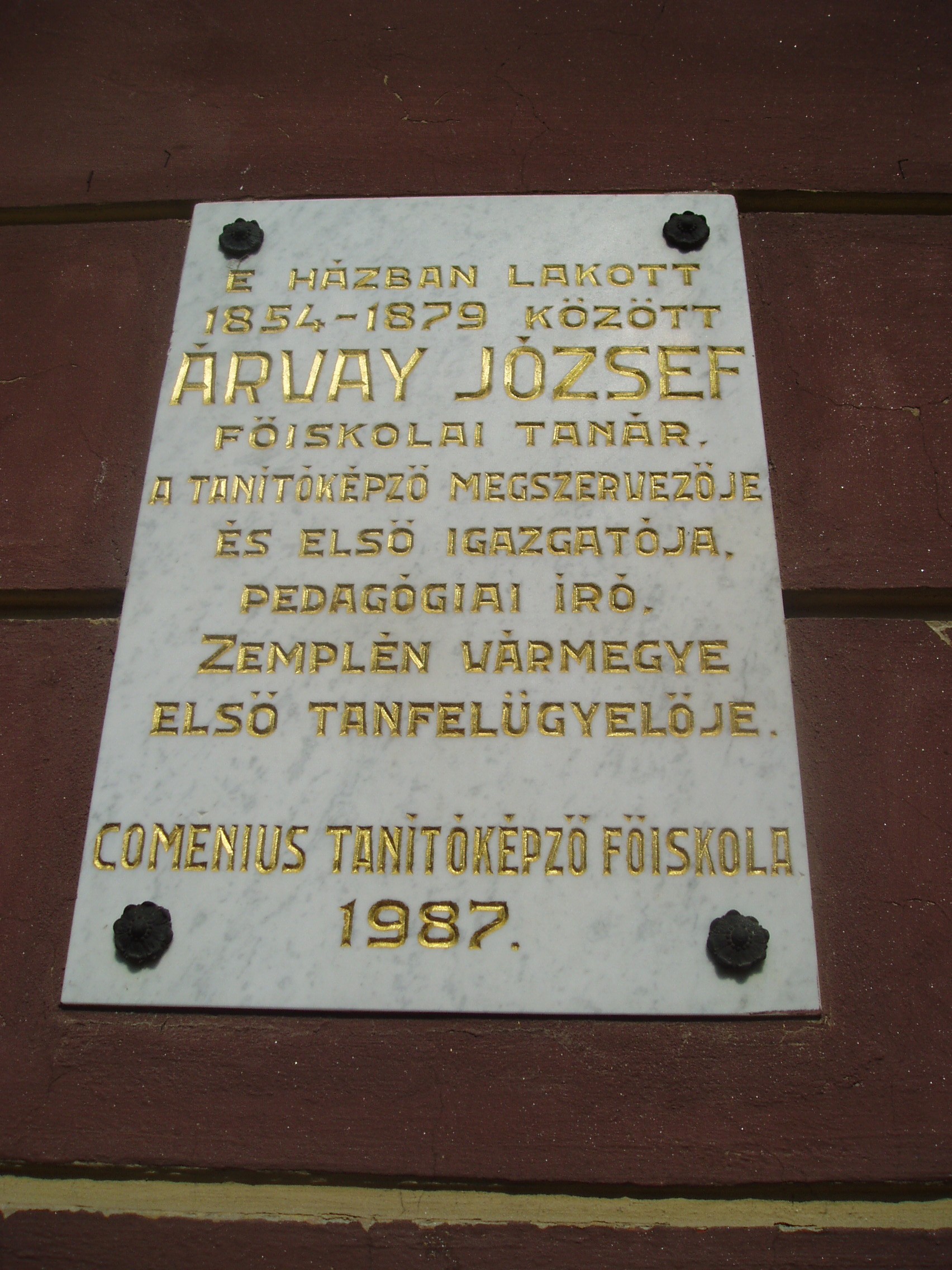 Nyilvános 1119 | 1635 | Sárospatak, Rákóczi utca 12. | A műemlék jellegű lakóház a XIX. század első felében épült későbarokk stílusban. 1854 és 1879 között itt lakott Árvay József (1823-1879) matematika szakos főiskolai tanár, korábbi pataki diák. Ő volt az 1859-ben felállított taítóképző intézet első igazgatója és Zemplén vármegye első tanfelügyelője. Tankönyvírással is foglalkozott. A fénykép 2007 augusztusában készült. Felh. irod.: www.wikipedia.org |