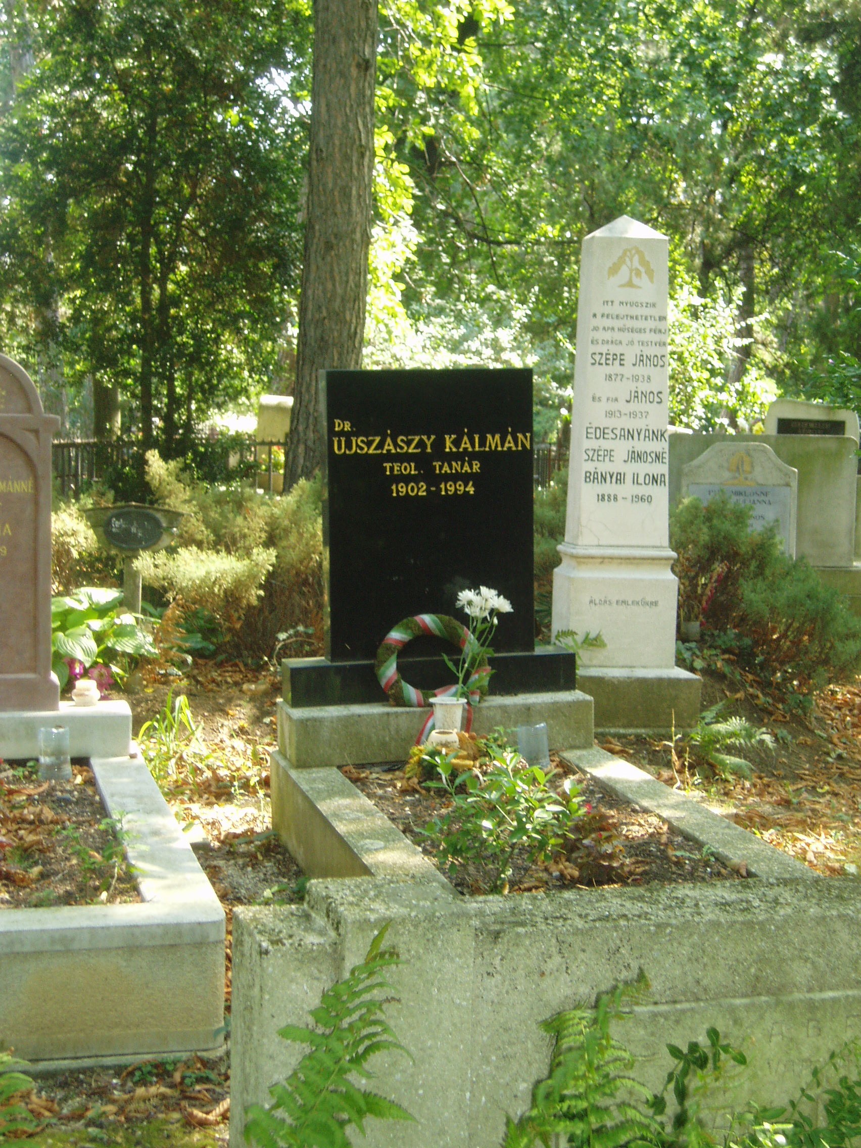 Nyilvános 1230 | 4958 | Sárospatak, Vörösmarty utca: Református temető. Gulyás József sírja | A reformátusok 1780-ban megnyitott temetőjében a Református Kollégium (lásd: Sárospatak, Rákóczi u. 1.) számos kiváló professzora nyugszik. Itt van Újszászy Kálmán sírja is is. Újszászy Kálmán Budapesten született 1902. december 13-án; a gimnáziumot is a fővárosban végezte el. 1921-től a sárospataki teológiára járt, 1931-ben ott lett teológiai akadémiai tanár, ezt megelőzően egy-egy évig Glasgow, Basel, Athén protestáns tanintézeteinek hallgatója volt. A pataki teológián a filozófiai-pedagógiai tanszéket vezette, 1932-ben filozófiai doktorátust szerzett Debrecenben, 1939-ben Szegeden egyetemi magántanári képesítést nyert A falunevelés szellemi alapjai című értekezésével. 1931-től a Sárospatakon kibontakozó faluszeminárium, 1936-től a népfőiskola egyik irányítója, 1944-1946 között a főiskola rektora volt. A népfőiskola 1948-ban - kényszerűen - megszűnt, a református intézmények közül a tanítóképzőt 1950-ben, a gimnáziumot 1952-ben államosították. 1951-ben megszüntették a teológiát is, amely 1992-ben kezdte meg újra a működést. Újszászy professzor 1948 után a kollégium főkönyvtárosa, 1951-től a Tiszáninneni Református Egyházkerület Tudományos Gyűjteményeinek szervezője, 1952-től a Magyarországi Református Egyház zempléni egyházmegyéjének gondnoka, 1964-től 1990-ig pedig a Tiszáninneni Egyházkerület főgondnoka volt. Egykori lakását (lásd: Sárospatak, Kazinczy u. 11.) emléktáblával jelölték meg. Ebben a temetőben nyugszik Cs. Szabó László (1905-1984). Életrajzilag nem kötődött Patakhoz, de végakarata az volt, hogy itt nyugodhasson. Londoni könyyvtárát is a Kollégiumnak adományozta (lásd: Sárospatak, Rákóczi u. 1. Repositorium). (Sajnos, amikor ott jártam, se az ő, se Erdélyi János professzor sírját nem találtam meg - K.K.). A fénykép 2007 augusztusában készült. Felh. irod.: Látnivalók Borsod-Abaúj-Zemplén megyében. Miskolc, Well-PRess, 1995 Benda Kálmán beszélgetése a 90 esztendős Újszászy Kálmánnal. = Confessio 1993. 3. |