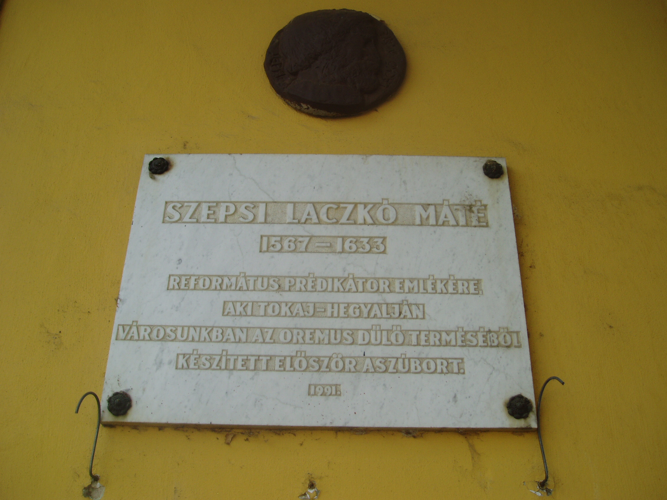 Nyilvános 1131 | 1667 | Sátoraljaújhely, Kossuth tér 24. | A város fő terének egyik szép, régi épületén elhelyezett emléktábla szerint elsőként Sátoraljaújhelyen készített tokaji aszút 1631 körül Szepsi Laczkó Márton (1567-1633) református prédikátor, Lórántffy Zsuzsanna udvari lelkésze a fejedelemasszony számára az Oremus dűlő terméséből. A hagyomány szerint az országot érő támadások miatt későn szüretelt szőlő tartalmazott olyan „beteg” szőlőszemeket is amelyeket ma az aszú készítéséhez használnak. Az elkészült, miseborként is használt italban fedezte fel Szepsi Laczkó Máté a különleges ízvilágot és ajánlotta fel a bort a fejedelemasszonynak. Az aszú készítésének első leírását is neki tulajdonítják. A hagyománynak azonban ellentmond, hogy már az 1590-es években - Szikszai Fabricius Balázs latin–magyar szótárában - használták az „aszú szőlő” kifejezést. A fénykép 2007 augusztusában készült. Felh. irod.: www.tokaj.hu/magyar/atokaji/az-aszu/index.php |