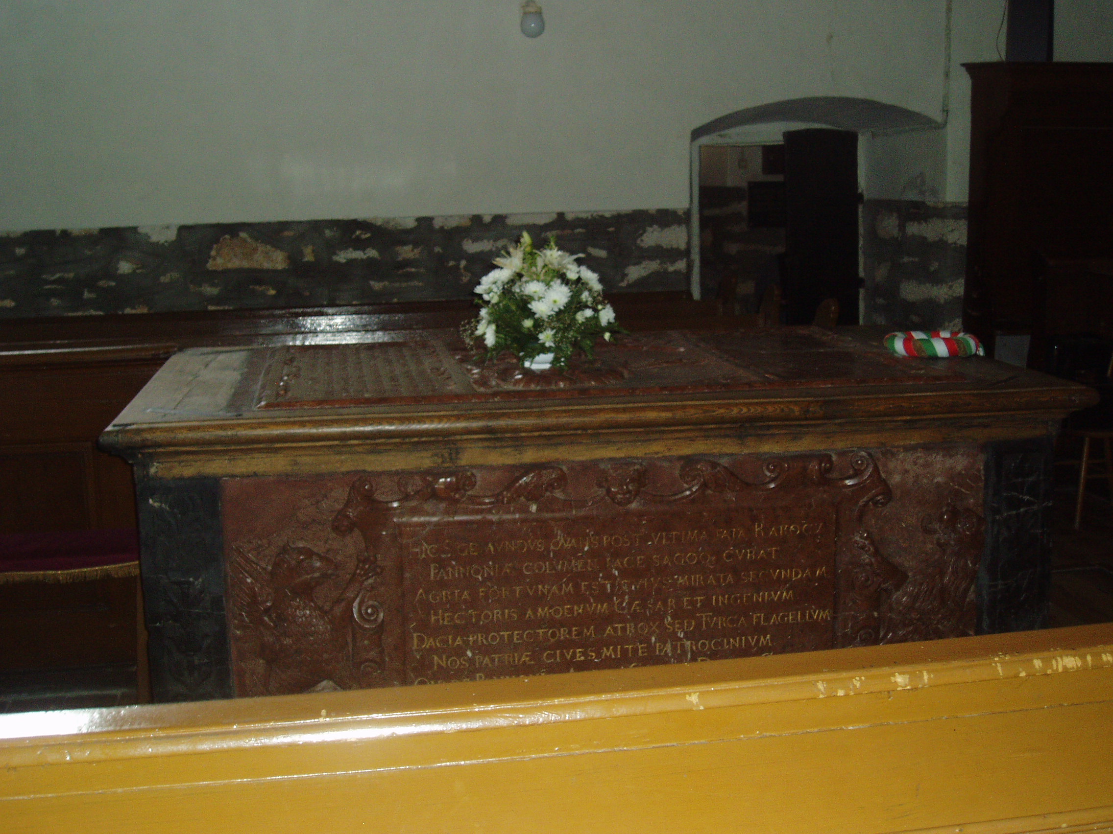 Nyilvános 957 | 1671 | Szerencs, Kossuth tér 4. Református templom - Rákóczi Zsigmond tumbája | Szerencs legrégibb temploma a XIII. században épült eredetileg román stílusban. Az épületet 1480-ban átalakították, ekkor készült a középen álló gótikus torony. Az épületet gótikus támpillérek fogják körül. A templomot 1595-ben adományozta Rákóczi Zsigmond református hittársainak, az ő támogatásával jelentős átalakításokat is végeztek rajta. A templom nemcsak építészetileg nevezetes, hanem jelentős történelmi emlékhely is. 1605-ben az e falak között tartott országgyűlésen választották Bocskai Istvánt Magyarország fejedelmévé. A templom hajójában található Rákóczi Zsigmond (1544-1608) címerrel ékesített vörös márány szarkofágja (tumbája), amelyet 1618-ban a fejedelem három fia, György (1630-tól erdélyi fejedelem), Zsigmond és Pál készíttetett. A síremlék tetején levő latin szöveg fordítása: "Tekintetes és nagyságos felsővadászi Rákóczi Zsigmond, Borsod vármegye főispánja, a magyar király néhai lefőbb tanácsosa, először Szendrő, azután pedig Eger kapitánya és Erdély fejedelme, a magyarországi részek ura és a székelyek ispánja számára állíttatott jeles címer, akinek erénye gyakrabban híresedett el Magyarországon legnagyobb örvendezések közepette. Aki meghalt az ő kegyeletes szülőhelyén, Felsővadászon az 1608. évi december hó 5-én, midőn innen-onnan 64 évig élt. Három gyászoló fia: Rákóczi György , Zsigmond és Pál az ő legkedvesebb édesatyjuknak, aki irántuk és a haza iránt jól érdemesült." A szarkofág nyugati oldalán a következő felirat olvasható: "Tebenned reméltem Uram, hogy nem leszek porrá mindörökké! " A déli oldalon Miskolczi Csulyak István prédikátor verse őrzi Rákóczi Zsigmond emlékét: "Itt nyugszik végső lehelete után a békében és háborúban győzedelmes Rákóczi zsigmond, Magyarország oszlopa, akinek Eger csodálta szerencséjét, a császár fővezérének kies lángelméjét is, Erdély oltalmazóját, a kegyetlen török pedig ostorát, mi honfiak az ő kegyes atyai indulatát. Azért Magyarország, Eger, császár, honfiak, érdemihez illően fizessetek könnyeitekkel a haza atyjának." A síremlék alatt egy deszkaajtó felnyitása után lehet lejutni a kriptába. Ott található a fejedelem földi maradványait őrző urna, amelyet 1849-ben kapott adományul a város a X. zászlóalj tisztikarától. Bár 1644-ben, amikor Esterházy Miklós nádorispán csapatai megrohanták és kifosztották Szerencset, meggyalázták a fejedelem síremlékét is, Rákóczi Zsigmond koponyája megmaradt, s ma a kriptában egy kőurnában őrzik. Bizonyítéknak a koponyán található gyógyult fejsérüléseket tekintik, amelyeket az itt eltemetett személyek közül egyedül a fejedelem kaphatott. 1855. október 19-én járt a templomban, zempléni kirándulásuk alatt Arany János és Tompa Mihály. Arany a következőket írta levélben egy barátjának: "Szerencsen egy Rákóczi korabeli templomban láttuk Rákóczi Zsigmond fejedelem czímeres és feliratos márványravatalát.” A fénykép 2007 augusztusában készült. Felh. irod.: Tájékoztató feliratok a templomban www.szerencs.hu http://tokaj-turizmus.wplanet.hu/irodalmiut |