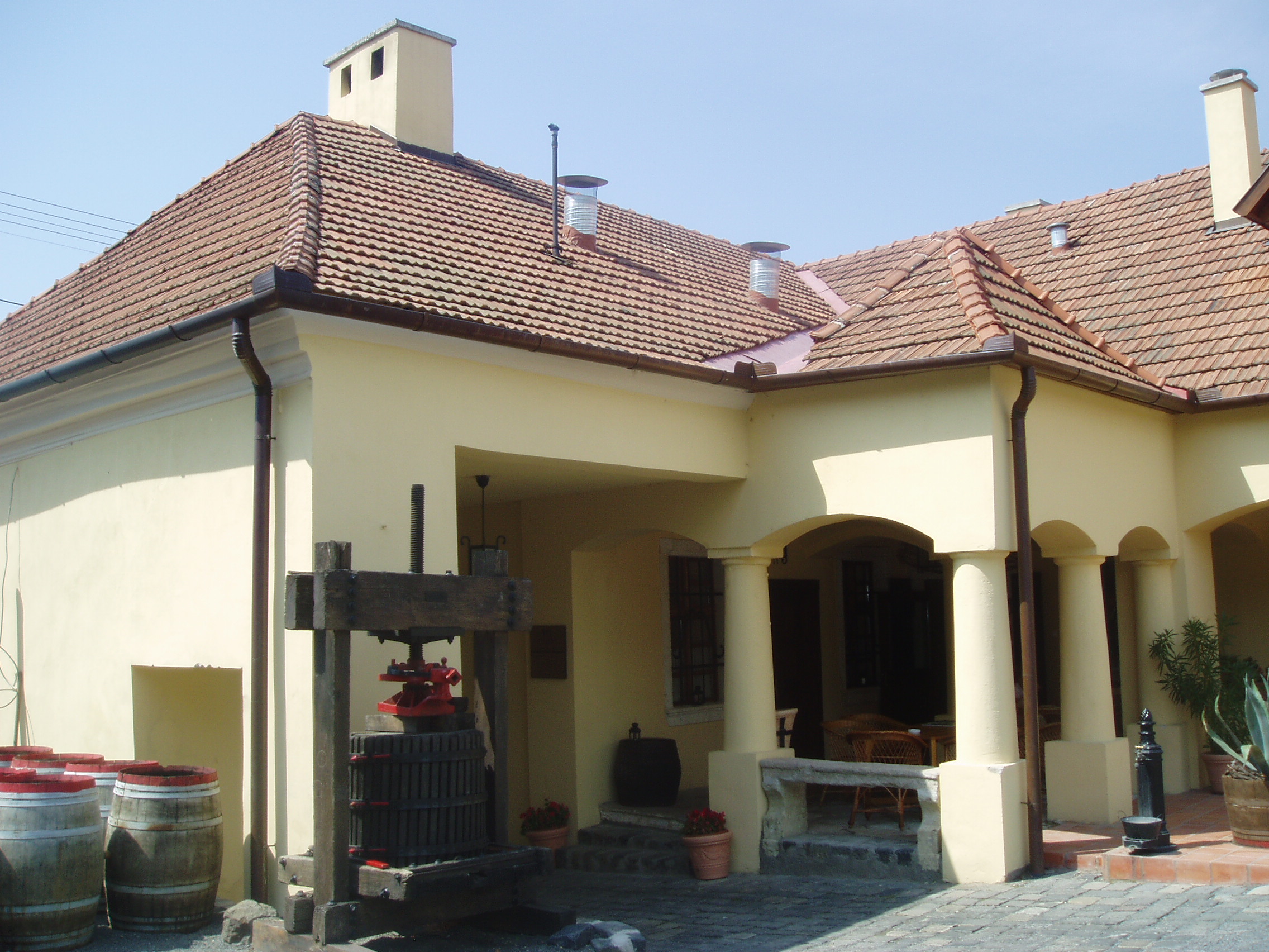 Nyilvános 1174 | 1819 | Tállya, Rákóczi utca 23. Szirmay-kúria | Tállya főutcája a felvidéki építészeti stílust őrzi, kőből épített boltíves kapui ma is szinte változatlan formájukban láthatók. Az egykori Szirmay-kúria épülete már négy évszázadra tekint vissza. 1771 körül a neves osztrák építész, Franz Anton Hillebrandt alakította át és bővítette ki a nemesi Szirmay família birtokközpontját. Szárnyas tölgyfa kapuján a hajdani címert oroszlánfejes kopogtatók szimbolizálják. A patinás épületben 2006 óta működik az Oroszlános Borvendéglő. A kúria jelenlegi újjáépített valóságában is történelmi korokat idéz: polgári kultúrájával, hegyaljai stílusával a község talán legpatinásabb képét adja. A bejárati nagykaput díszítő oroszlánfejes kopogtatók, a Hillebrandt stílusjegyeit viselő árkádsoros belső udvarrész, valamint a boltozatos tornác máig az épület ékességei. A fénykép 2007 augusztusában készült. Felh. irod.: www.apsus.eu/index.php?page=oroszlanos |