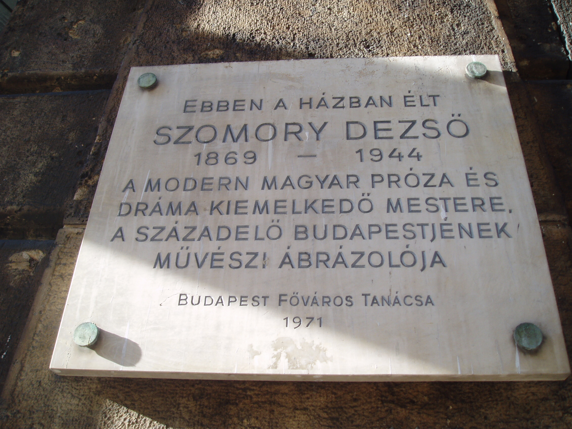 Nyilvános 1271 | 1861 | Budapest, V. Sütő utca 2. | Az e ház padlásterében kialakított hatalmas, egyterű lakásban élt Szomory Dezső 1906-tól 1930-ig. Sok jeles művét írta itt, többek között Hermelin című, önéletrajzi ihletésű színművét, amelynek a helyszínekről szóló szerzői utasításai egyértelműen saját lakását írják le: "És az ablakon át, ha felhúzzák a függönyt, a város háztető- és kéményrengetege látszik, egy-egy templomtorony arany csúcsával a végtelen égboltozat alatt. Mert ez itt egy padlásból épült lakás, amit a dimenziók sejtetnek is. És egészen közelről hallani a templomi harangszót..." Ez a nevezetes lakhely ihlette Kellér Andor Szomory Dezsőről írott regényének címét: Író a toronyban. A lakás részletes leírását e műben is olvashatjuk. Az író emléktábláját 1971-ben avatták fel. A fénykép 2007 májusában készült. Felh. irod.: Réz Pál: Szomory Dezső alkotásai és vallomásai tükrében. Bp. Szépirodalmi Kiadó, 1971 |