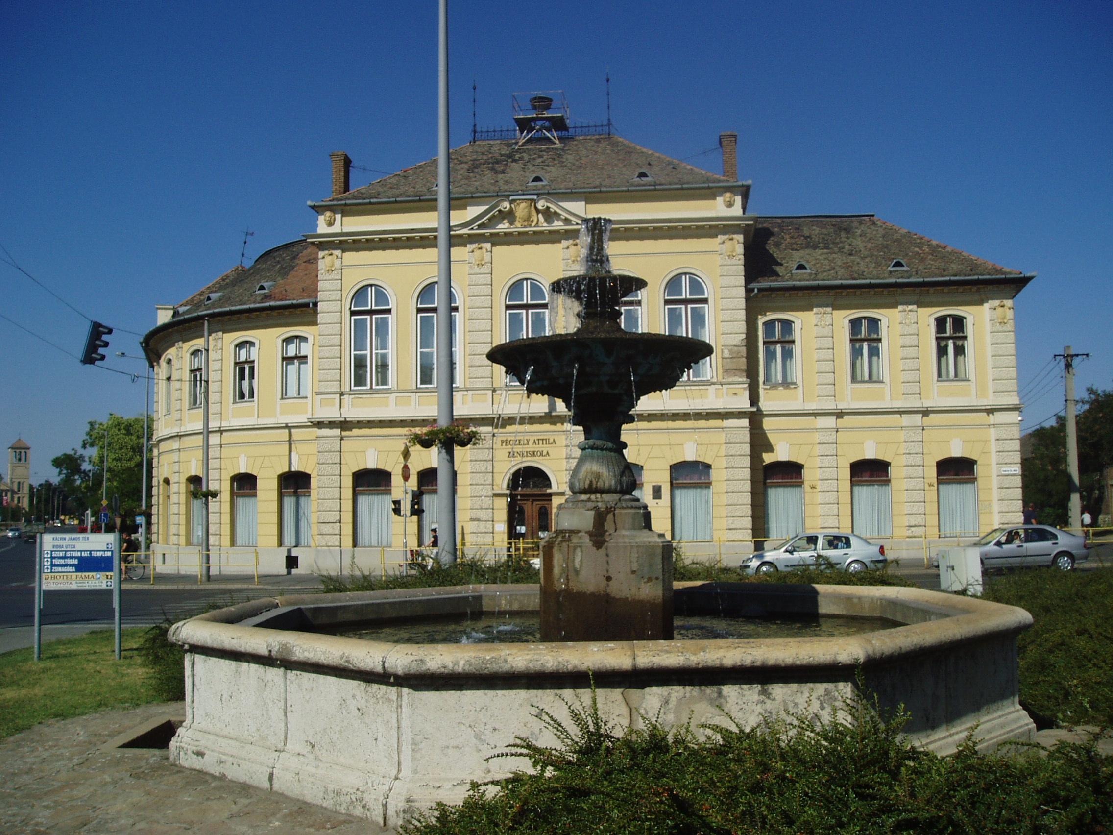 Nyilvános 1573 | 3306 | Hódmezővásárhely, Kálvin tér 4. | Az impozáns, eklektikus és reneszánsz jegyeket hordozó középület eredetileg a zsidó hitközség székháza volt. 1893-ban kezdték építeni Petrecz Pál tervei szerint. Benne a hitéleti helyiségek mellett 1894-ben nyílt meg a Központi szálloda, ám a helybeliek inkább "zsidó kávéháznak" nevezték a sok kulturális rendezvénynek otthont adó épületet. A zsidóság deportálása után leventeotthonként, majd MADISZ székházként funkcionált. 1957-ben költözött ide a városi zeneiskola, amely ma a kiváló, évtizedeken át Vásárhelyen élt orvos-népzenekutató-muzeológus Péczely László nevét viseli. Az épület előtt, a Kálvin tér közepén Nagy András János kútja áll. Az öntöttvas díszkút lefelé nagyobbodó tányérjaival a toszkán kutakat idézi. Ez az Alföld egyik legrégibb kútja, 1884-ben fúrta Zsigmondy Vilmos elgondolásai alapján Zsigmondy Béla. Mint a talapzatán elhelyezett táblán olvasható, a kút költségeit egy helybeli házaspár állta. A kút több, mint 250 méter mély, borovi fenyőből készített csövén hajdan 694 liter víz jött fel percenként. Miután fokozatosan elapadt, a városi vezetékre kapcsolták. A fénykép 2007 júliusában készült. Felh. irod.: Barangolások Csongrád megyében. Miskolc, Well-PRess, 1997 /Vendégváró/ Arató László - Batyi Zoltán: Hódmezővásárhely az alföldi művészváros. Hódmezővásárhely, 2004 |