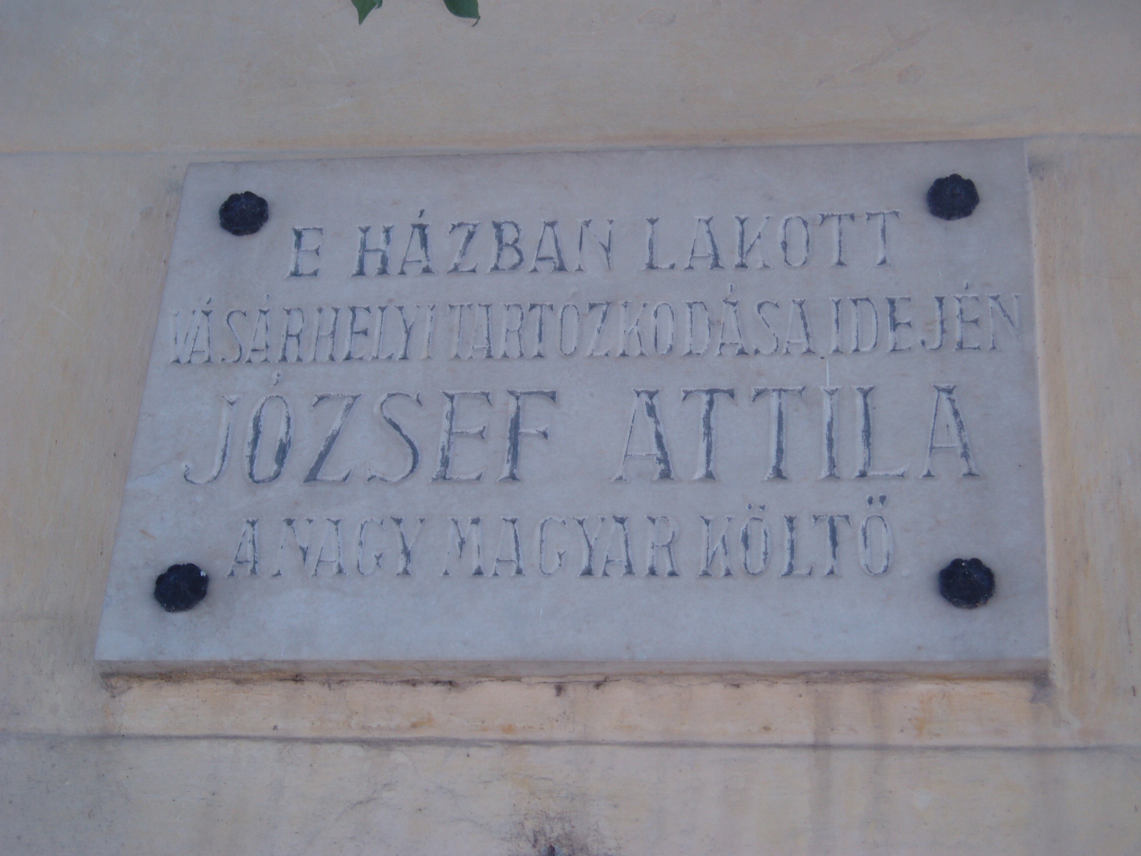 Nyilvános 1206 | 1732 | Hódmezővásárhely, Szántó Kovács János utca 28. | Ebben a házban lakott az 1930-as évek elején Makai Ödön, József Attila gyámja és sógora. Lakásukban többször megfordult a fiatal költő: 1934-ben itt dolgozott válogatott versein, amelyek Medvetánc címen jelentek meg. Makaiék később átköltöztek a város villanegyedébe (lásd: Hódmezővásárhely, Ady u. 4.). Az épületen József Attila és az egykor szintén ebben a házban élt Nagy György ügyvéd, politikus emléktáblája olvasható. A fénykép 2007 júliusában készült. Felh. irod.: Barangolások Csongrád megyében. Miskolc, Well-PRess, 1997 /Vendégváró/ |
